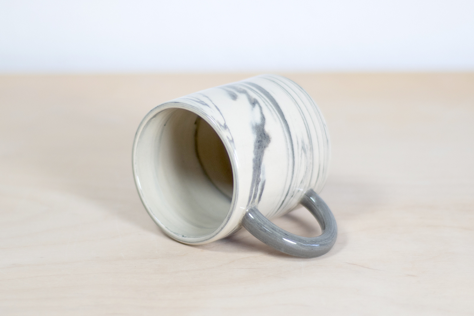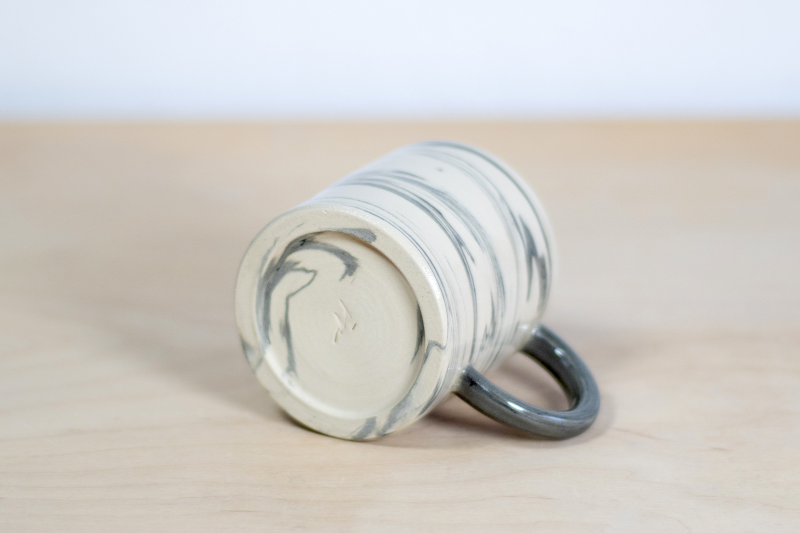 - Kubek ceramiczny o pojemności 150 ml. Wykonany ręcznie na kole garncarskim. Masa w kolorze białym z dodatkiem czarnej masy, tworzącej efektowne przejścia tonalne. Szkliwiony błyszczącym, transparentnym szkliwem.