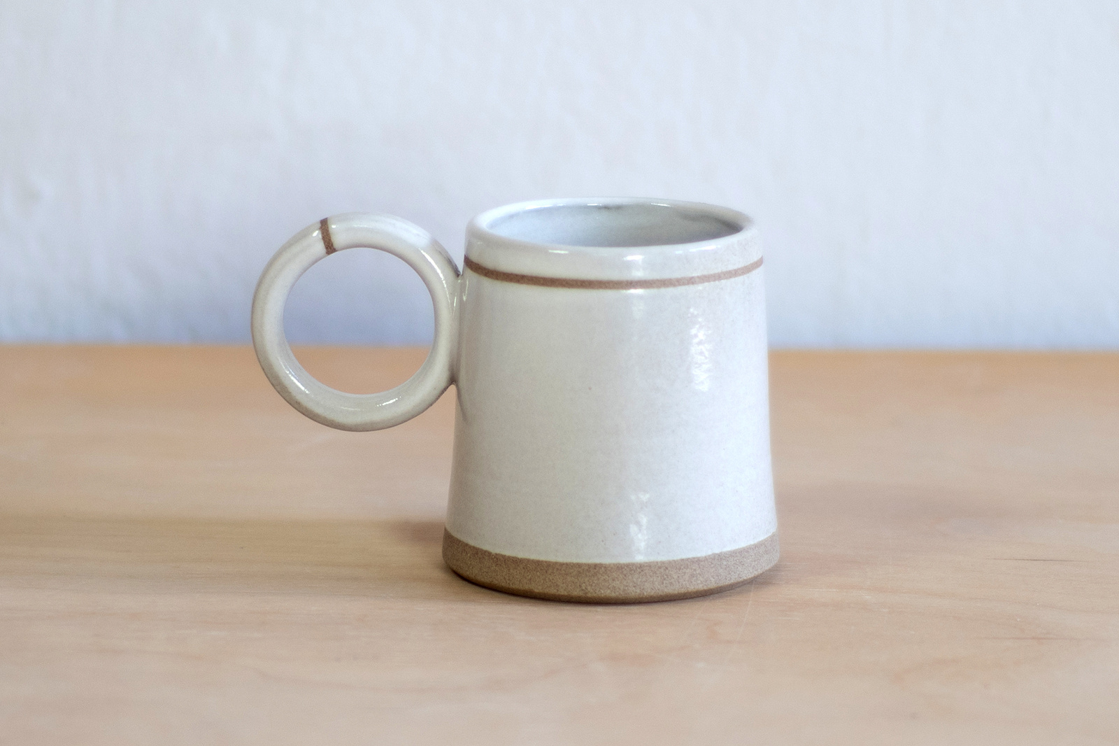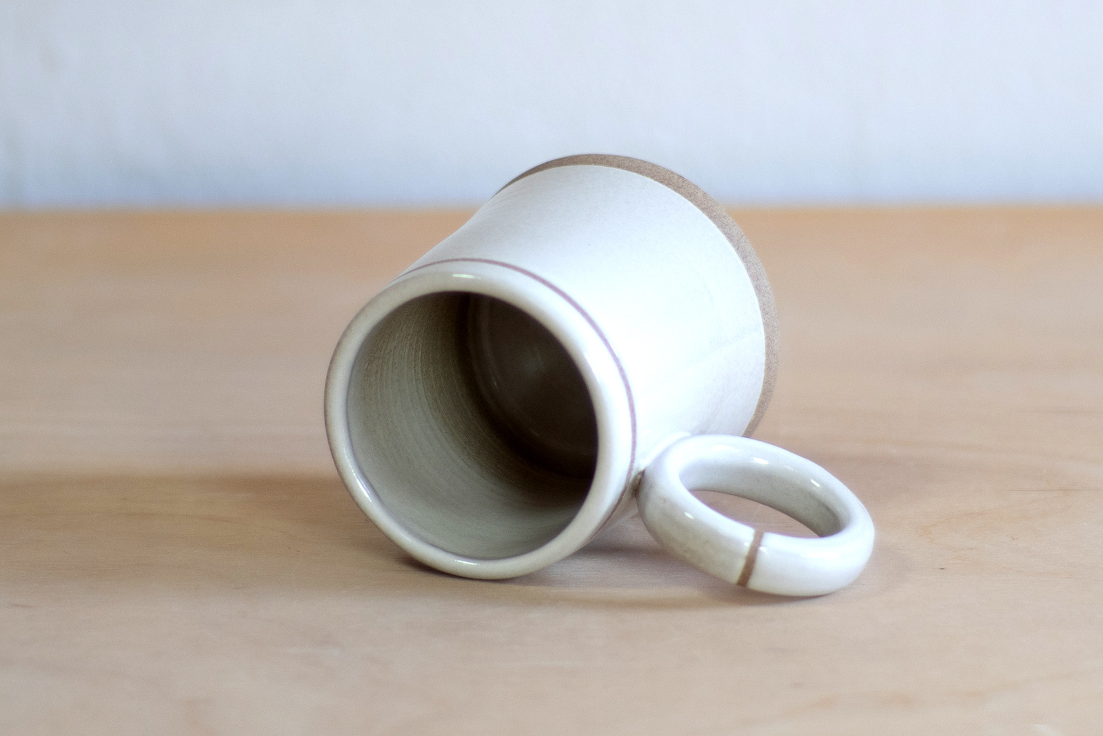 - Kubek ceramiczny o pojemności 150 ml. Wykonany ręcznie na kole garncarskim. Masa w kolorze kremowym. Dekorowany ręcznie szkliwem w kolorze białym, z wybranymi elementami bez szkliwa.