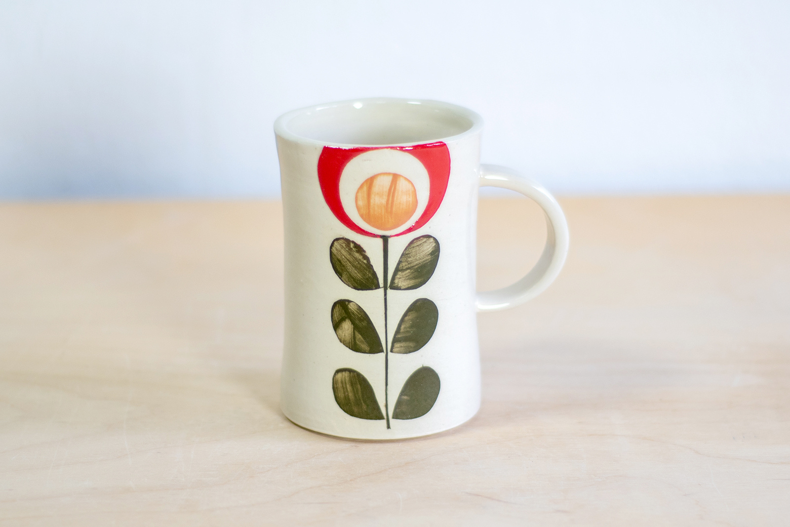 Kubek na kawę. Biały z czerwono-zielonym kwiatem