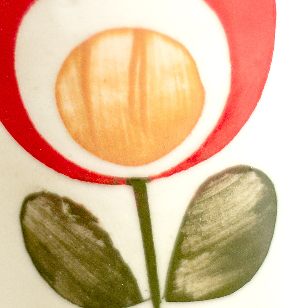 Wykonany ręcznie na kole garncarskim. Masa w kolorze białym, dekorowana wycinanką w kwiaty oraz kolorowymi angobami. Szkliwiony błyszczącym, transparentnym szkliwem. Stemplowany logo autorki.