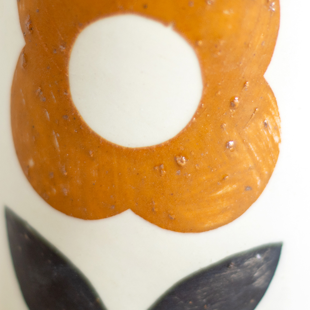 Wykonany ręcznie na kole garncarskim. Masa w kolorze białym, dekorowana wycinanką w kwiaty oraz kolorowymi angobami. Szkliwiony błyszczącym, transparentnym szkliwem. Stemplowany logo autorki.