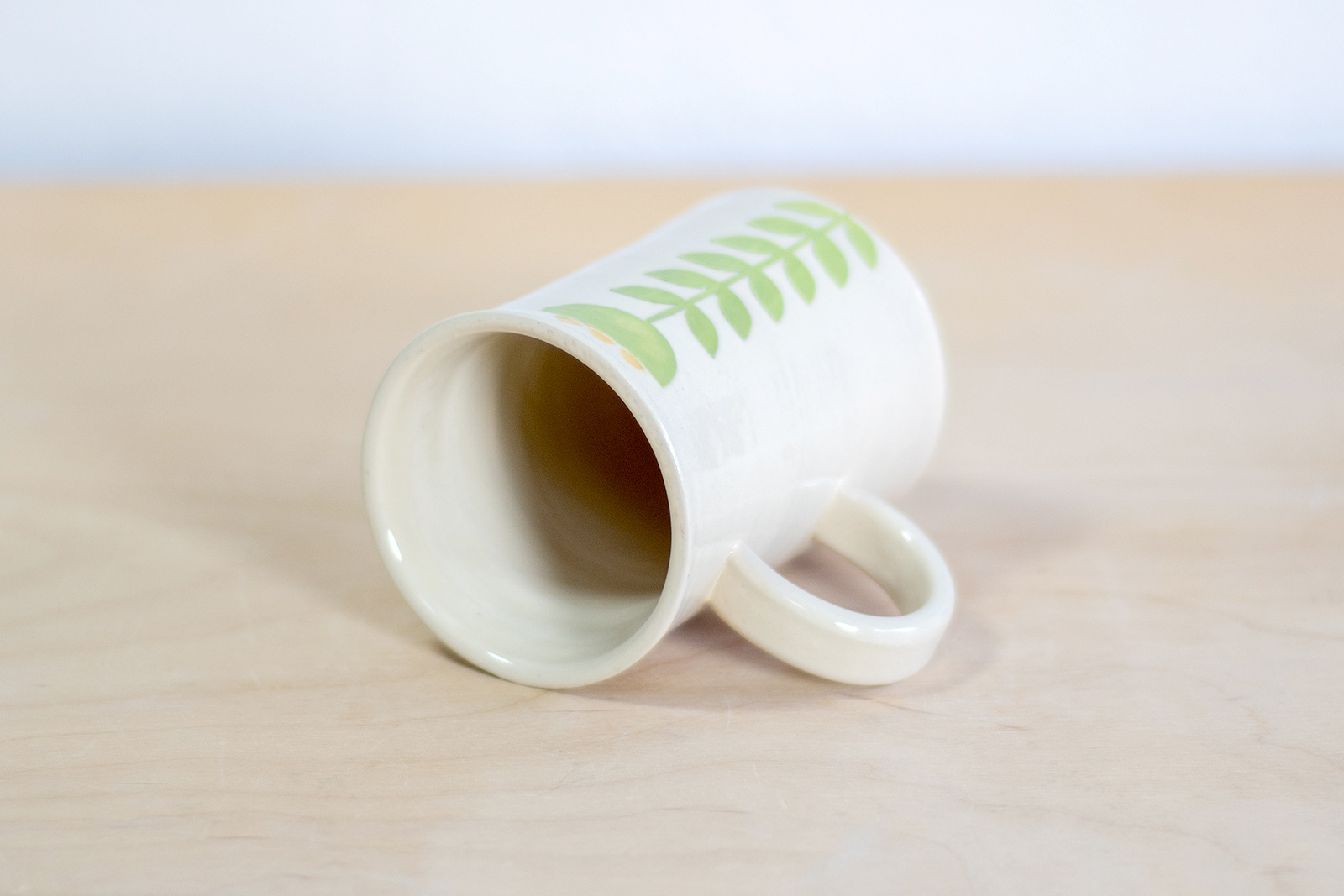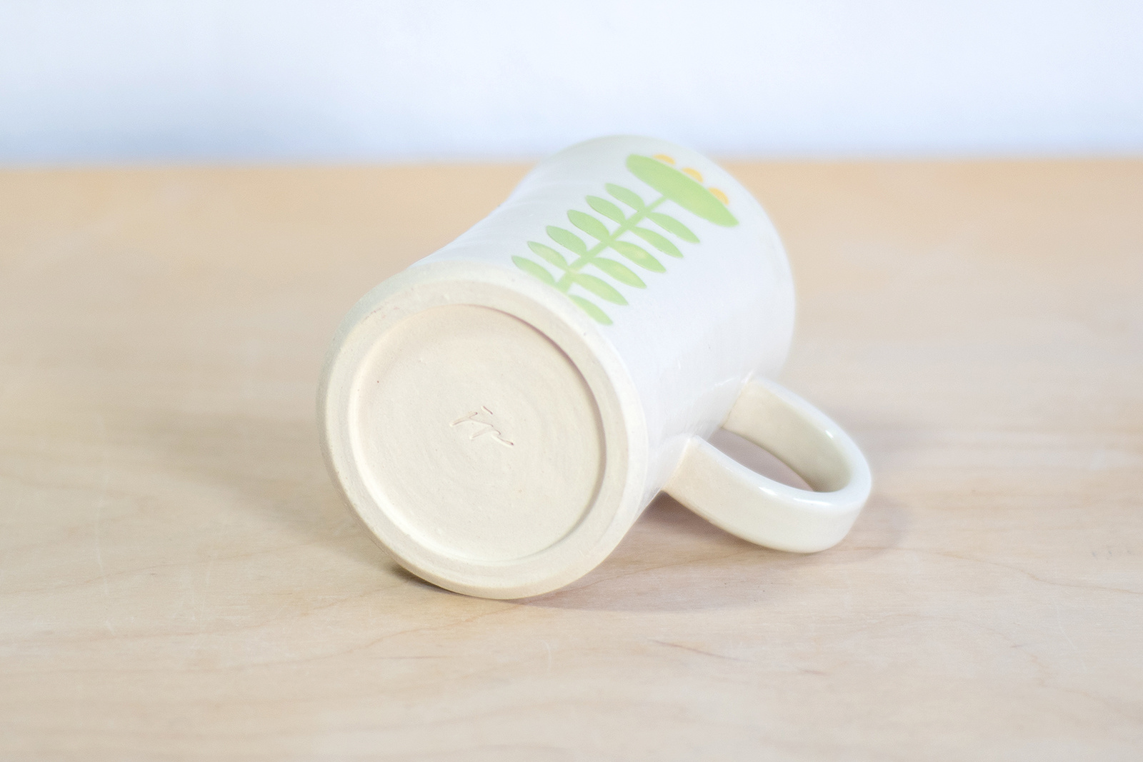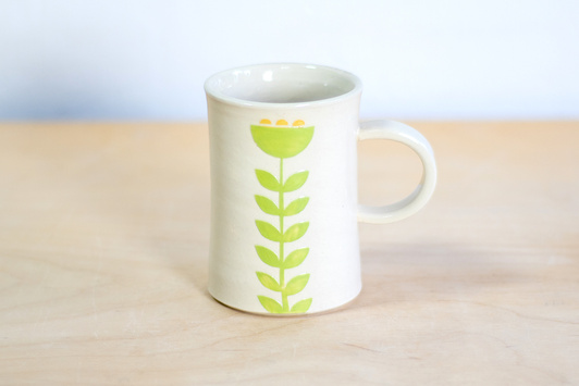 Kubek na kawę. Biały z zielono-żółtym kwiatem