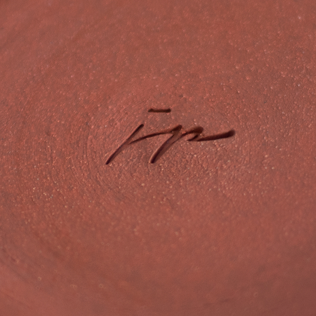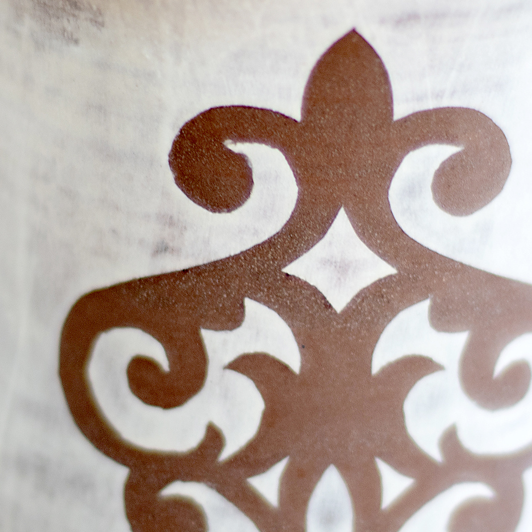 Wykonany ręcznie na kole garncarskim. Masa w kolorze brązowym, dekorowana wycinanką w kwiaty oraz białą angobą. Szkliwiony błyszczącym, transparentnym szkliwem. Stemplowany logo autorki.
