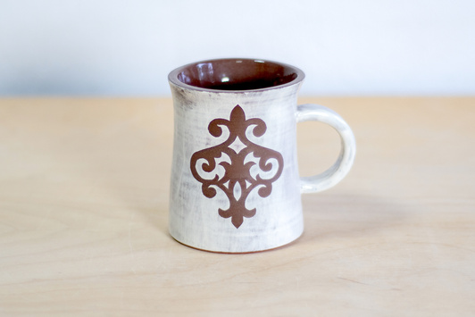 - Kubek ceramiczny o pojemności 200 ml. Wykonany ręcznie na kole garncarskim. Masa w kolorze brązowym, dekorowana wycinanką z ozdobnym dekorem oraz białą angobą. Szkliwiony błyszczącym, transparentnym szkliwem.