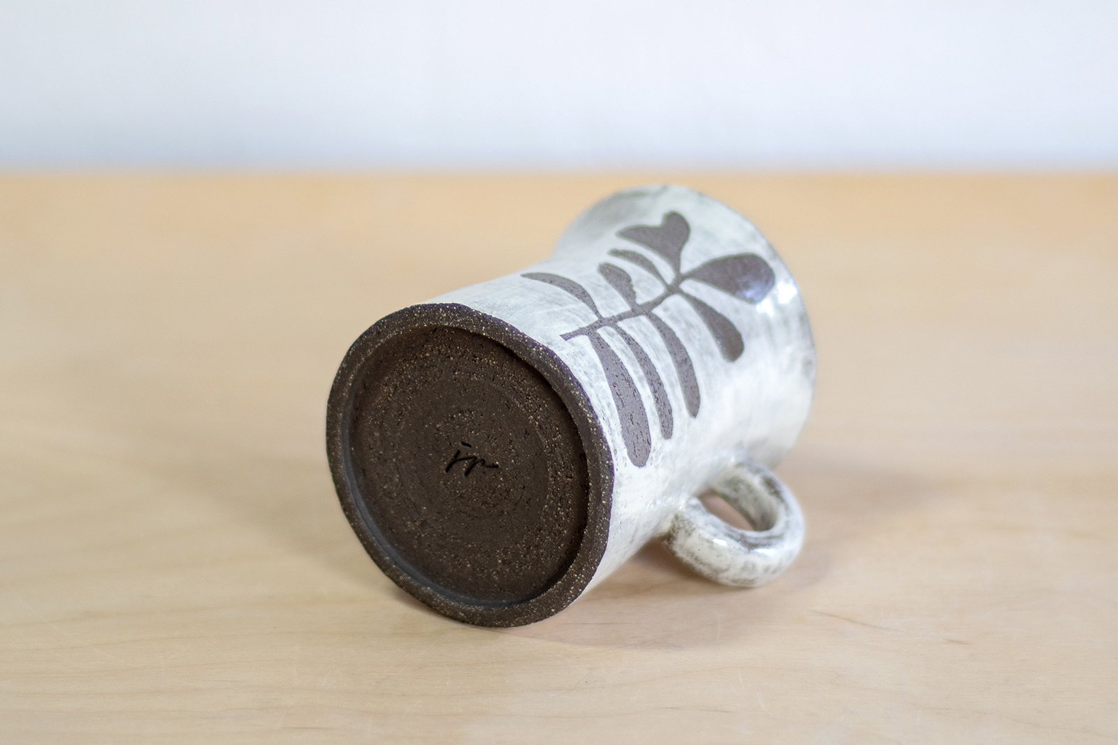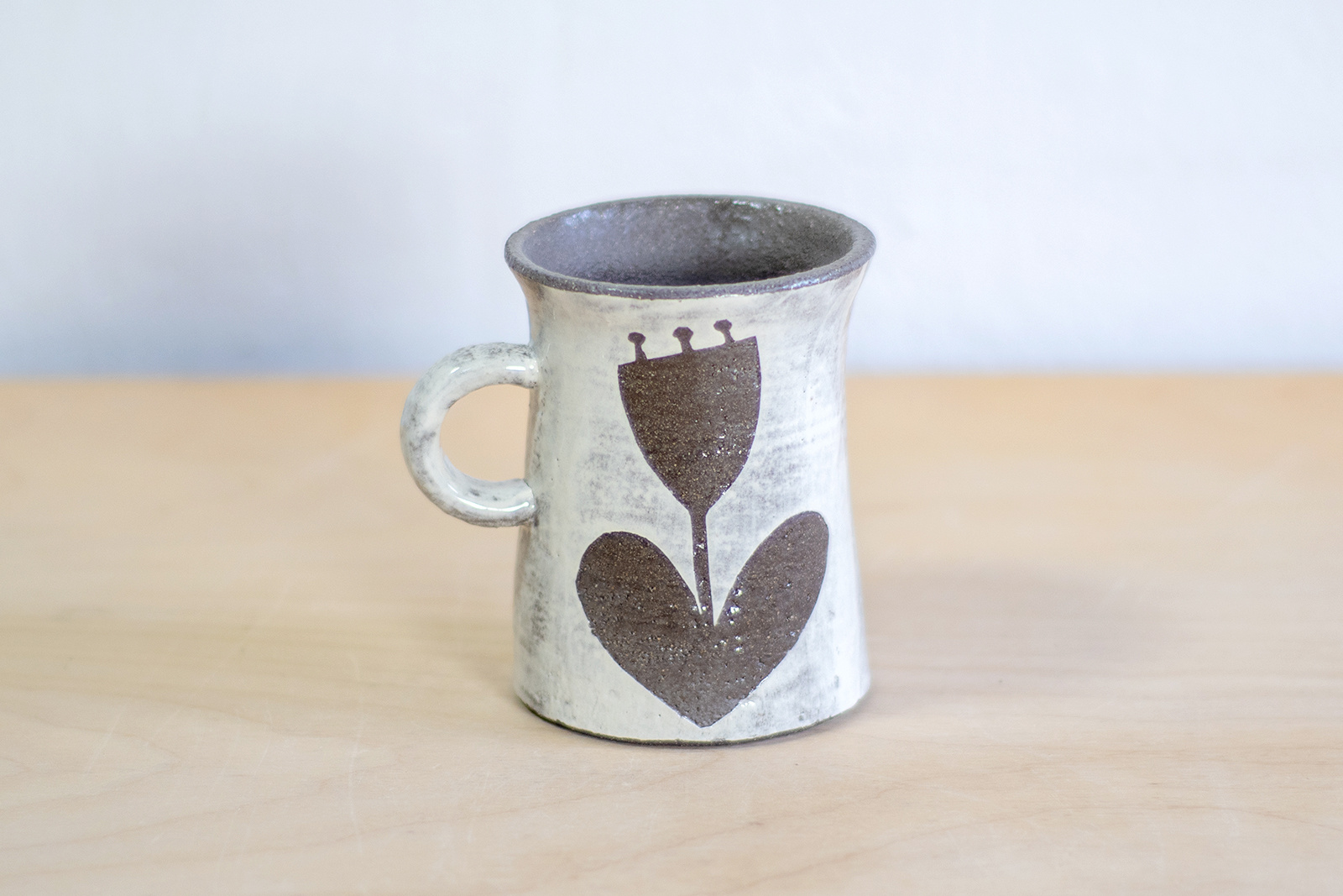 - Kubek ceramiczny o pojemności 200 ml. Wykonany ręcznie na kole garncarskim. Masa w kolorze czarnym, dekorowana wycinanką w kwiaty oraz białą angobą. Szkliwiony błyszczącym, transparentnym szkliwem.