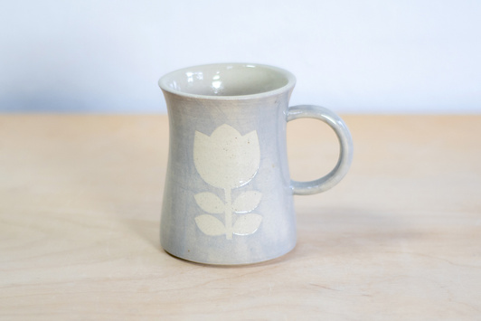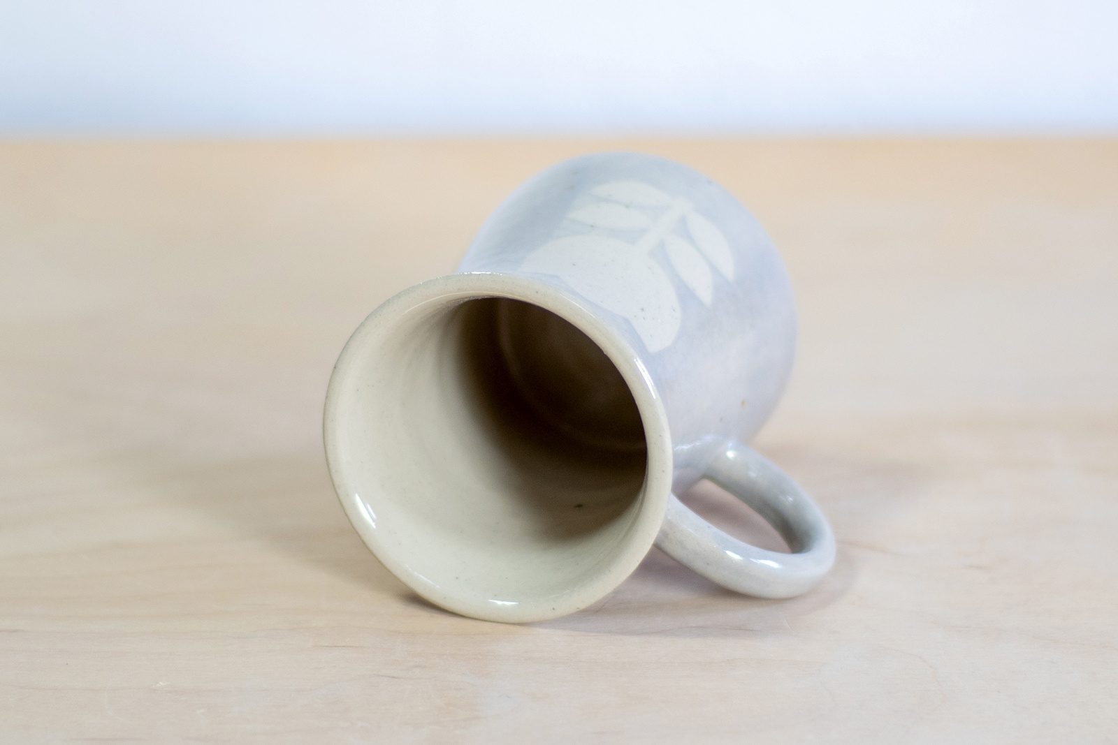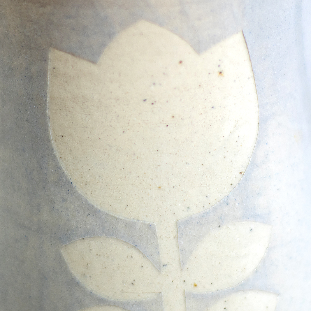 Wykonany ręcznie na kole garncarskim. Masa w kolorze białym, dekorowana wycinanką w kwiaty oraz szarą angobą. Szkliwiony błyszczącym, transparentnym szkliwem. Stemplowany logo autorki.