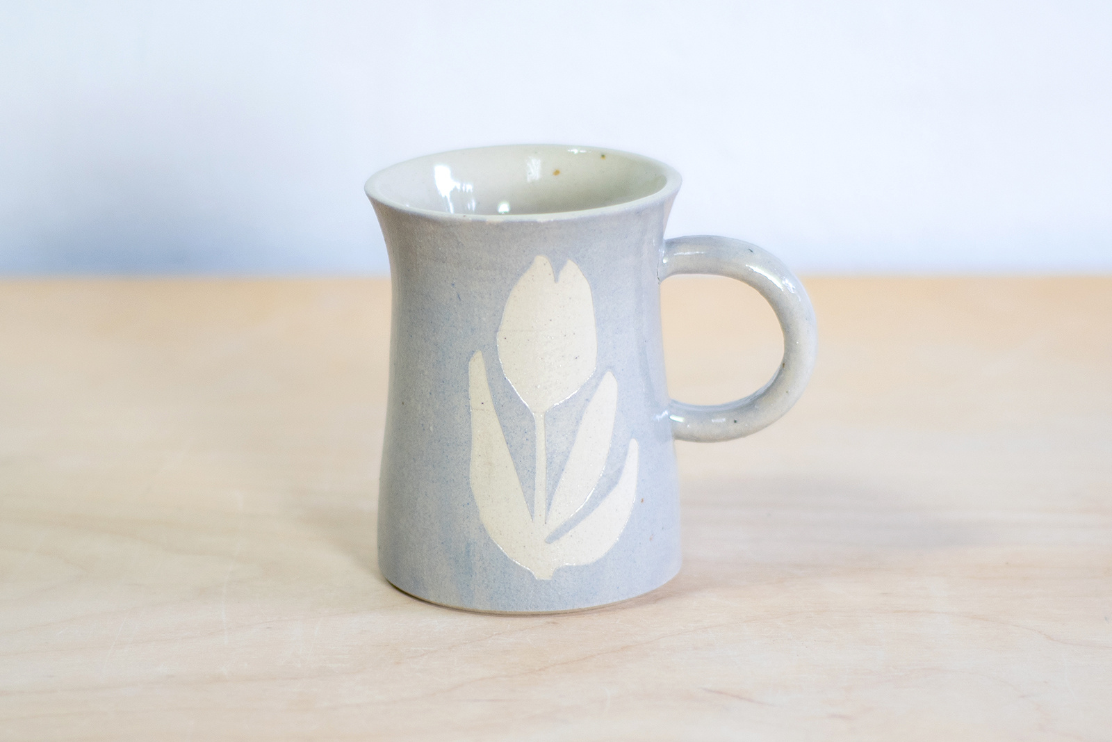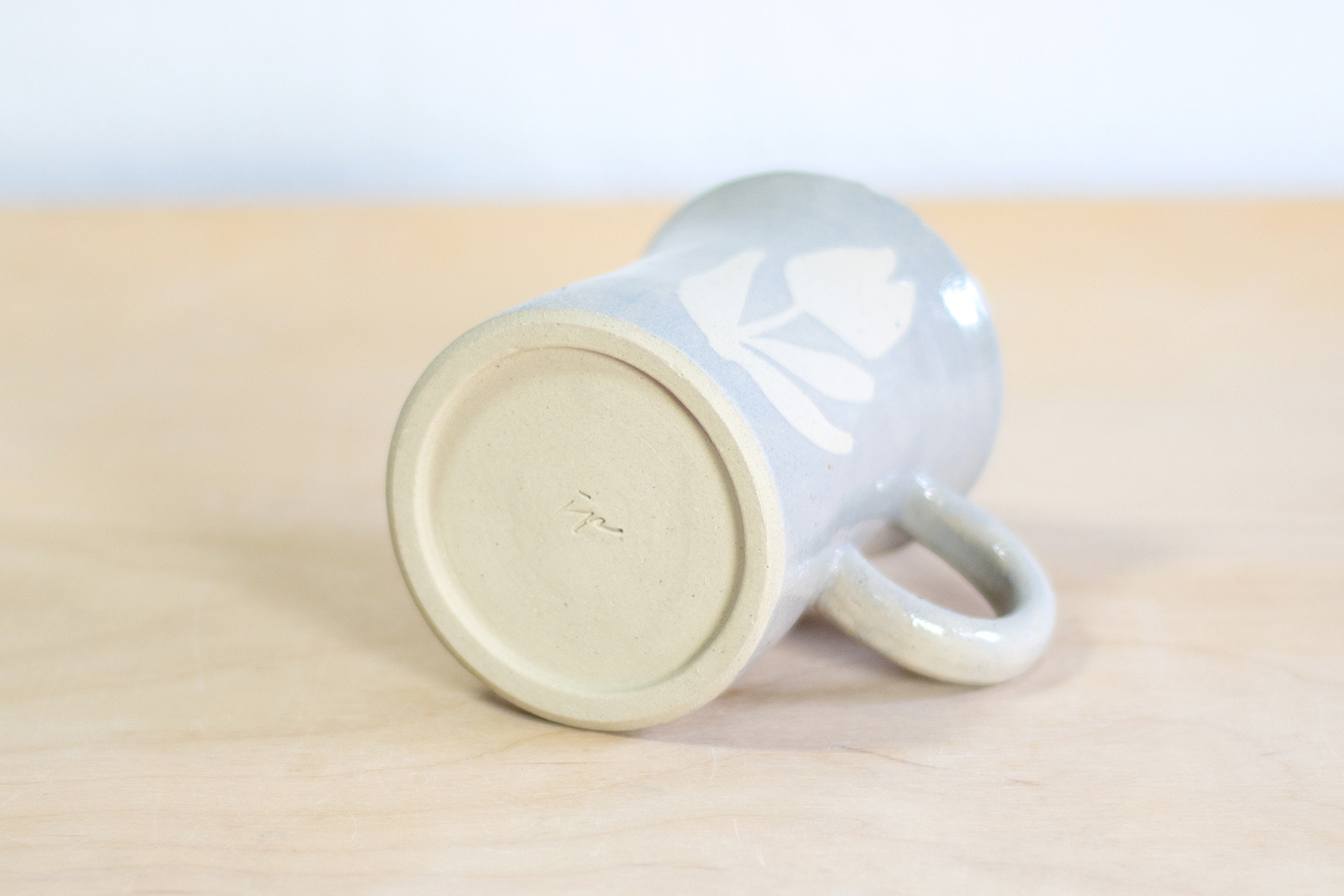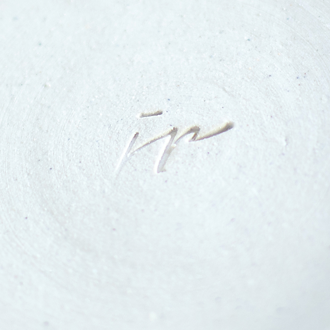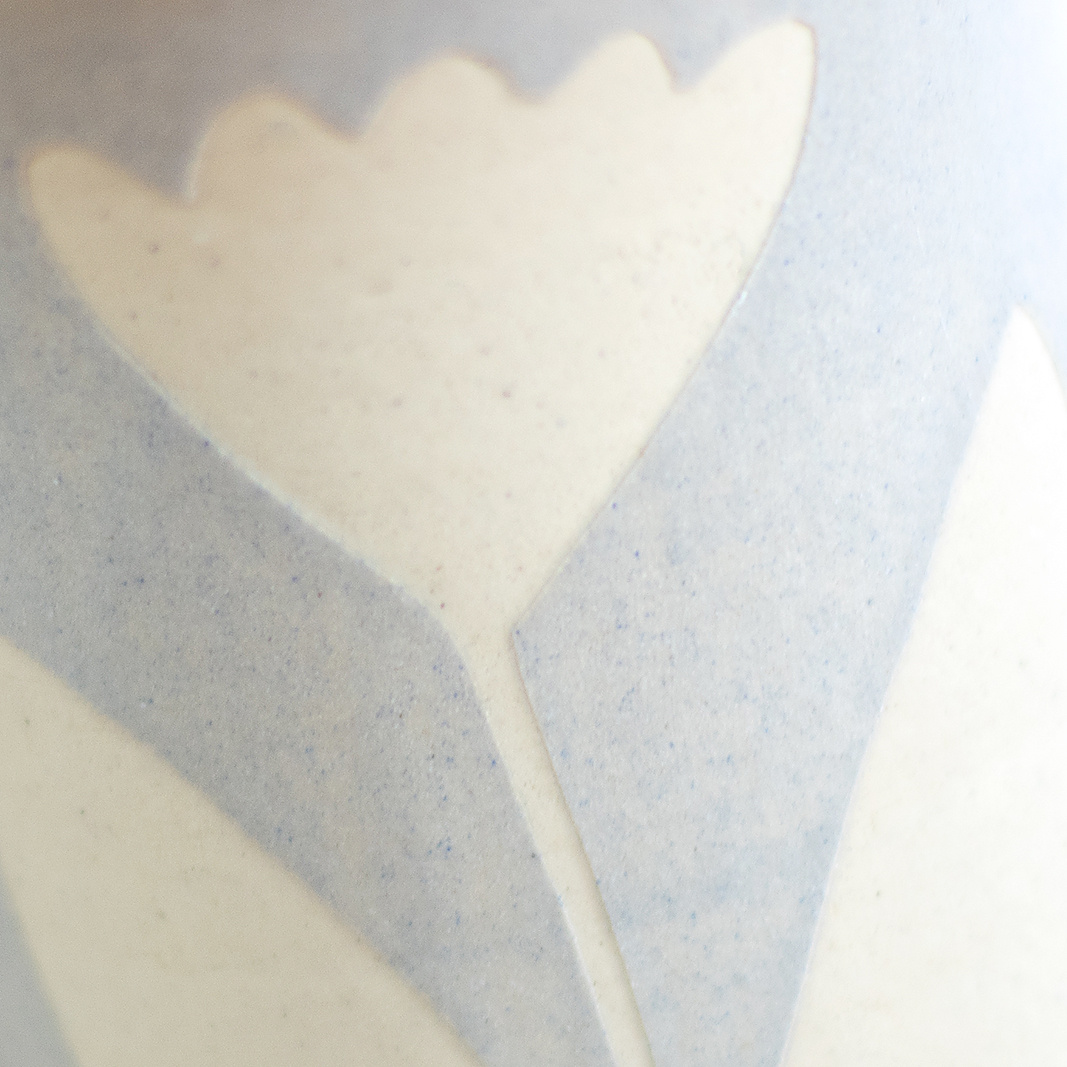 Wykonany ręcznie na kole garncarskim. Masa w kolorze białym, dekorowana wycinanką w kwiaty oraz szarą angobą. Szkliwiony błyszczącym, transparentnym szkliwem. Stemplowany logo autorki.