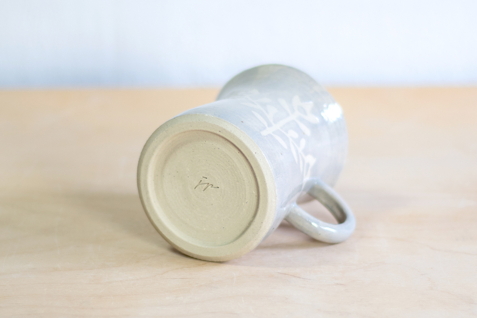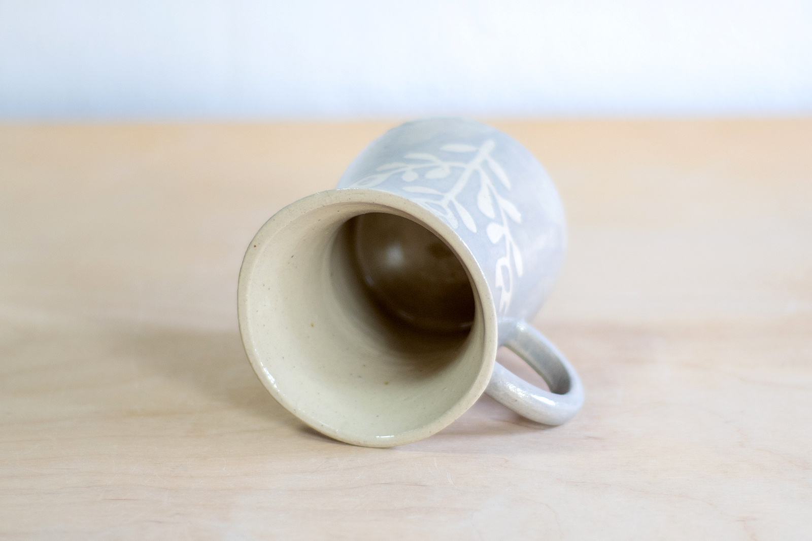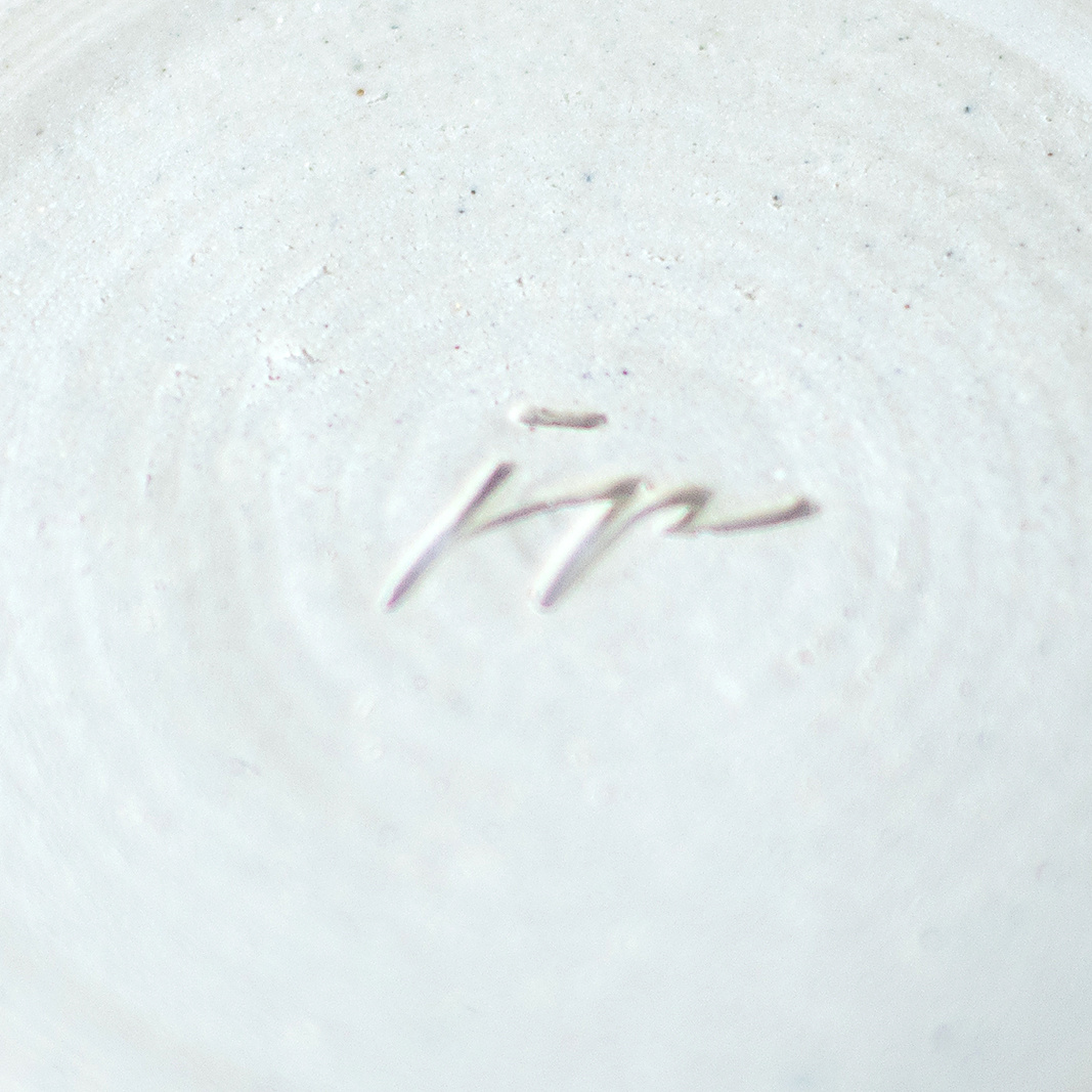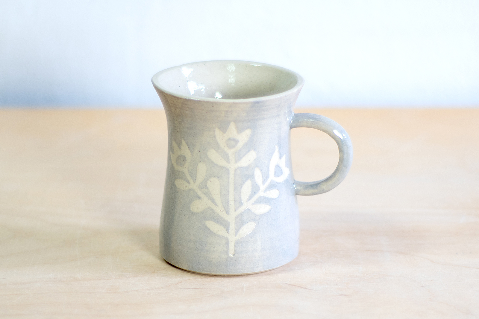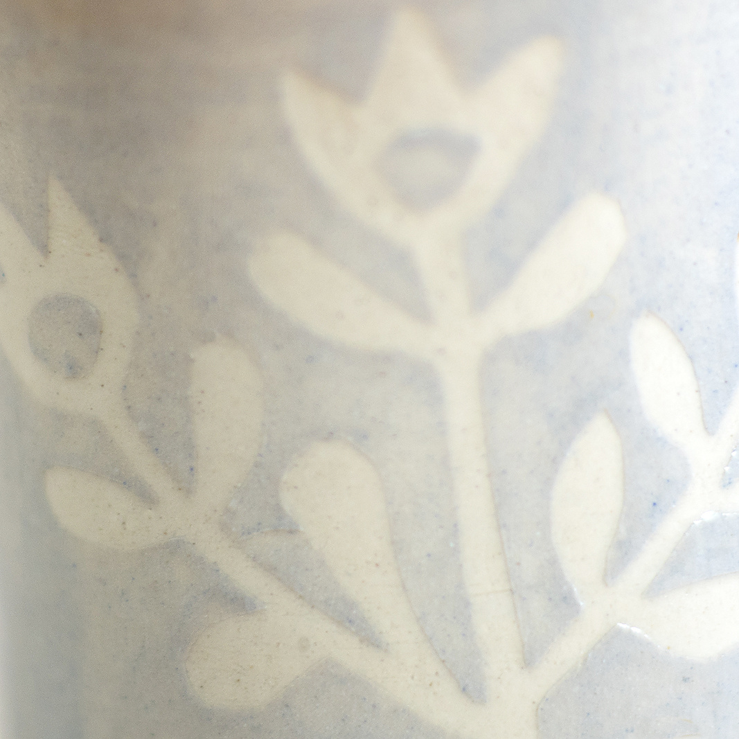 Wykonany ręcznie na kole garncarskim. Masa w kolorze białym, dekorowana wycinanką w kwiaty oraz szarą angobą. Szkliwiony błyszczącym, transparentnym szkliwem. Stemplowany logo autorki.