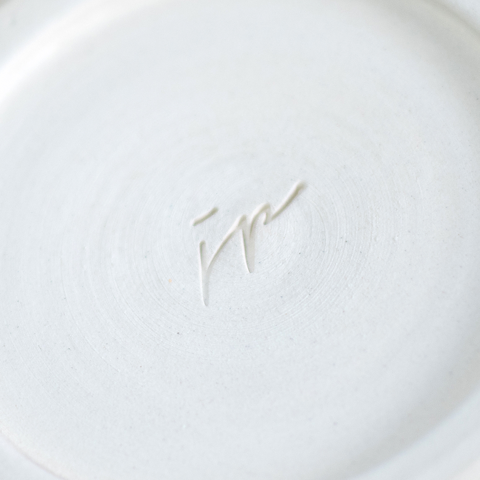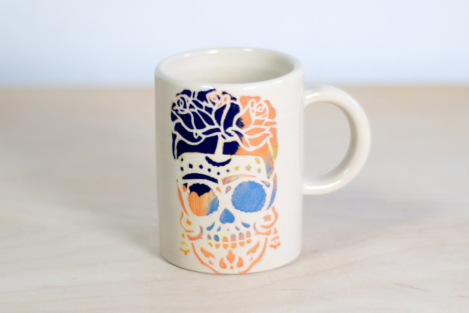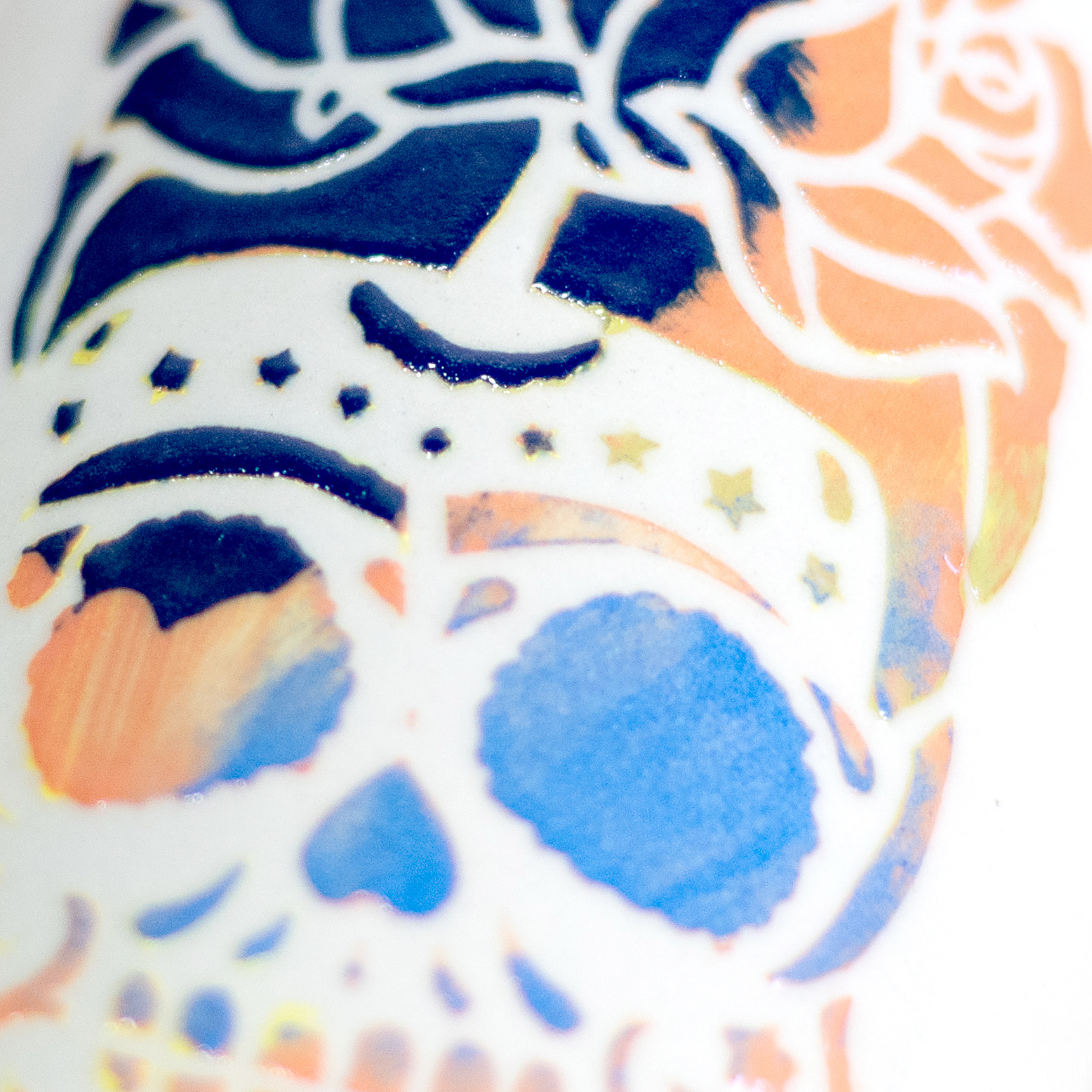 Wykonany ręcznie na kole garncarskim. Masa w kolorze białym, dekorowana kolorową wycinanką z motywem Santa Muerte oraz trupimi czachami. Szkliwiony błyszczącym, transparentnym szkliwem. Stemplowany logo autorki.