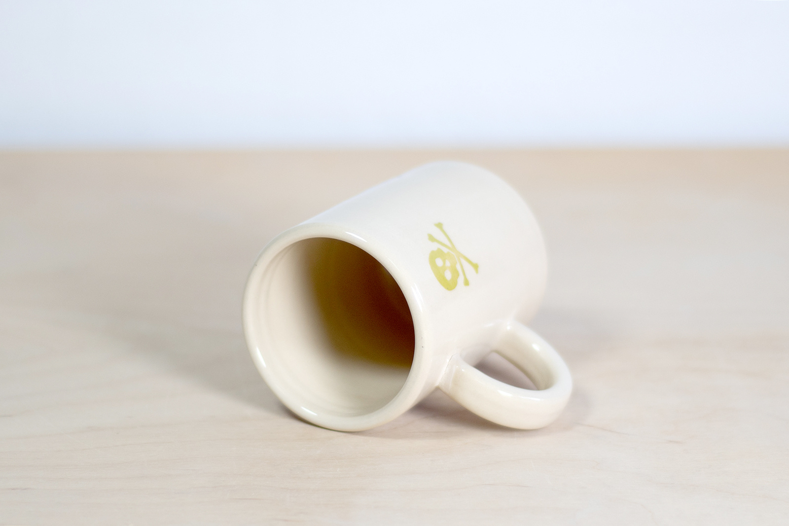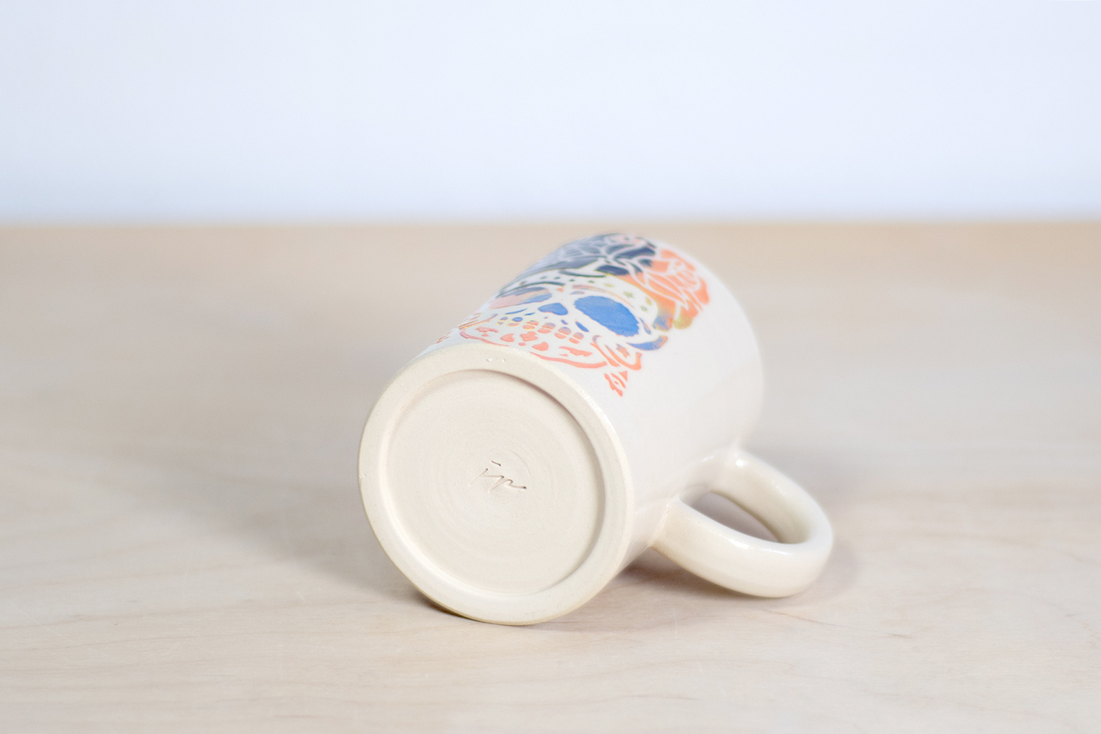 • Kubek ceramiczny o pojemności 200 ml. Wykonany ręcznie na kole garncarskim. Masa w kolorze białym, dekorowana kolorową wycinanką z motywem Santa Muerte oraz trupimi czachami. Szkliwiony błyszczącym, transparentnym szkliwem.
