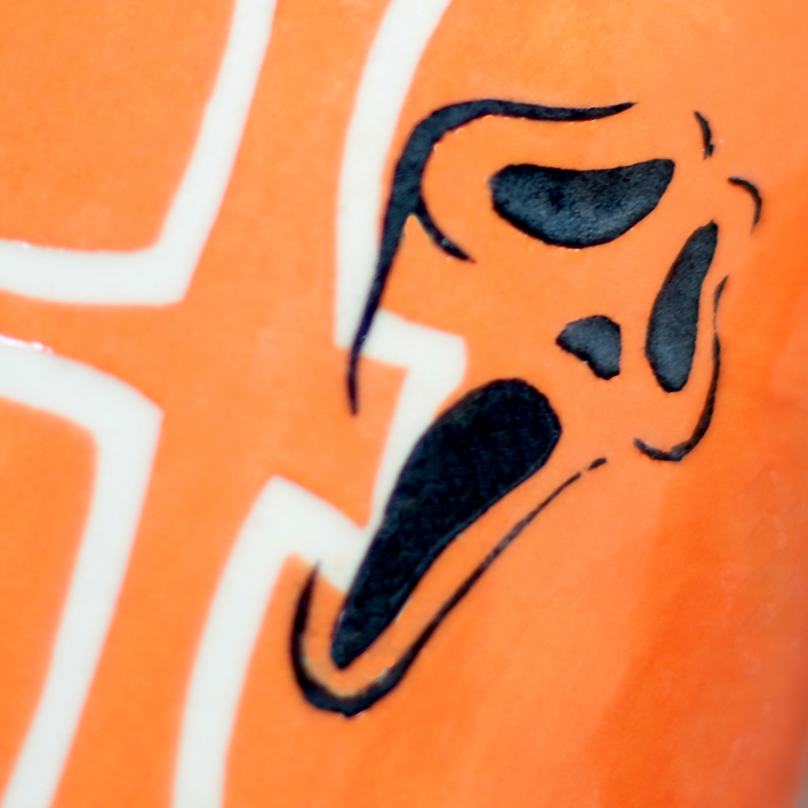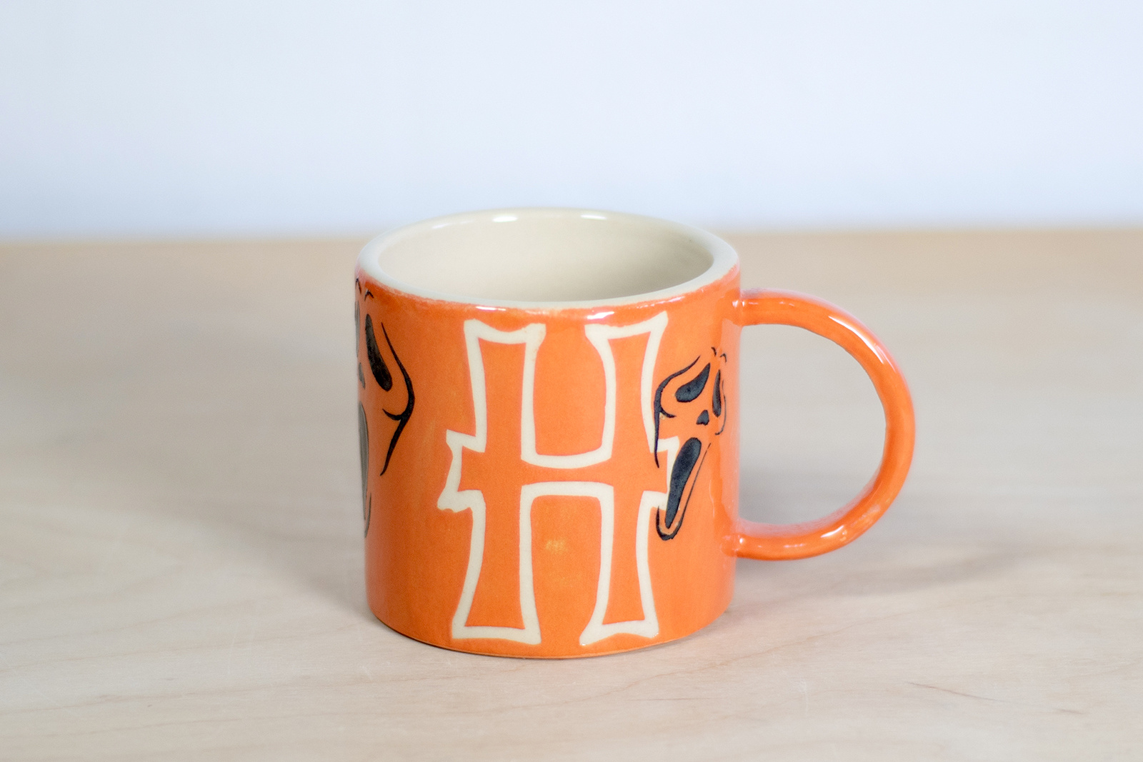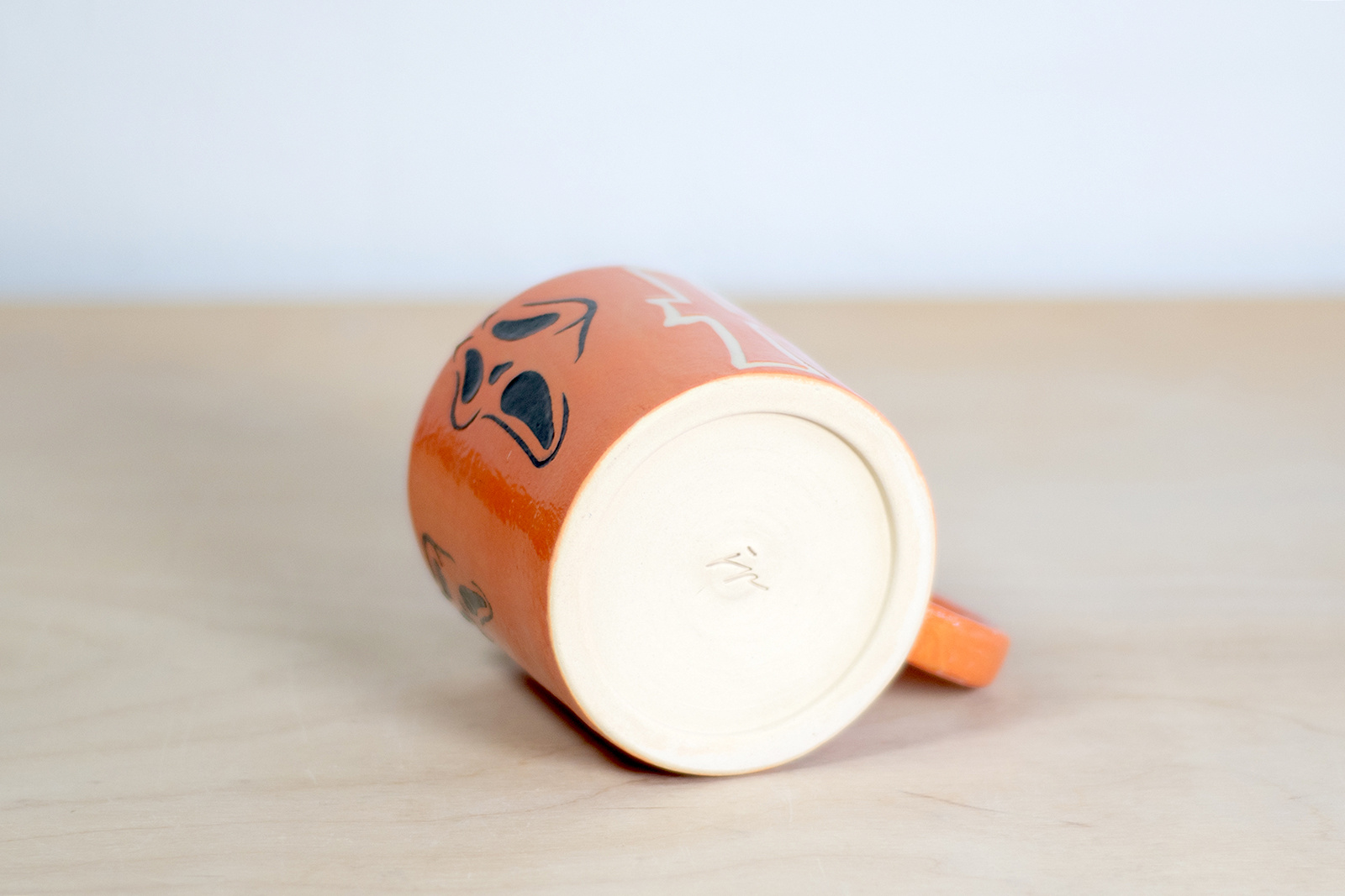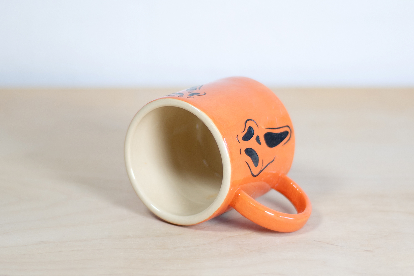 • Kubek ceramiczny o pojemności 200 ml. Wykonany ręcznie na kole garncarskim. Masa w kolorze białym, dekorowana wycinanką w czarne, upiorne duchy i malowana ręcznie pomarańczową angobą. Szkliwiony błyszczącym, transparentnym szkliwem.