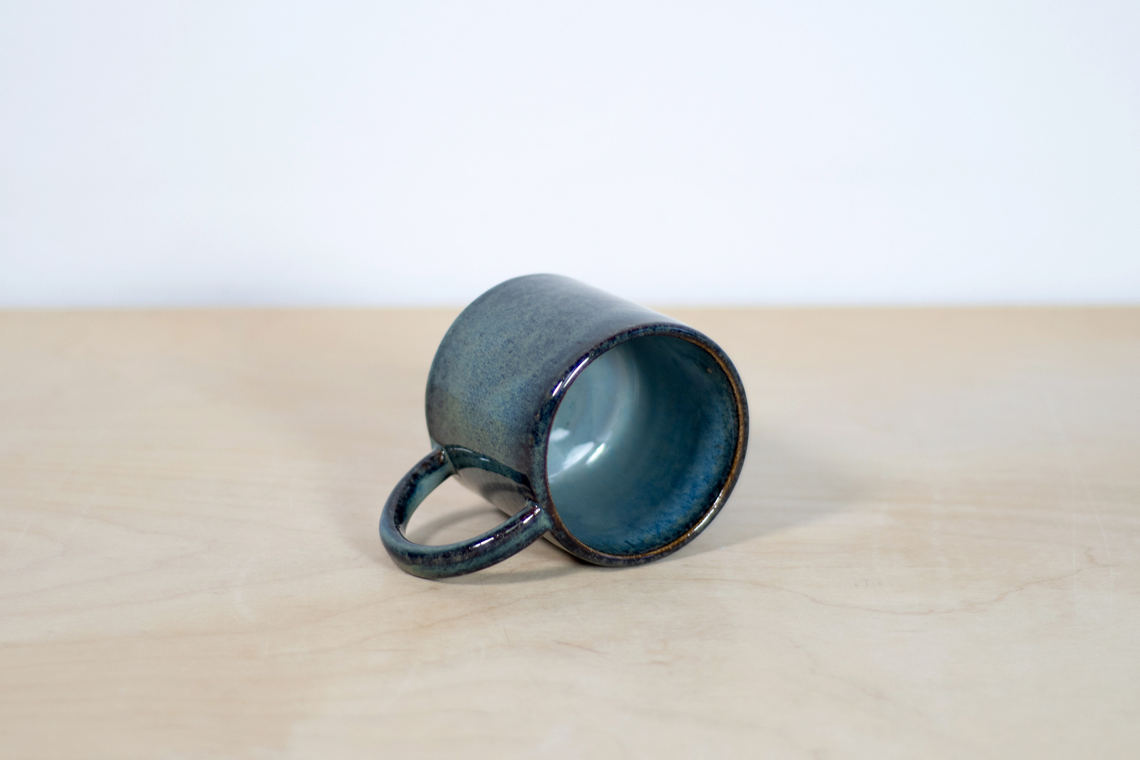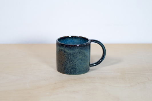 - Kubek ceramiczny o prostym kształcie walca i pojemności 150 ml. Wykonany ręcznie na kole garncarskim. Masa w kolorze kremowym w cętki. Szkliwiony ciemnoniebieskim, efektowym szkliwem, zarówno wewnątrz jak i na zewnątrz.