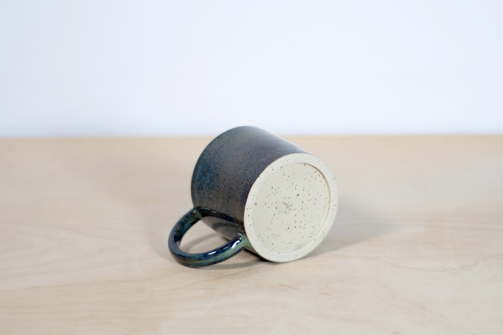Kubek ceramiczny o prostym kształcie walca, wytoczony na kole garncarskim, z ręcznie doklejonym uchem. Wykonany z gliny w kolorze kremowym w brązowe cętki. Stopka wycięta ręcznie. Stemplowany na spodzie logo autorki. Szkliwo błyszczące w kolorze efektowego ciemnego błękitu i granatu.