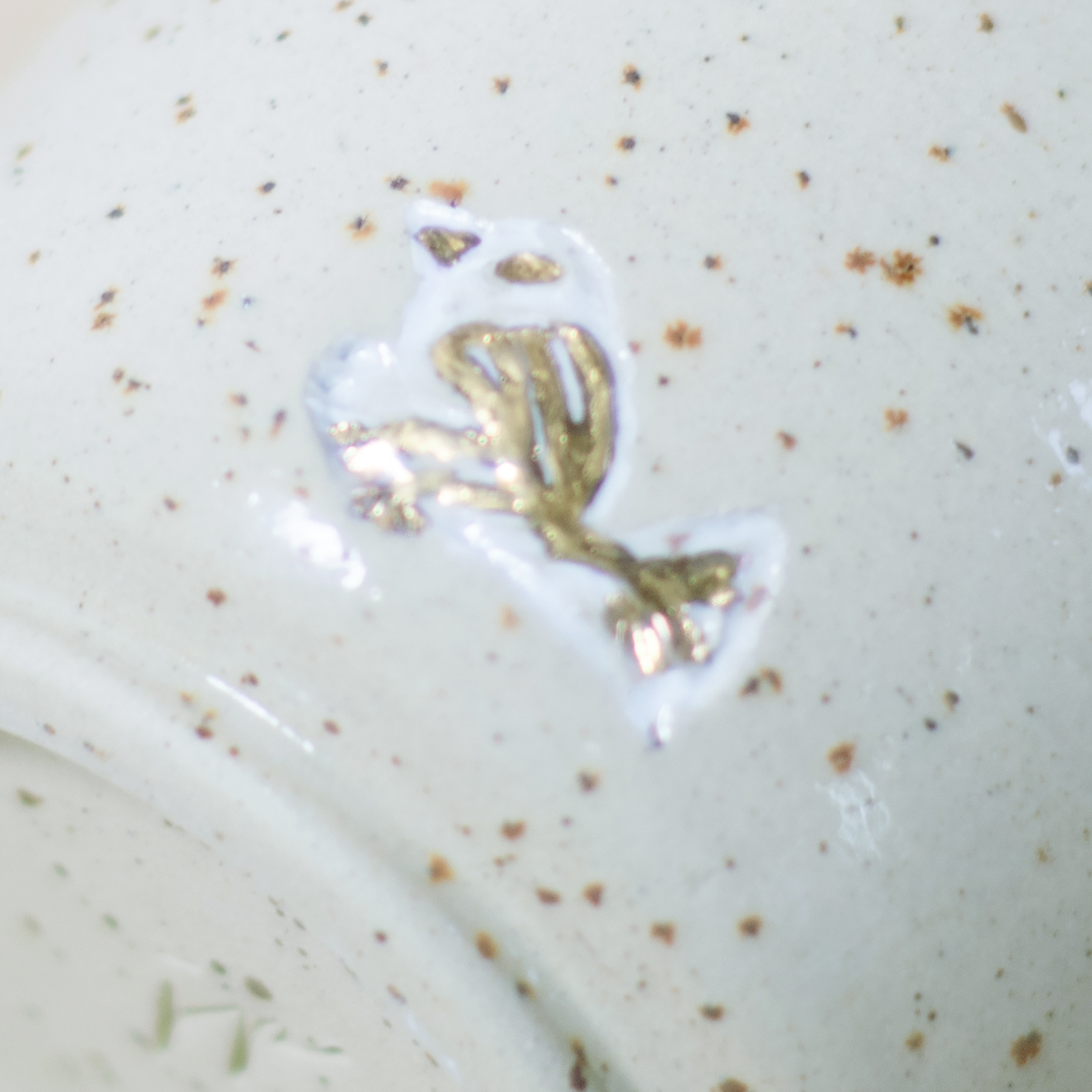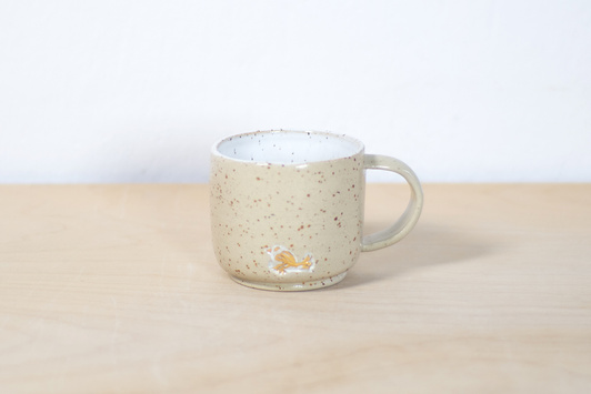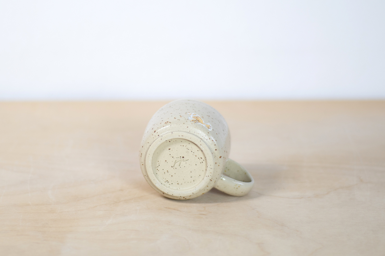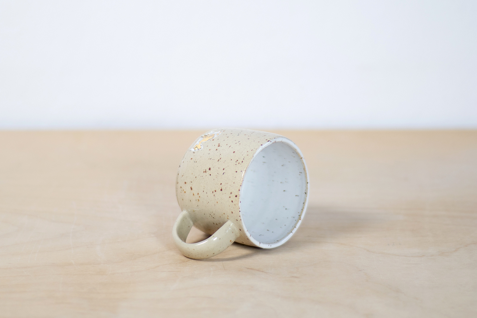 Kubek wytoczony na kole garncarskim, z ręcznie doklejonym uchem. Wykonany z gliny w kolorze kremowym w brązowe cętki. Stopka wycięta ręcznie. Stemplowany na spodzie logo autorki. Wewnątrz szkliwo błyszczące w kolorze białym. Na zewnątrz transparentne szkliwo oraz dekoracja w postaci wytłoczonego ptaszka, pokrytego 10% złotem.
