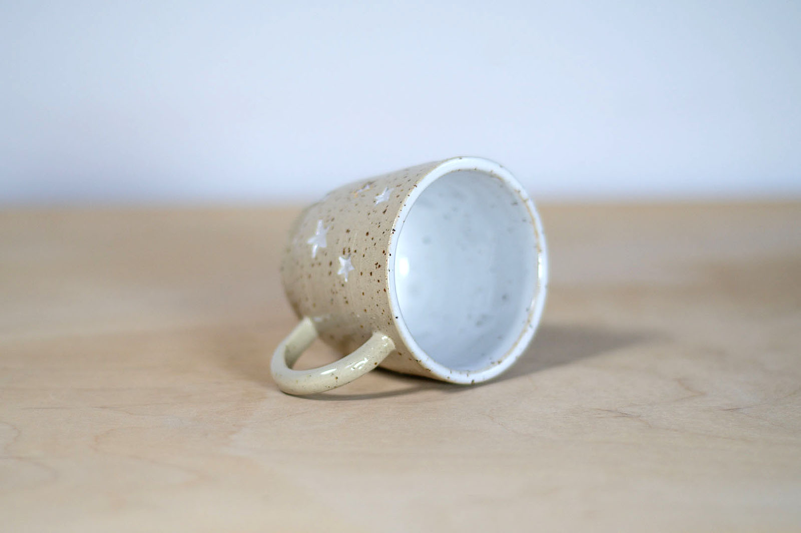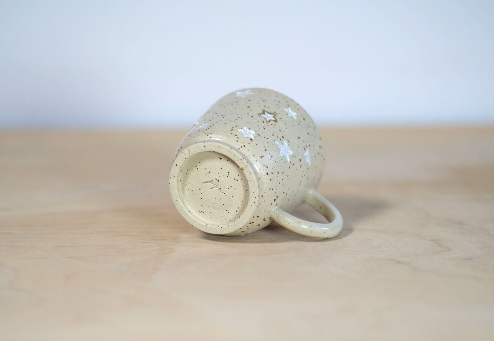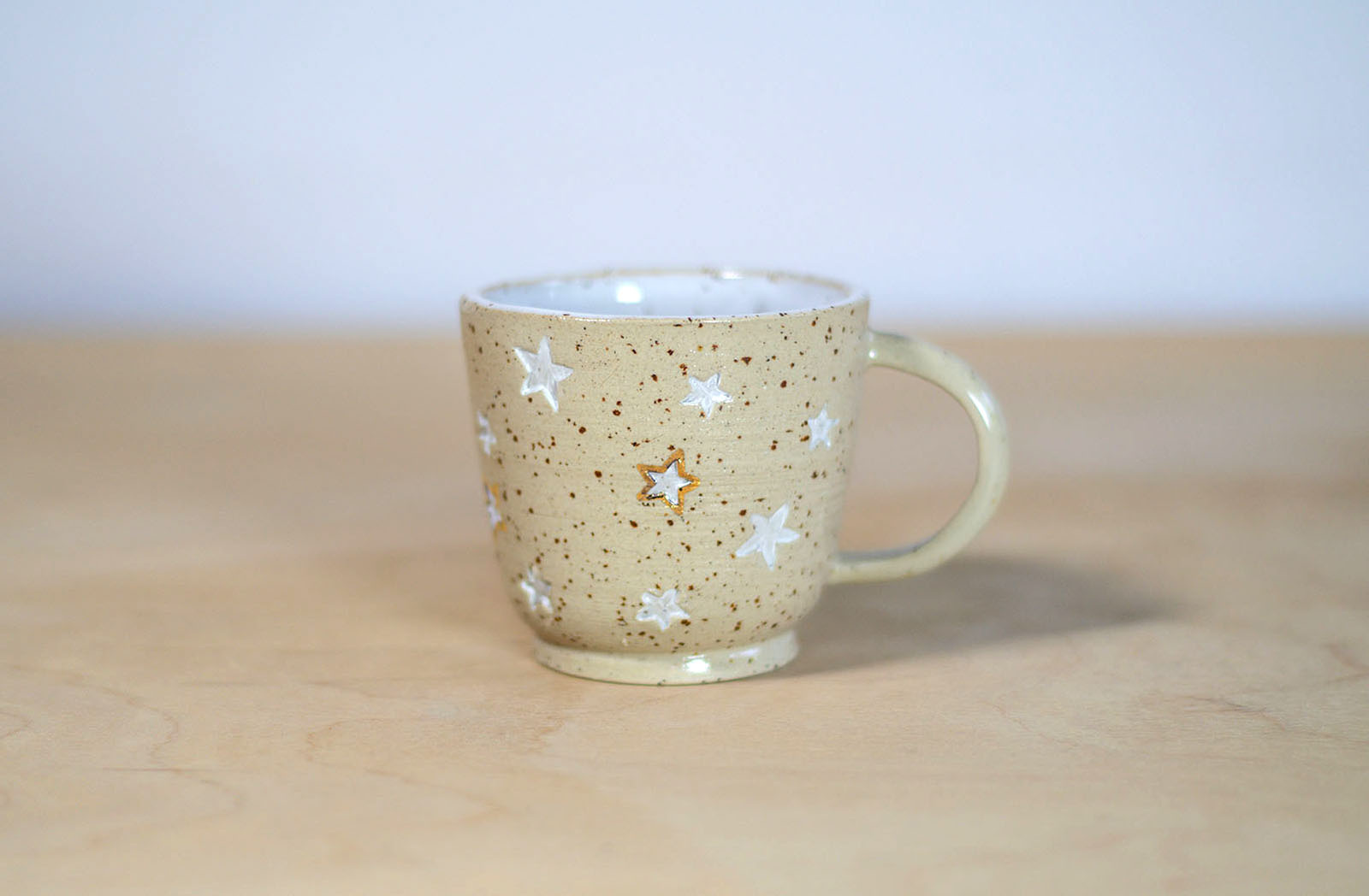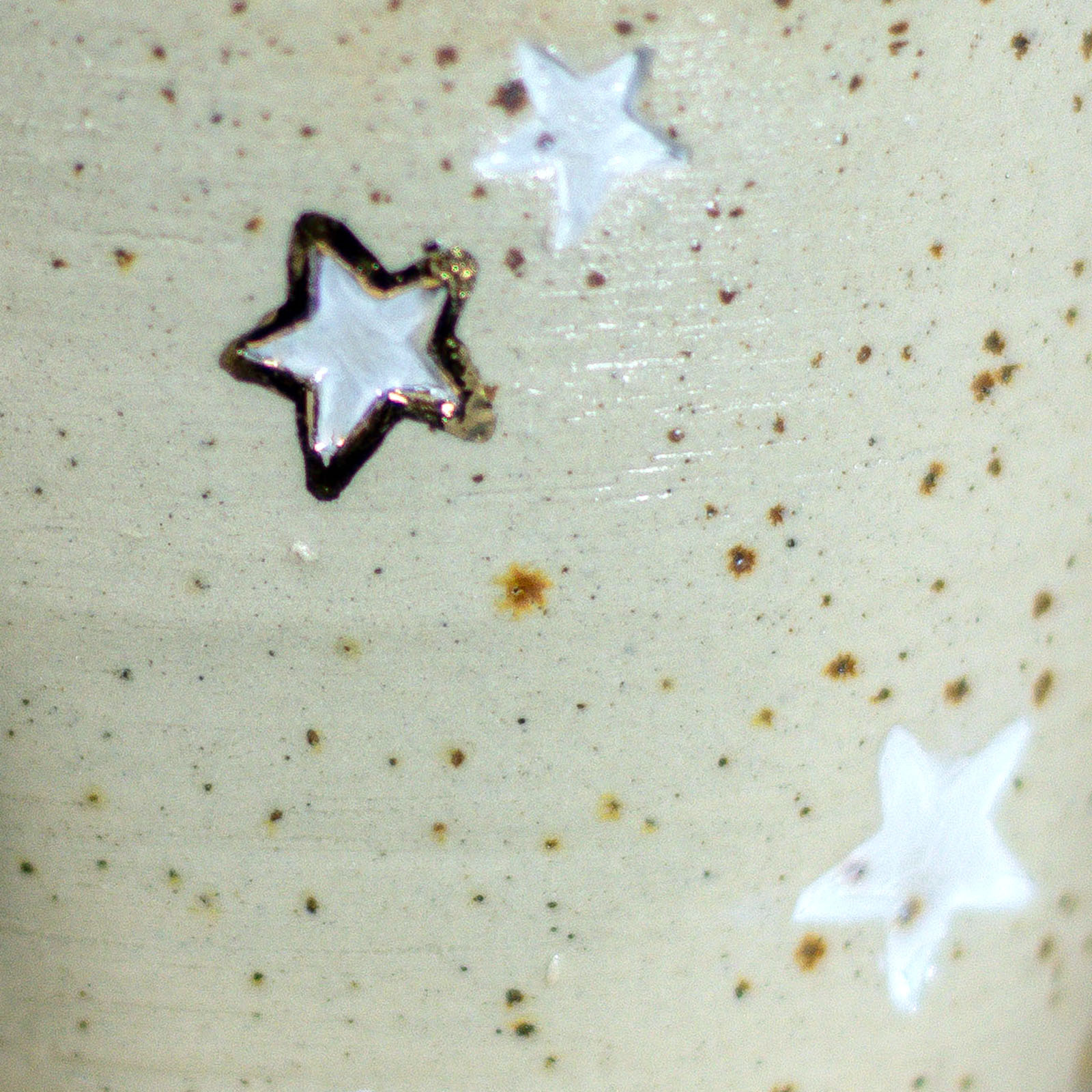 Kubek wytoczony na kole garncarskim, z ręcznie doklejonym uchem. Wykonany z gliny w kolorze kremowym w brązowe cętki. Stopka wycięta ręcznie. Stemplowany na spodzie logo autorki. Białe szkliwo błyszczące wewnątrz kubka. Na zewnątrz zdobienie stemplami w gwiazdki. Zdobione dodatkowo białą farbą naszkliwną oraz 10% złotem.