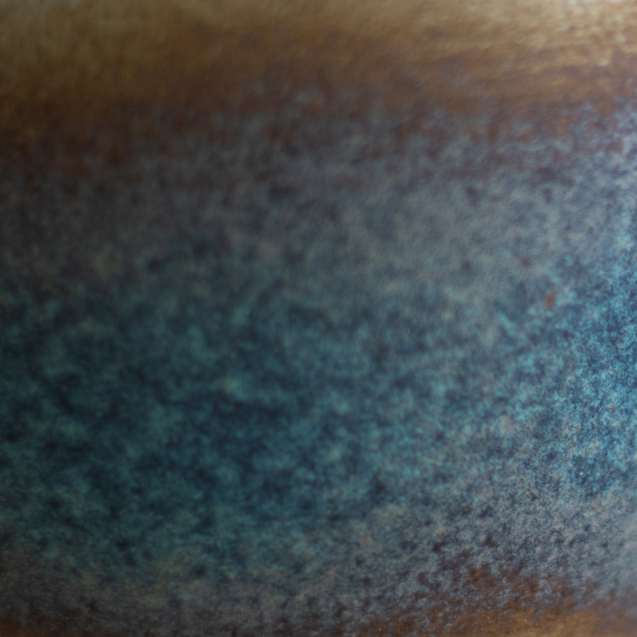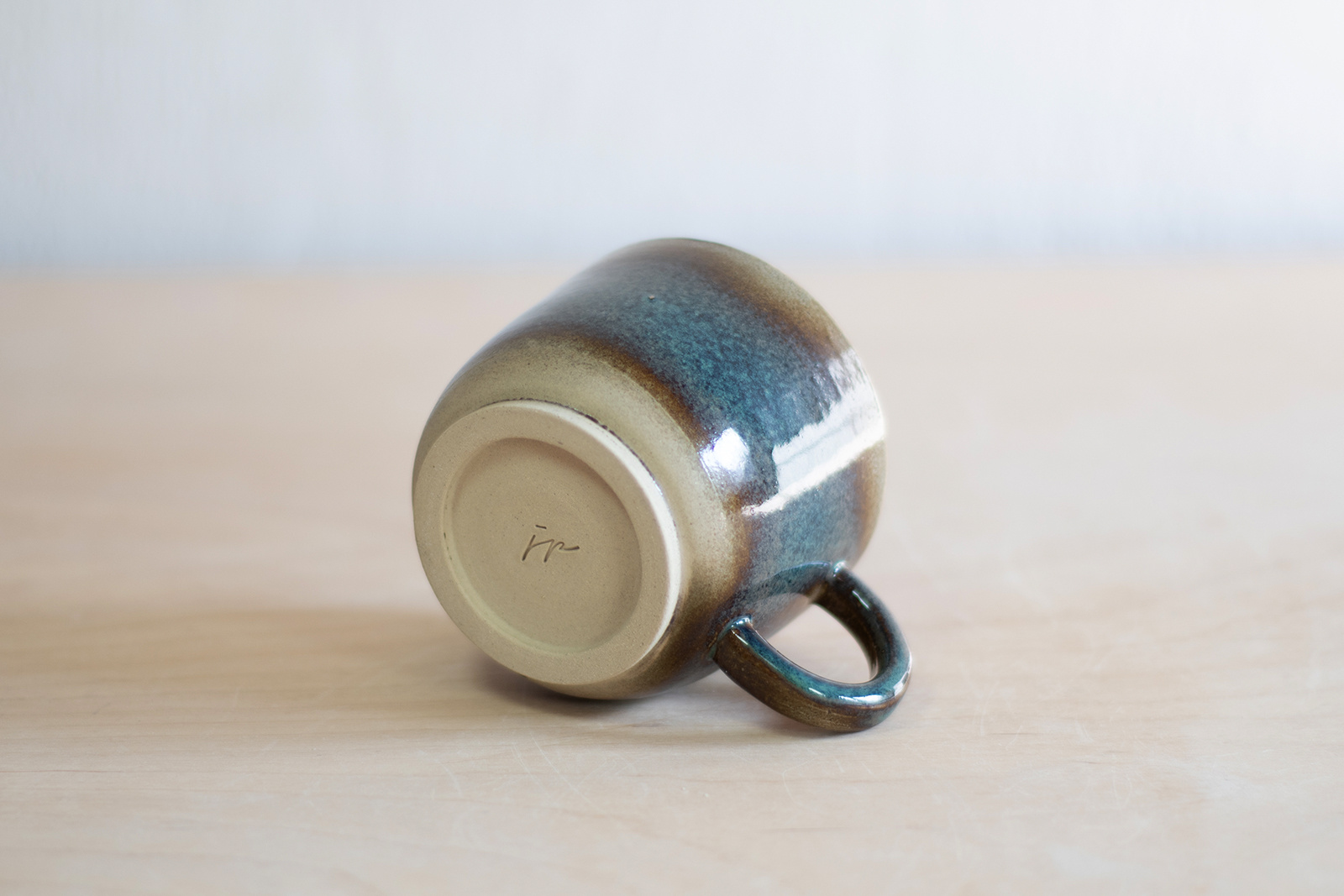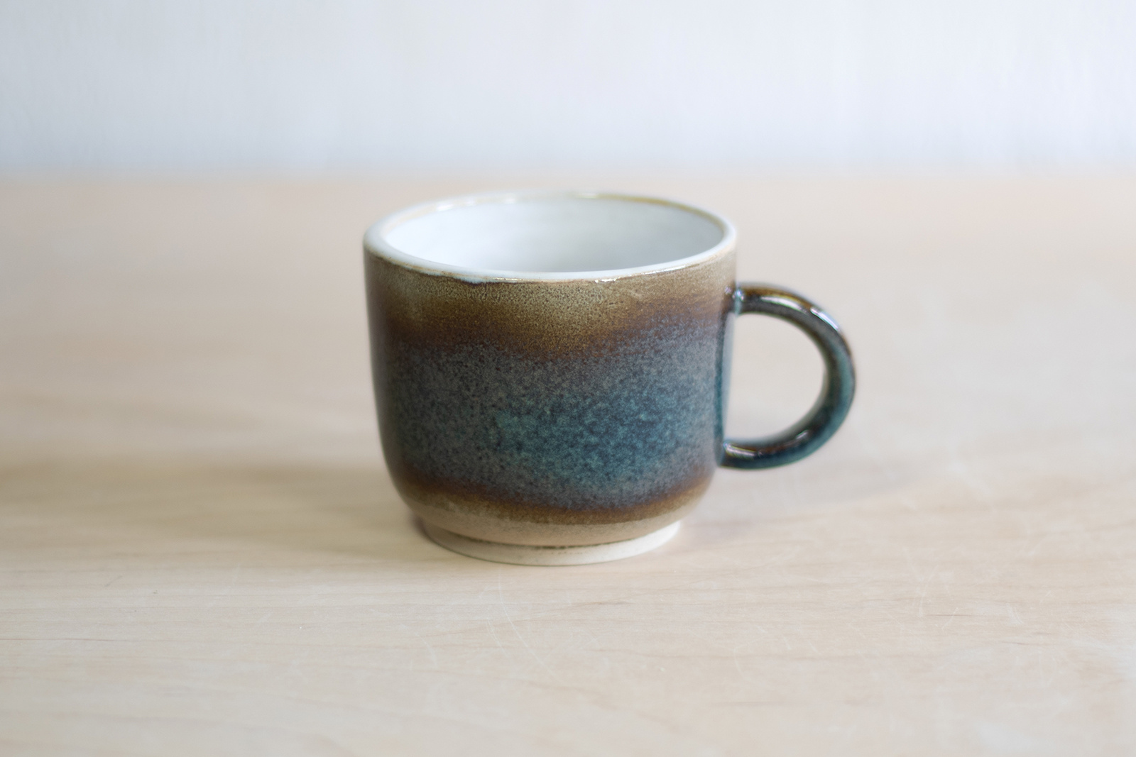 - Kubek ceramiczny o pojemności 150 ml. Wykonany ręcznie na kole garncarskim. Masa w kolorze kremowym. Wewnątrz pokryty białym błyszczącym szkliwem. Na zewnątrz efektownym, niebiesko-brązowym.
