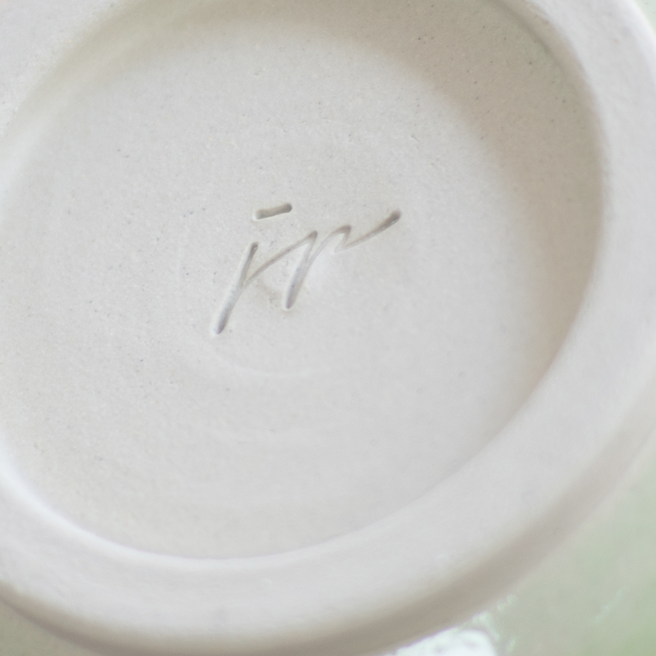 Wykonany ręcznie na kole garncarskim. Masa w kolorze kremowym. Pokryty błyszczącym szkliwem w kolorze kanarkowym. Stemplowany logo autorki.