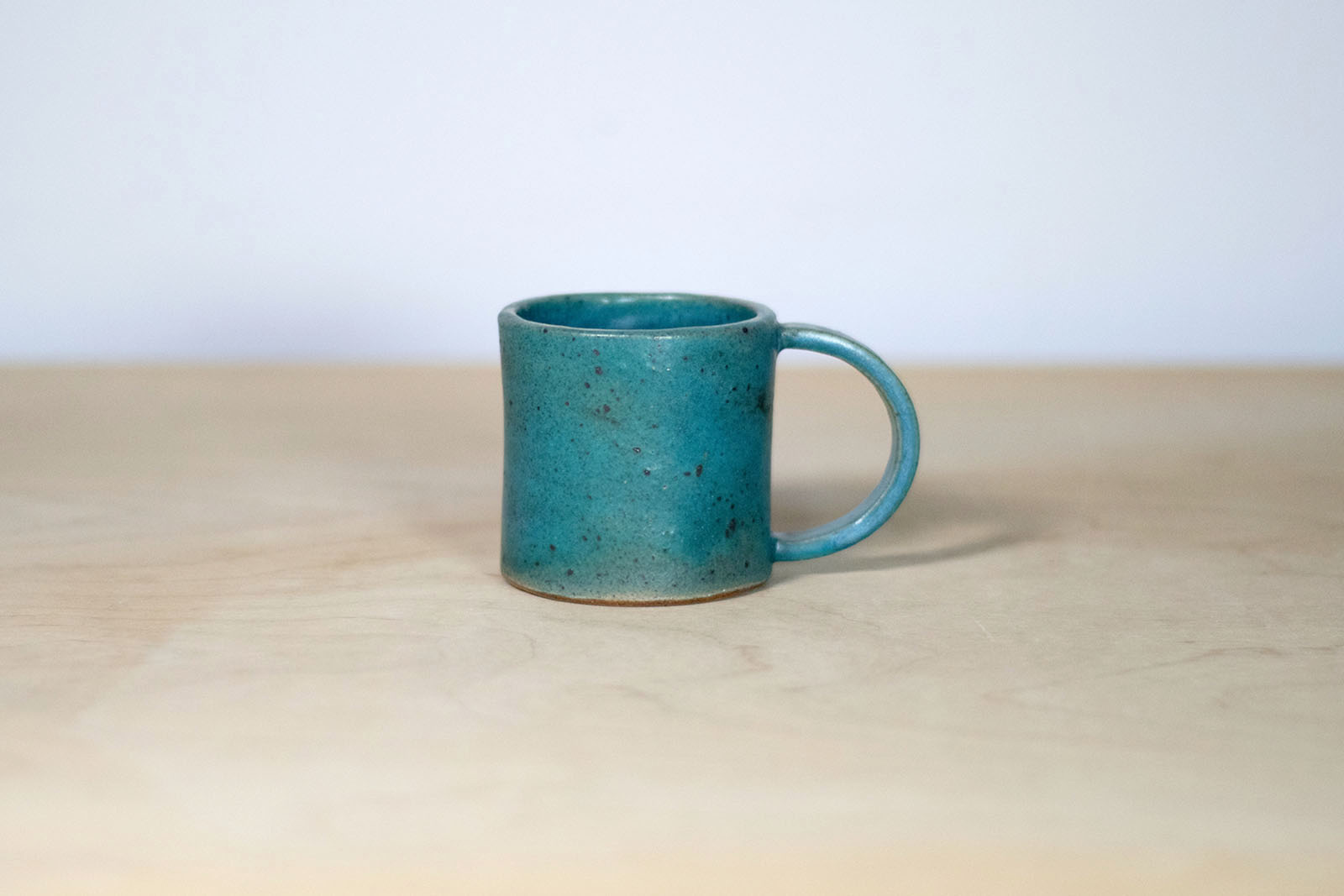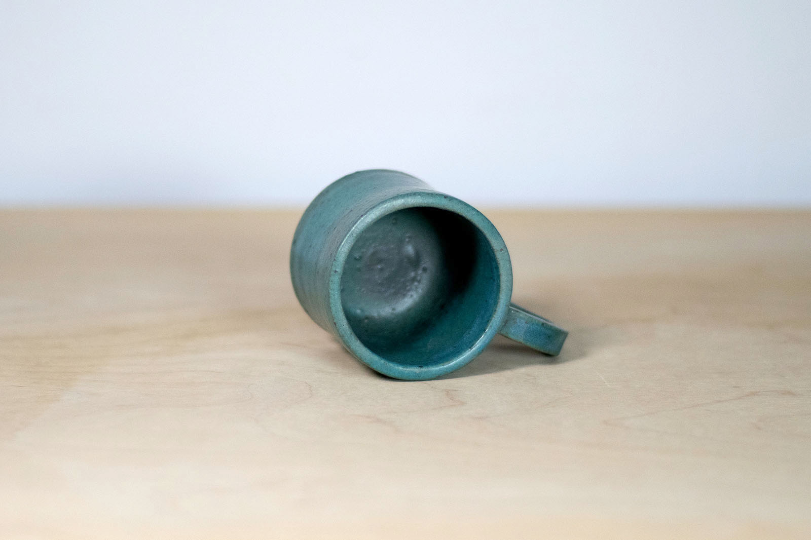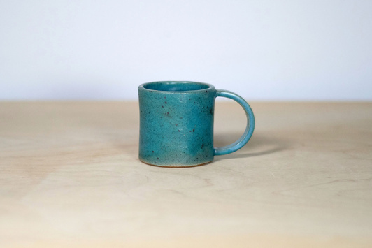 - Kubek ceramiczny o pojemności 150 ml. Wykonany ręcznie na kole garncarskim. Masa w kolorze kremowym w cętki. Szkliwiony matowym szkliwem o turkusowej barwie.