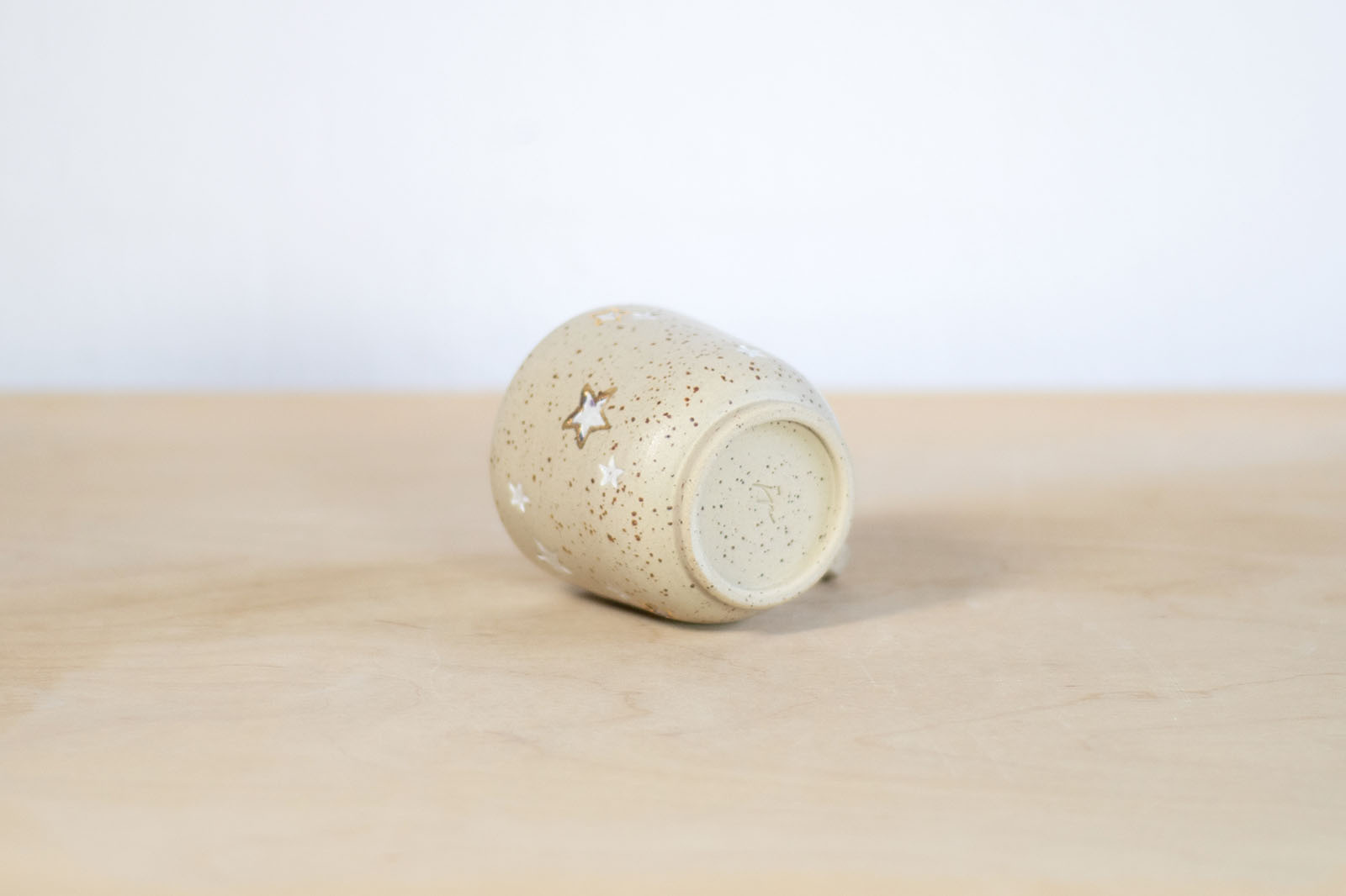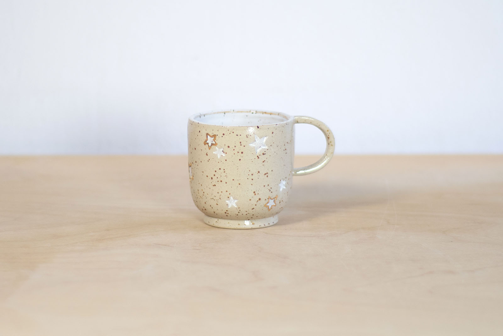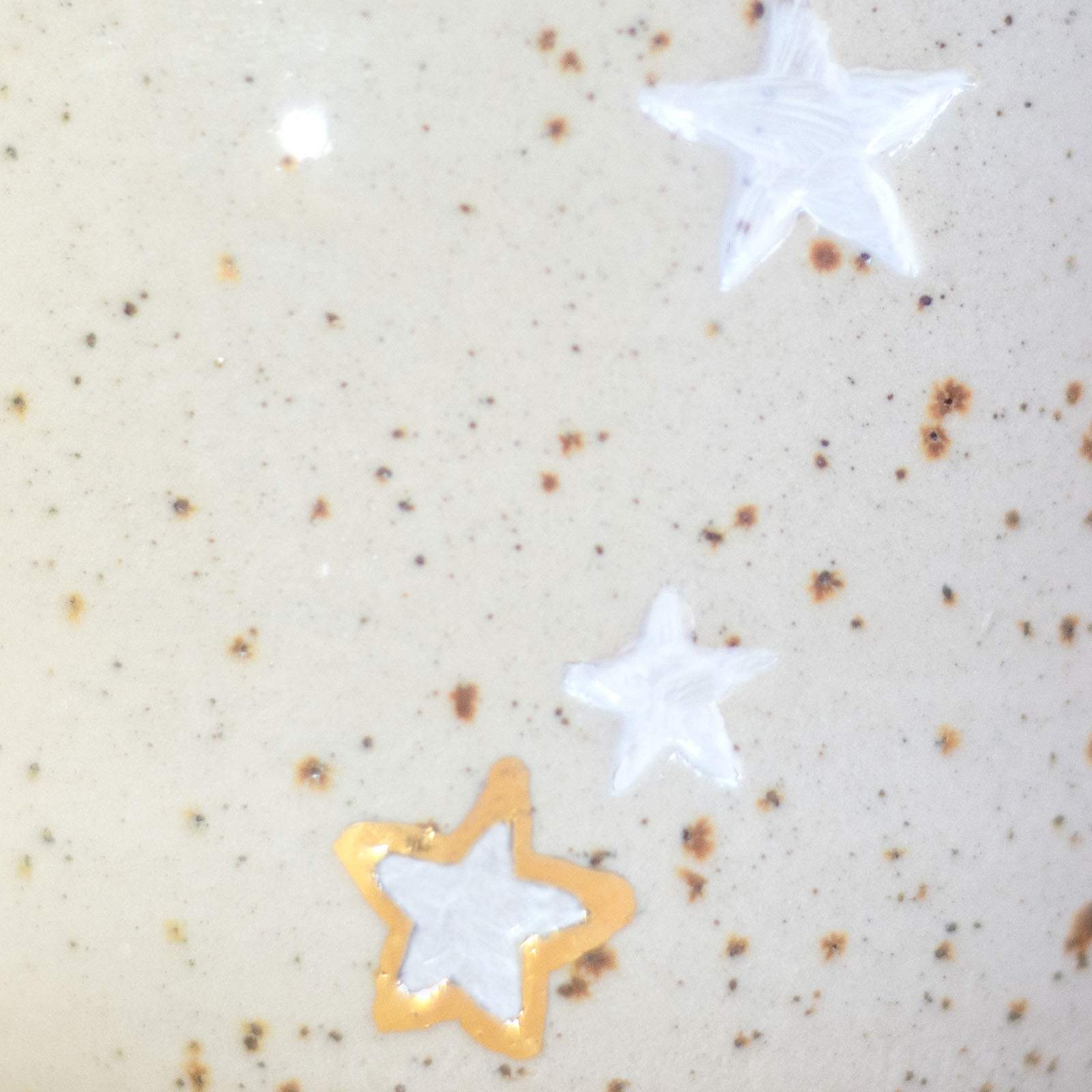 Kubek wytoczony na kole garncarskim, z ręcznie doklejonym uchem. Wykonany z gliny w kolorze kremowym w brązowe cętki. Stopka wycięta ręcznie. Stemplowany na spodzie logo autorki. Wewnątrz szkliwo błyszczące w kolorze białym. Na zewnątrz transparentne szkliwo oraz dekoracja w postaci wytłoczonych gwiazdek, malowanych białą farbą naszkliwną i prawdziwym 10% złotem.