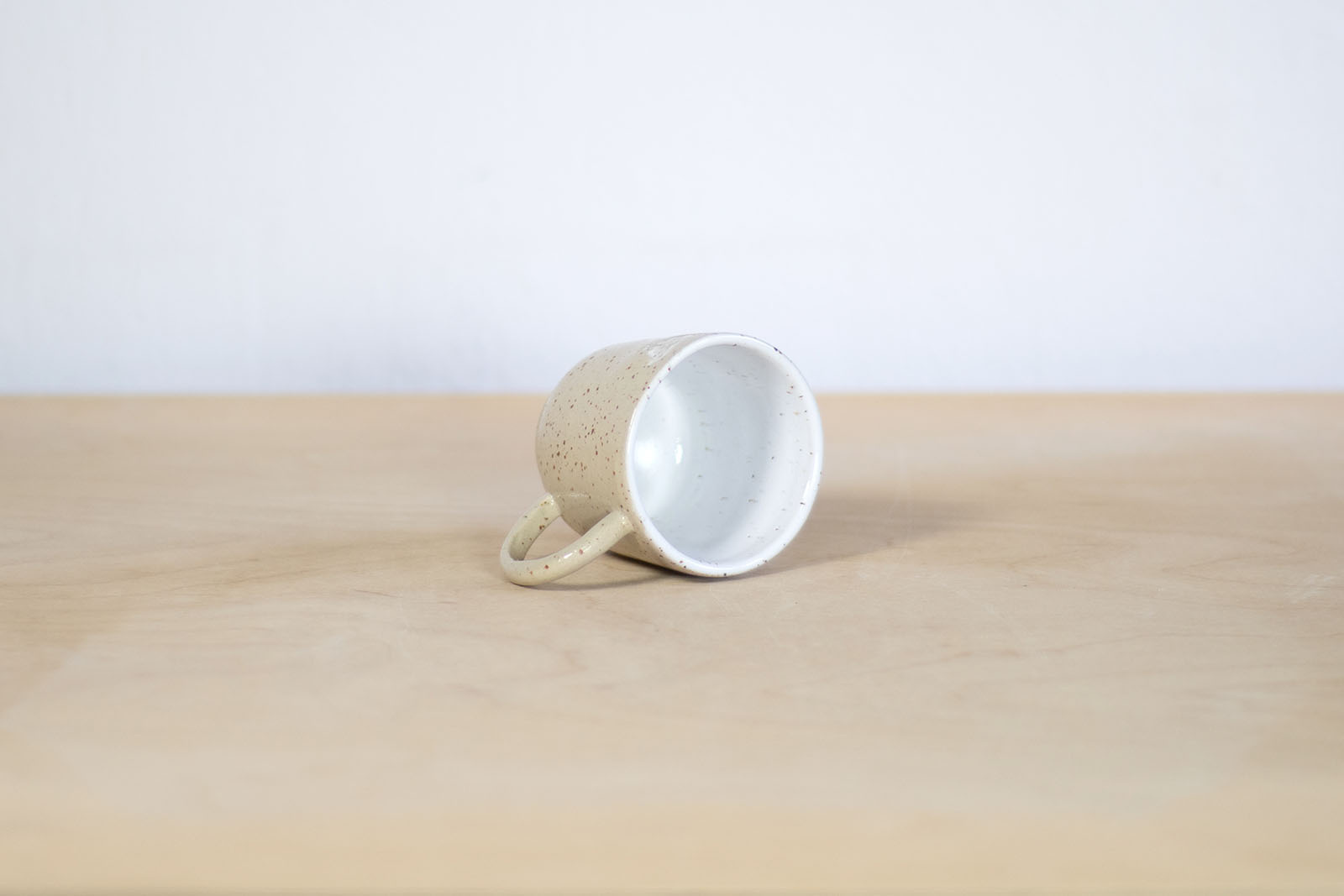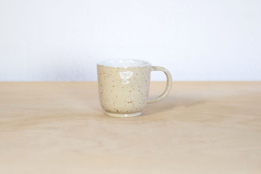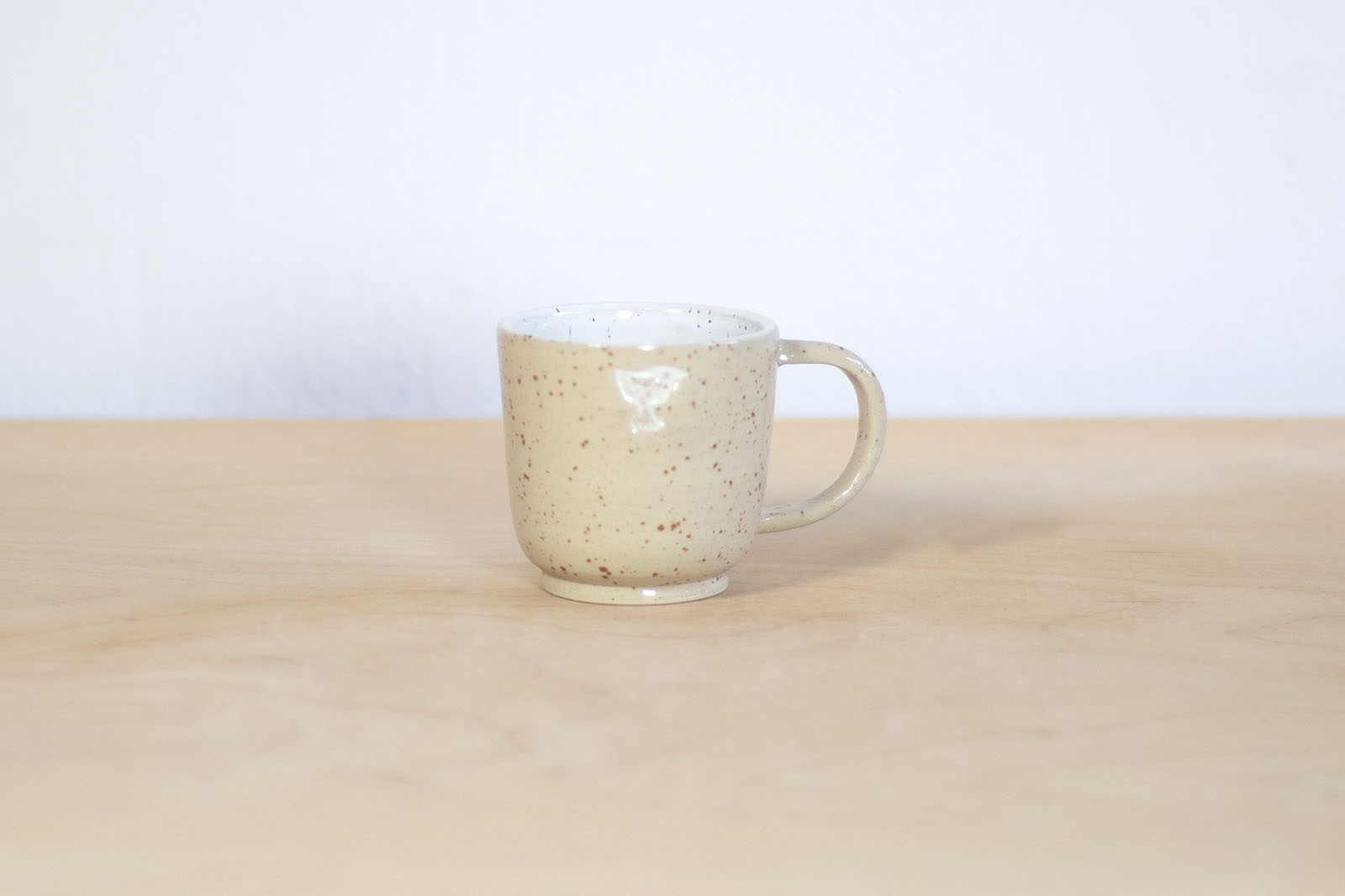 Kubek wytoczony na kole garncarskim, z ręcznie doklejonym uchem. Wykonany z gliny w kolorze kremowym w brązowe cętki. Stopka wycięta ręcznie. Stemplowany na spodzie logo autorki. Wewnątrz szkliwo błyszczące w kolorze białym. Na zewnątrz transparentne szkliwo oraz dekoracja w postaci wytłoczonego ptaszka, pomalowanego białą farbą naszkliwną.