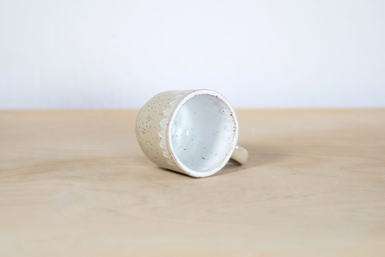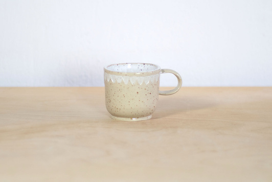 Kubek wytoczony na kole garncarskim, z ręcznie doklejonym uchem. Wykonany z gliny w kolorze kremowym w brązowe cętki. Stopka wycięta ręcznie. Stemplowany na spodzie logo autorki. Wewnątrz szkliwo błyszczące w kolorze białym. Na zewnątrz transparentne szkliwo oraz dekoracja w postaci wytłoczonego wzorka z listków, pomalowanego białą farbą naszkliwną.