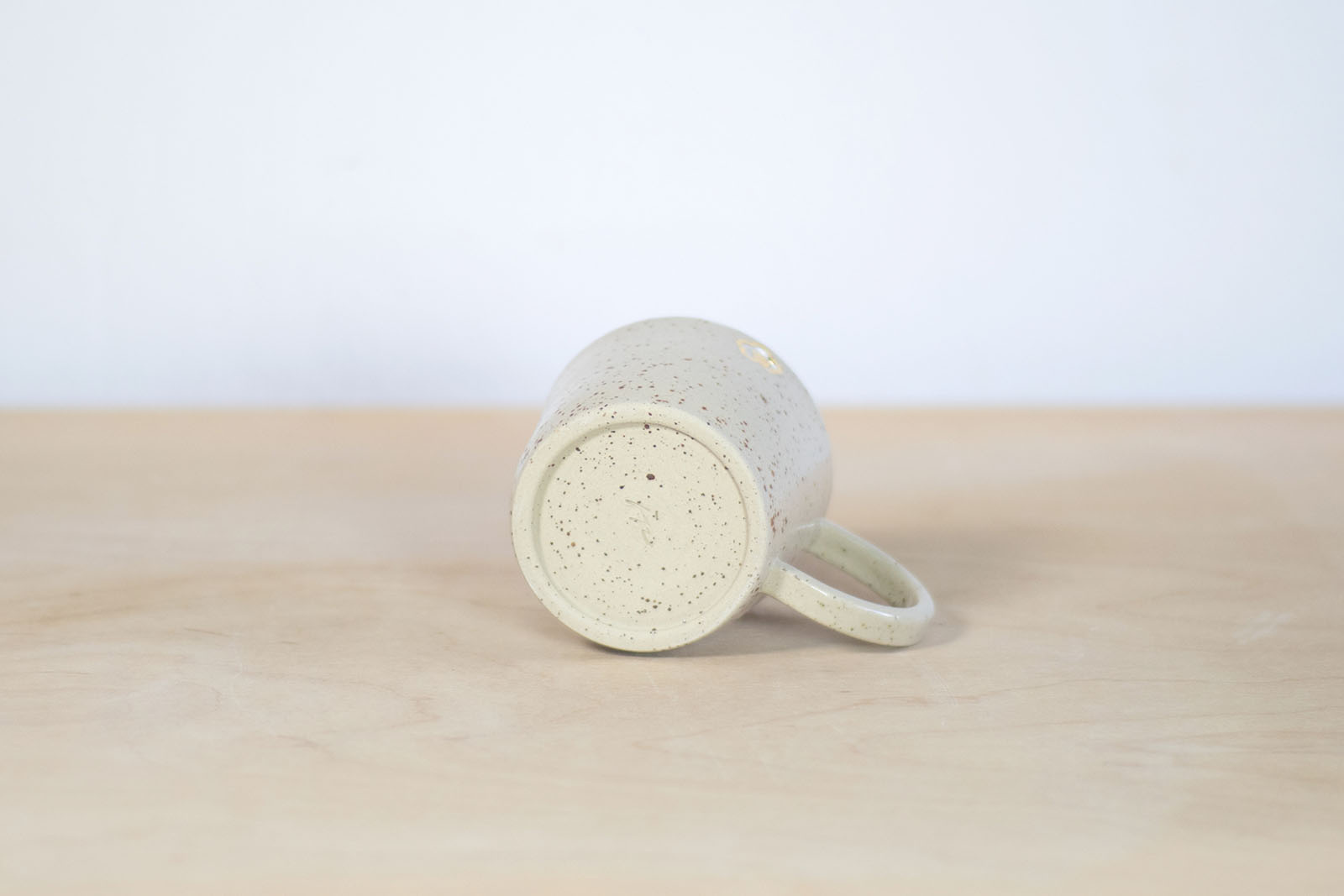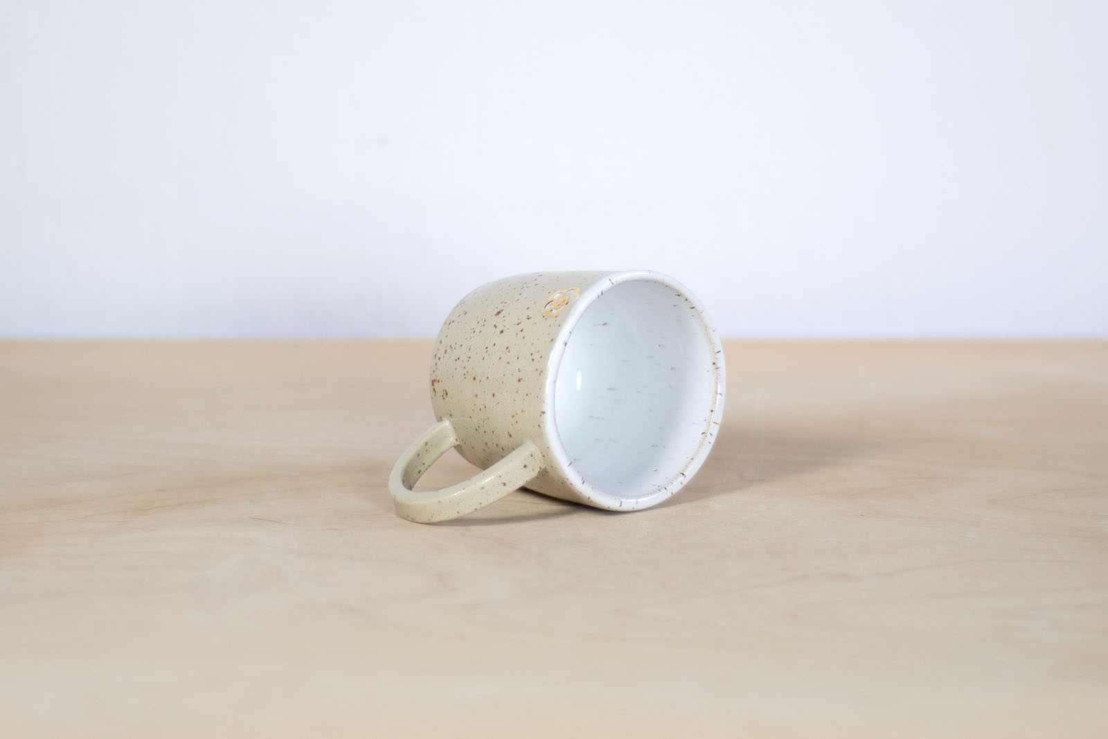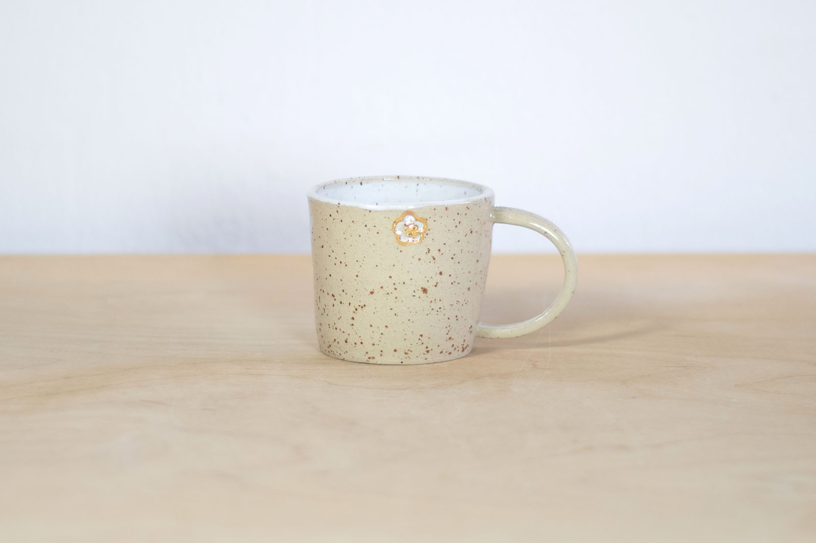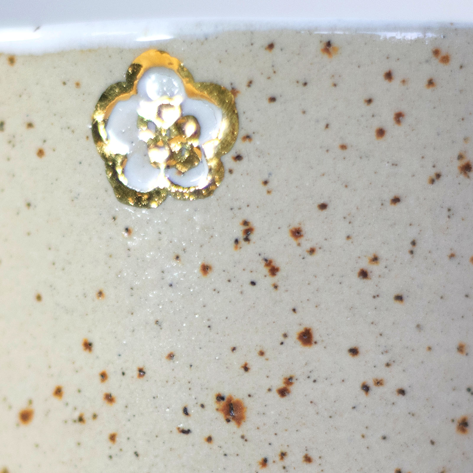 Kubek wytoczony na kole garncarskim, z ręcznie doklejonym uchem. Wykonany z gliny w kolorze kremowym w brązowe cętki. Stopka wycięta ręcznie. Stemplowany na spodzie logo autorki. Wewnątrz szkliwo błyszczące w kolorze białym. Na zewnątrz transparentne szkliwo oraz dekoracja w postaci wytłoczonego kwiatka w kolorze złotym, pomalowanego białą farbą naszkliwną oraz 10% złotem.