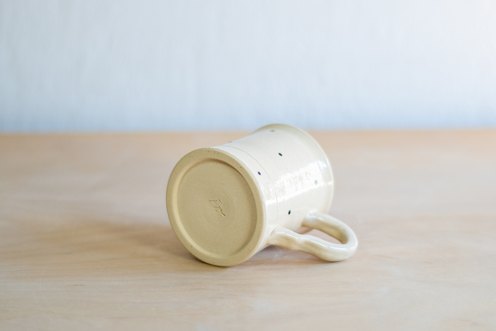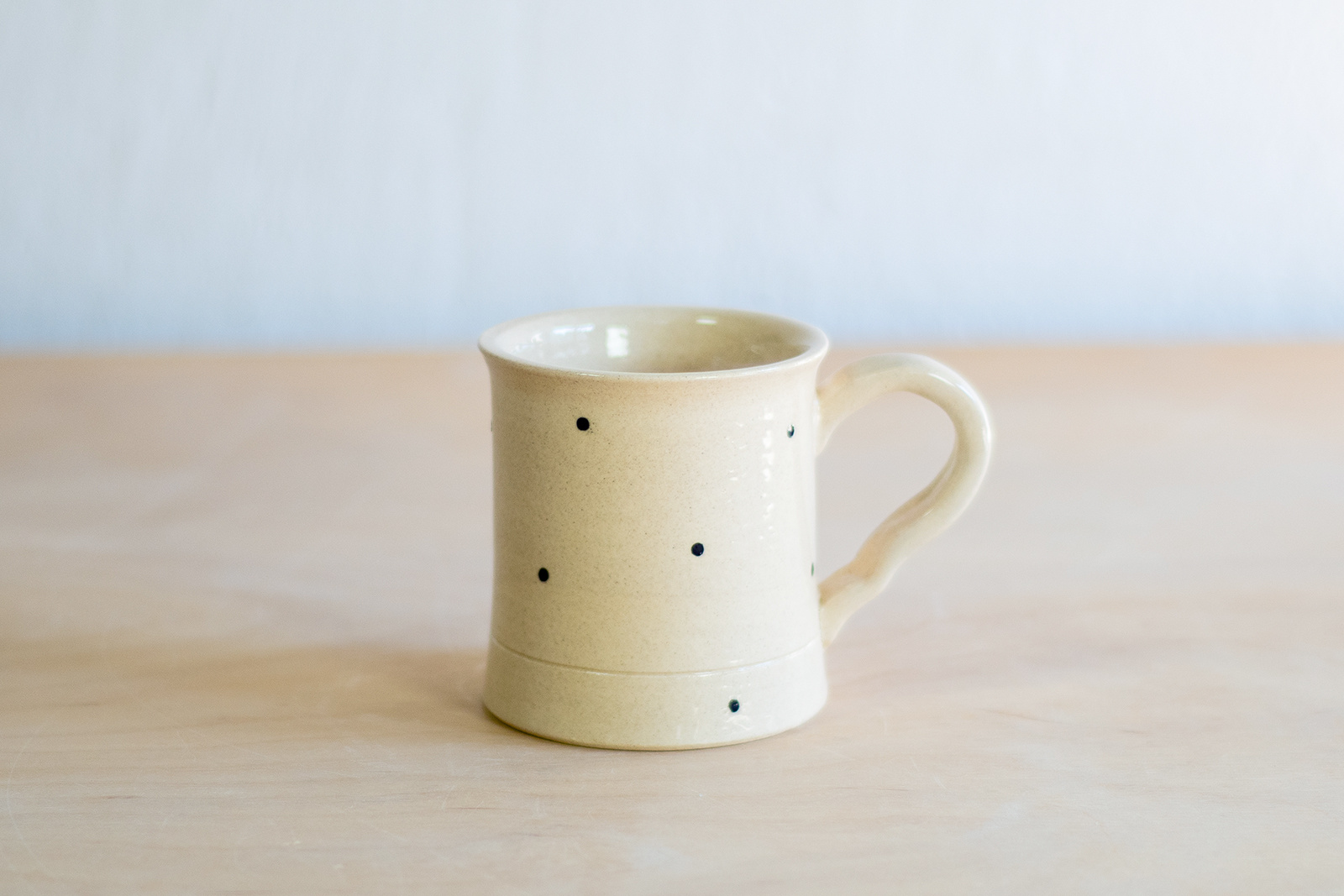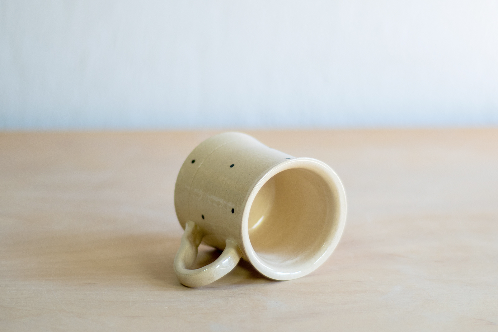 - Kubek ceramiczny o pojemności 150 ml. Wykonany ręcznie na kole garncarskim. Masa w kolorze jasnokremowym. W całości pokryty bezbarwnym, błyszczącym szkliwem. Dekorowany ręcznie czarnymi kropeczkami.