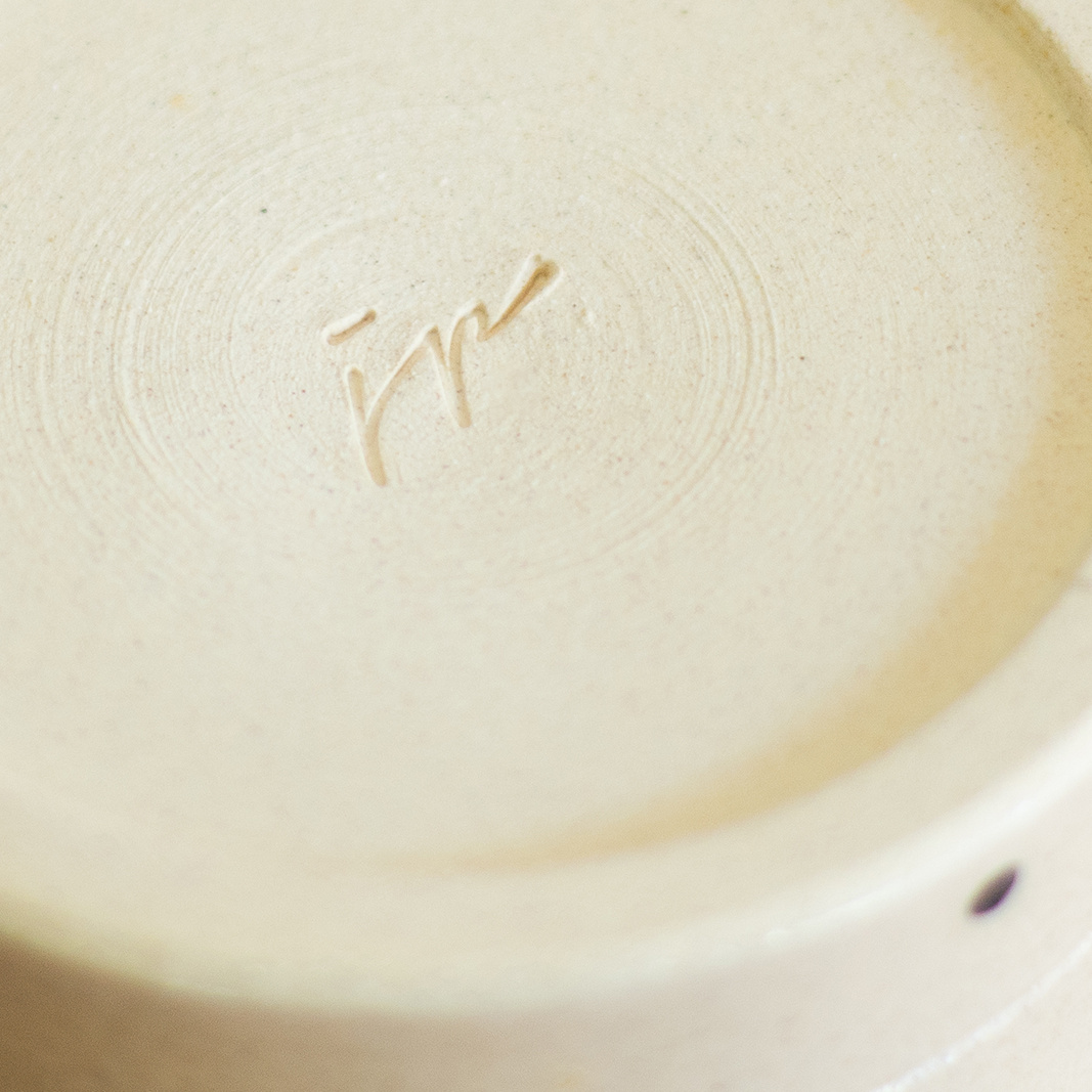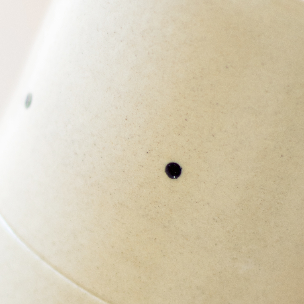 Wykonany ręcznie na kole garncarskim. Masa w kolorze jasnokremowym. W całości pokryty bezbarwnym, błyszczącym szkliwem. Dekorowany ręcznie czarnymi kropeczkami.