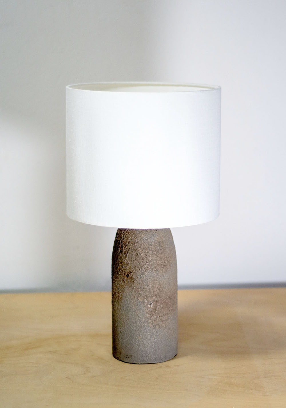 Lampa średniej wielkości o ceramicznej podstawie. Wytoczona na kole garncarskim z ciemnej gliny. Pokryta szkliwem z efektem lawy w brunatnej barwie. Abażur w kolorze białego płótna. Żarówka E14, 470 lm, barwa ciepła, biała. Idealna do salonu lub sypialni.