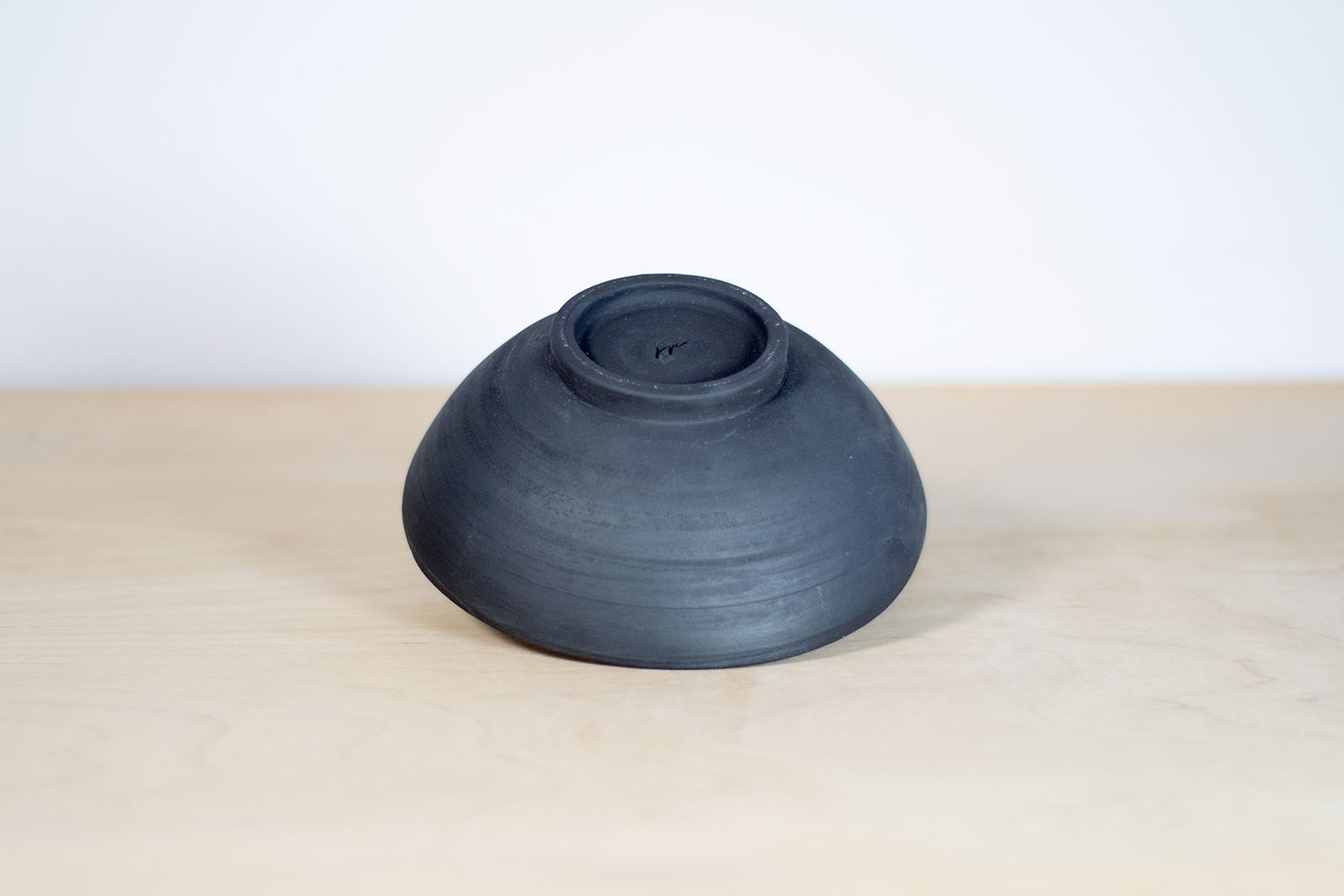 Wytoczona na kole garncarskim. Wykonana z gliny w kolorze czarnym. Stopka wycięta ręcznie. Stemplowana na spodzie logo autorki. Szkliwiona tylko wewnątrz, błyszczącym szkliwem w kolorze białym.