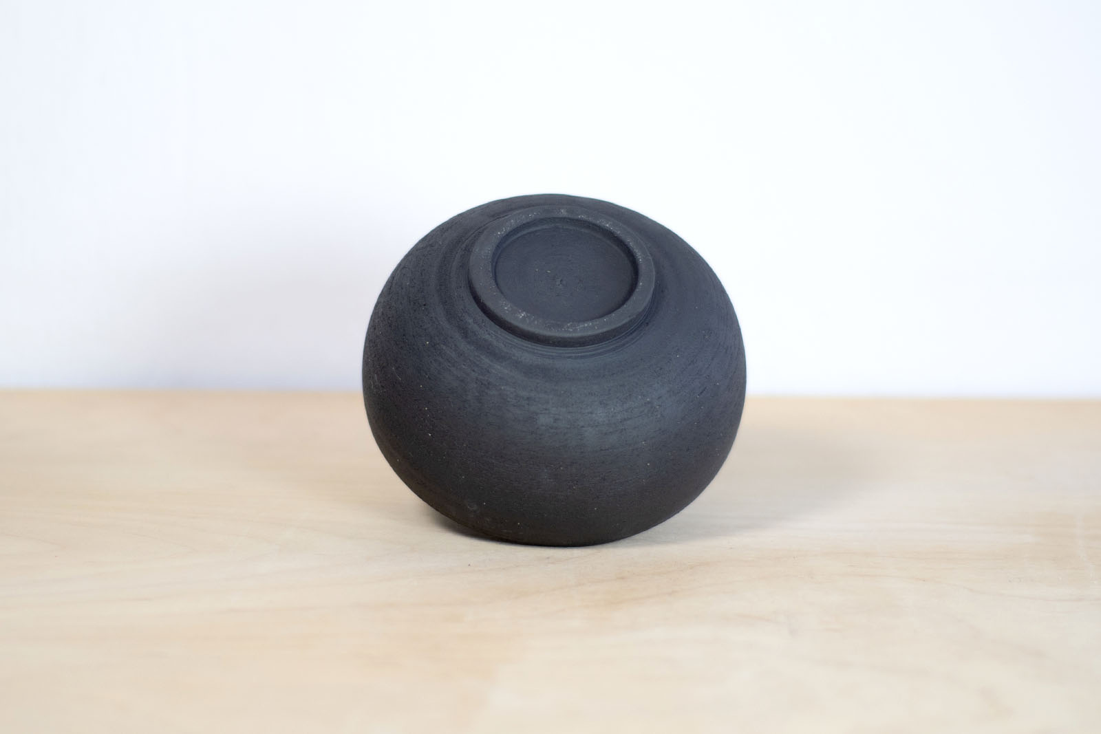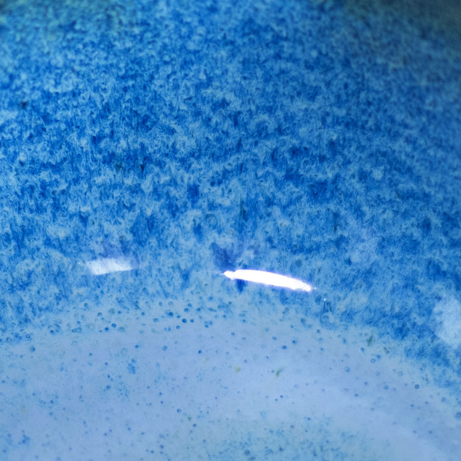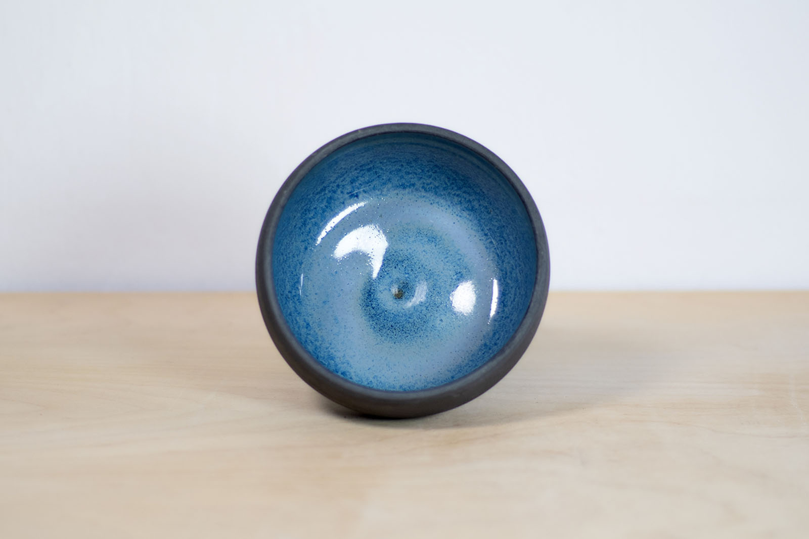 Wytoczona na kole garncarskim. Wykonana z gliny w kolorze czarnym. Stopka wycięta ręcznie. Szkliwiona tylko wewnątrz, błyszczącym szkliwem w kolorze niebieskim z efektownymi refleksami.