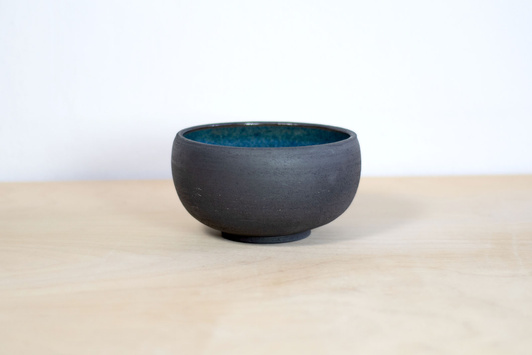 • Miseczka o pojemności 500 ml. Wykonana ręcznie na kole garncarskim z gliny w kolorze czarnym. Wnętrze pokryte błyszczącym szkliwem w kolorze niebieskim z efektownymi refleksami. Można stosować jako miseczkę do muesli lub na zupę.