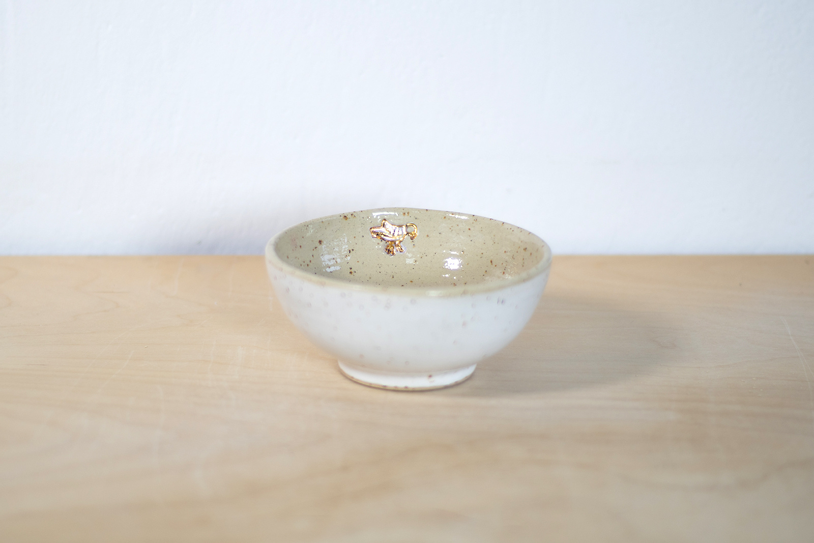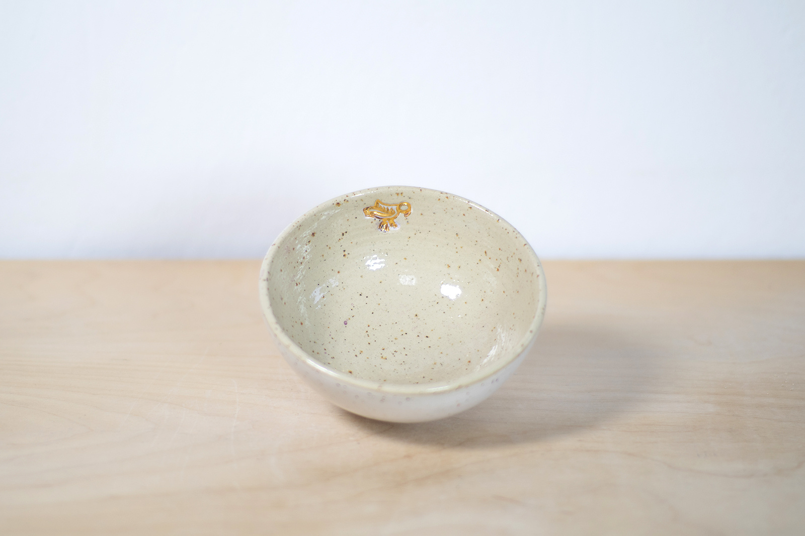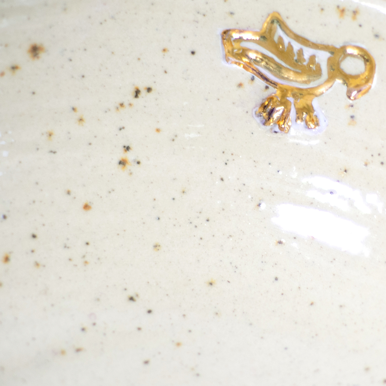- Miseczka o pojemności 350 ml. Wykonana ręcznie na kole garncarskim z gliny w kolorze kremowym w brązowe cętki. Wewnątrz niewielki element dekoracyjny w postaci wytłoczonego ptaszka, następnie pokrytego 10% złotem.