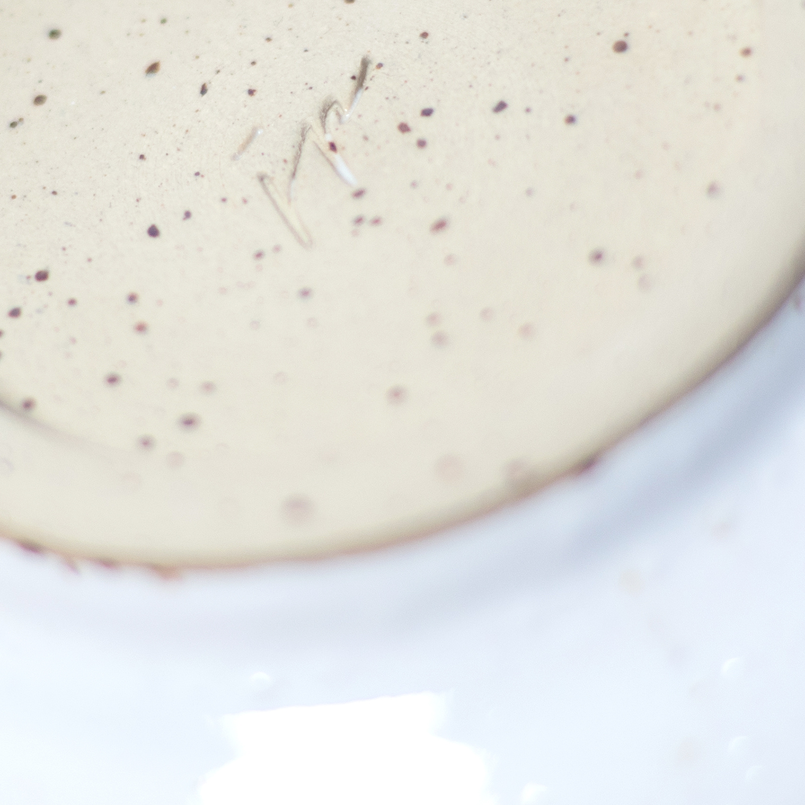 Wytoczona na kole garncarskim. Wykonana z gliny w kolorze kremowym w brązowe cętki. Stopka wycięta ręcznie. Stemplowana na spodzie logo autorki. Szkliwiona na zewnątrz, błyszczącym szkliwem w kolorze białym. Wewnątrz niewielki element dekoracyjny w postaci wytłoczonego ptaszka, następnie pokrytego 10% złotem.