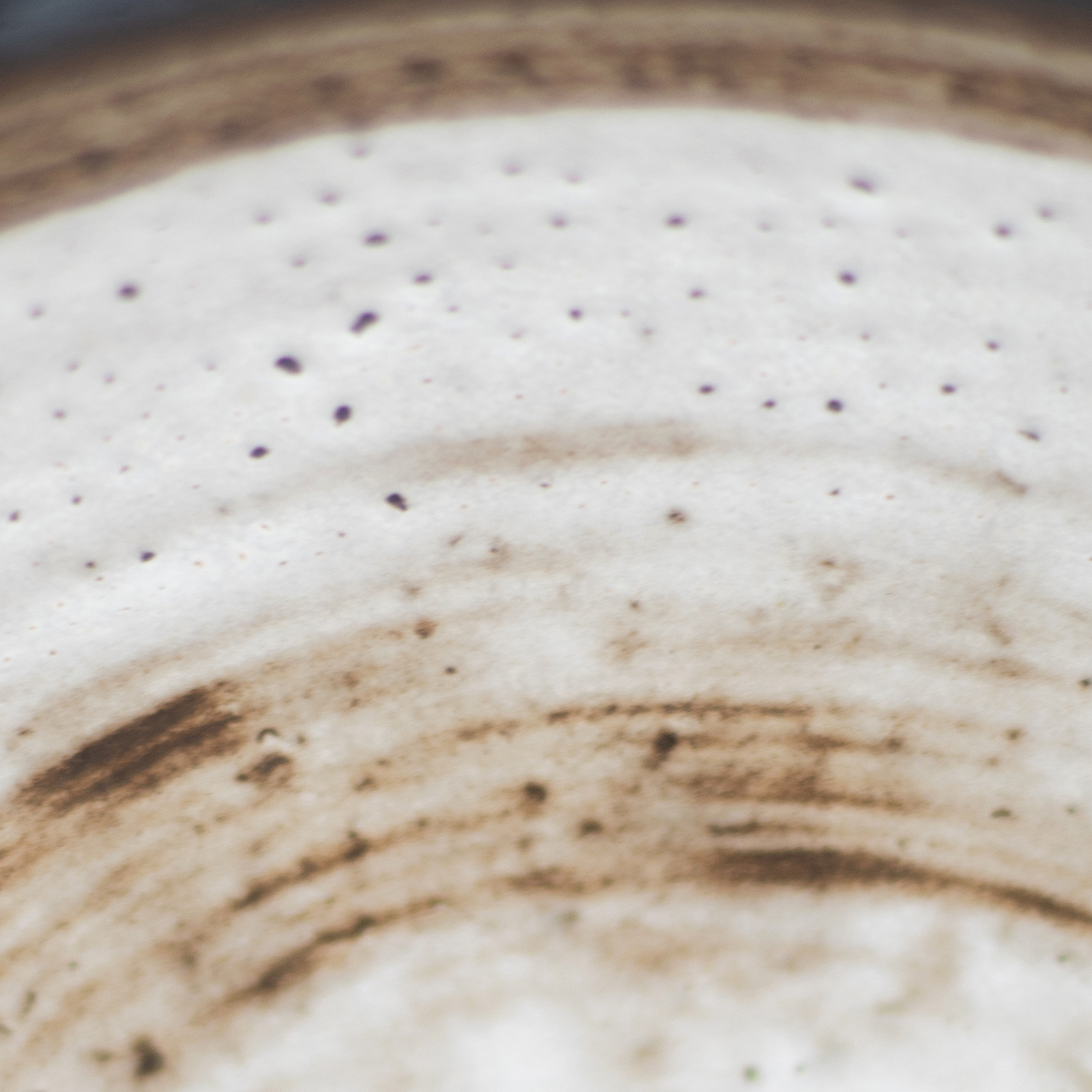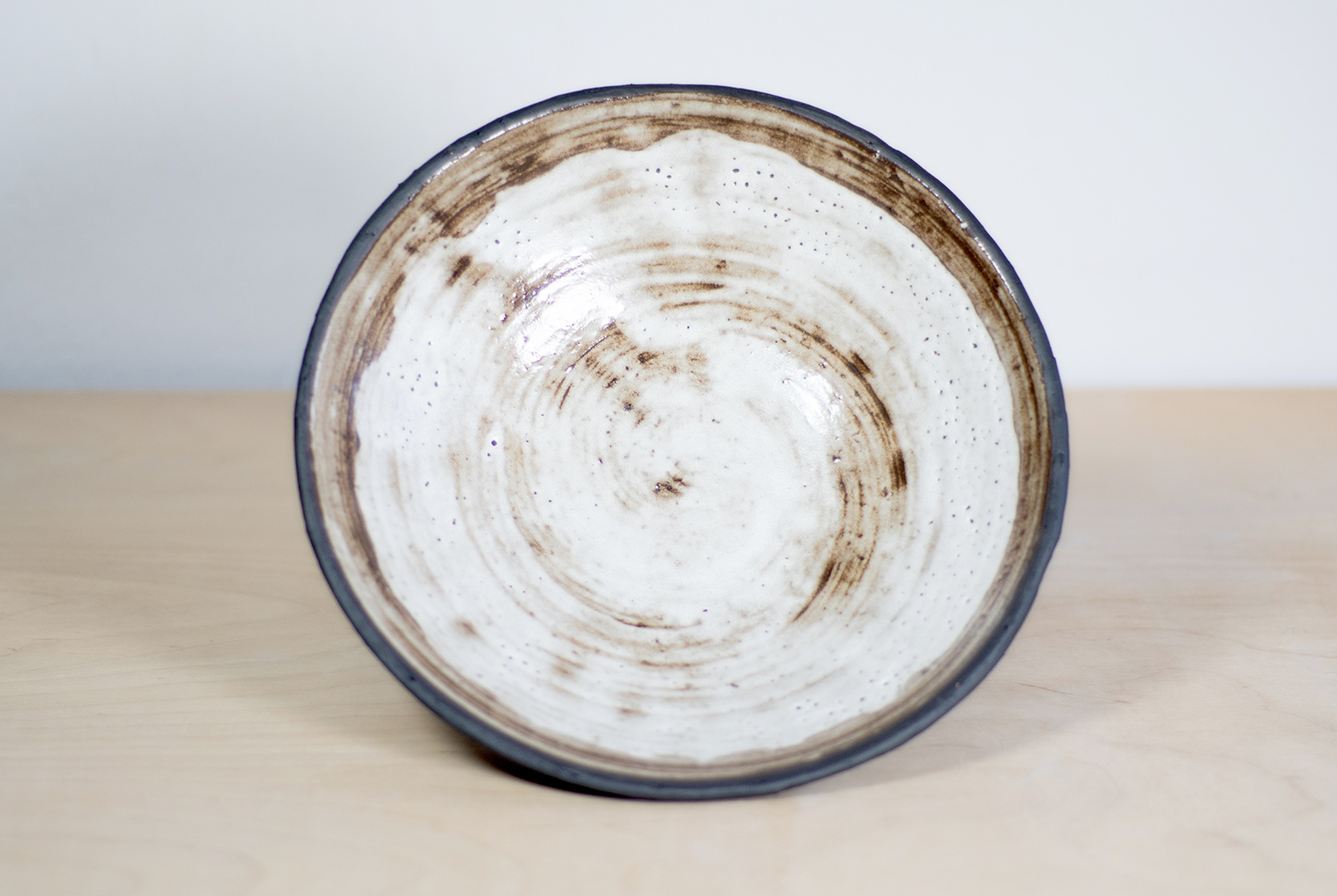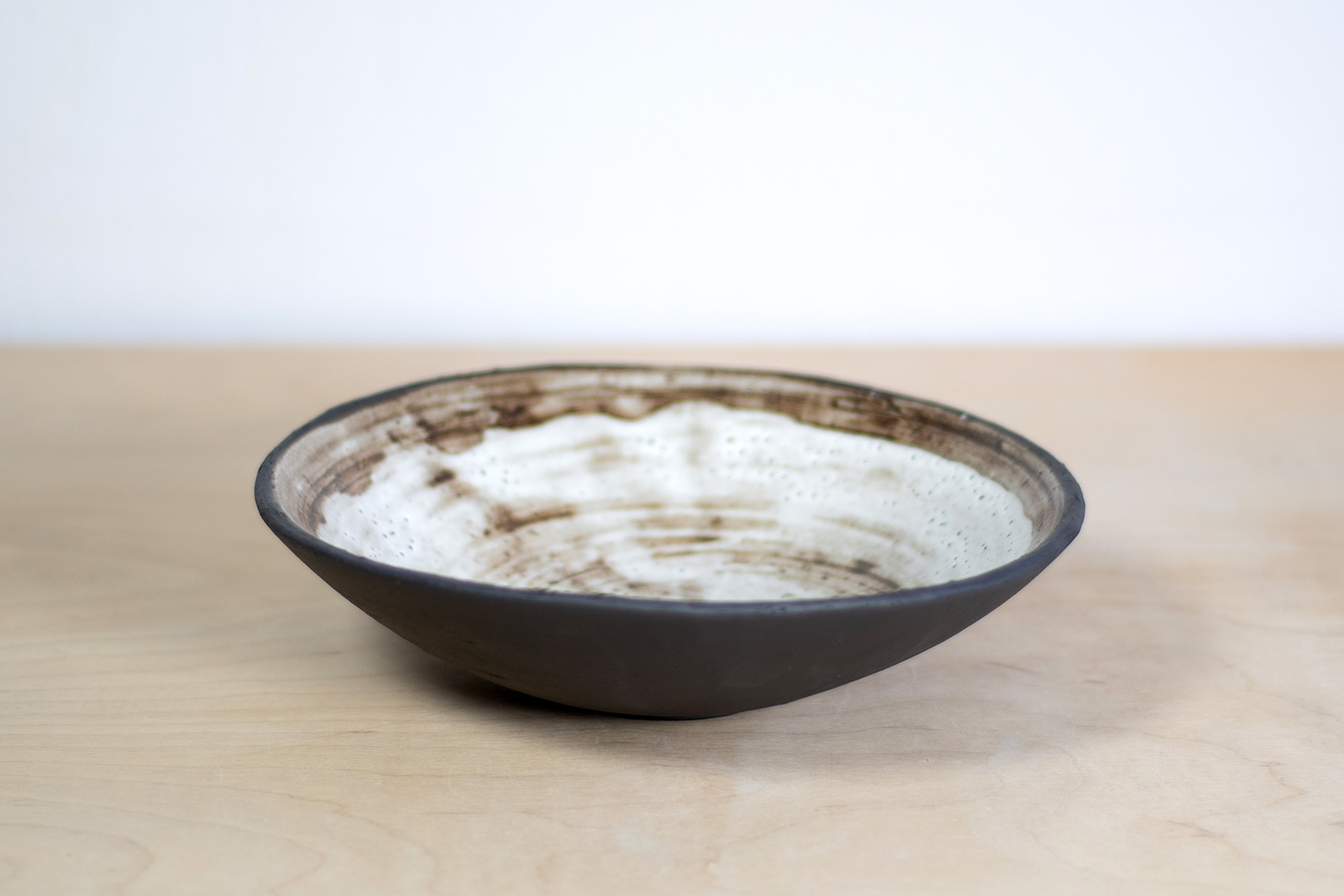 - Duża miska o prostej formie. W całości wykonana ręcznie z gliny o ciemnobrązowej barwie. Dekorowana tylko z frontowej strony satynowym białym szkliwem.