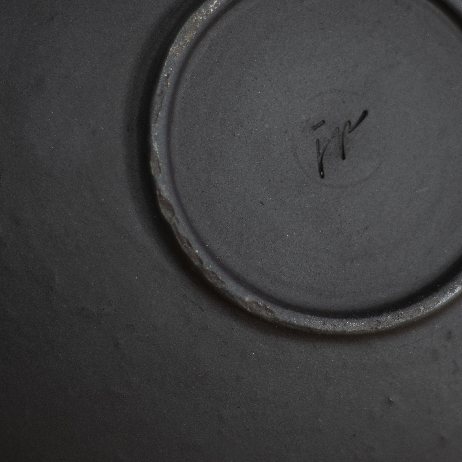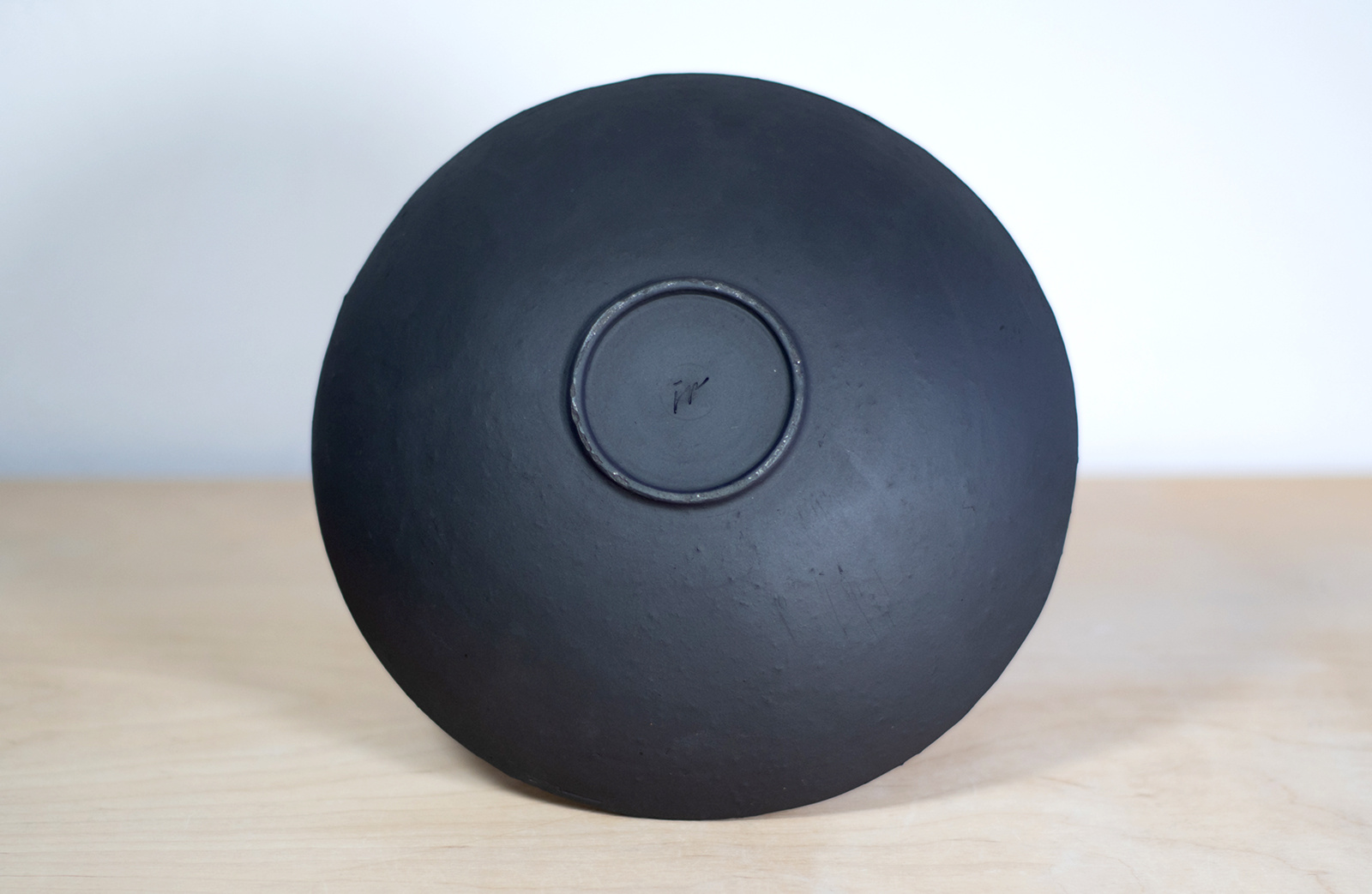 Wykonana w całości ręcznie z czarnej, chropowatej gliny. Szkliwiona tylko po zewnętrznej stronie, białym satynowym szkliwem. Stemplowana logo autorki.
