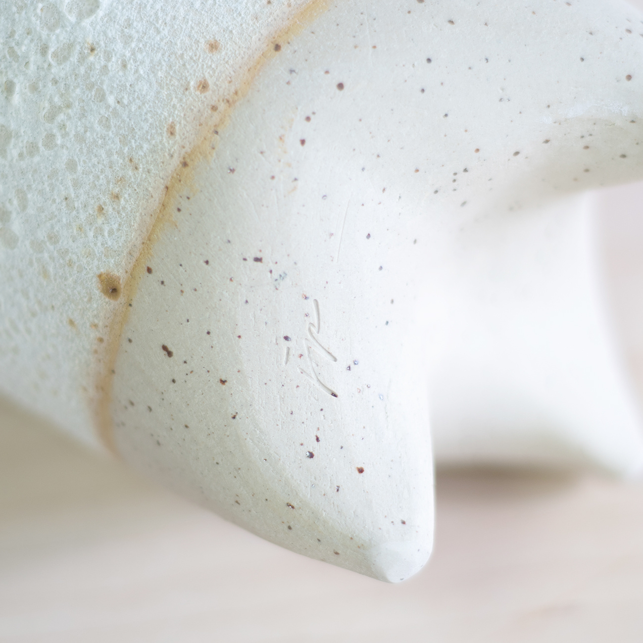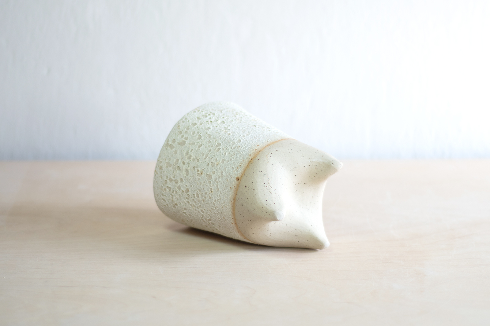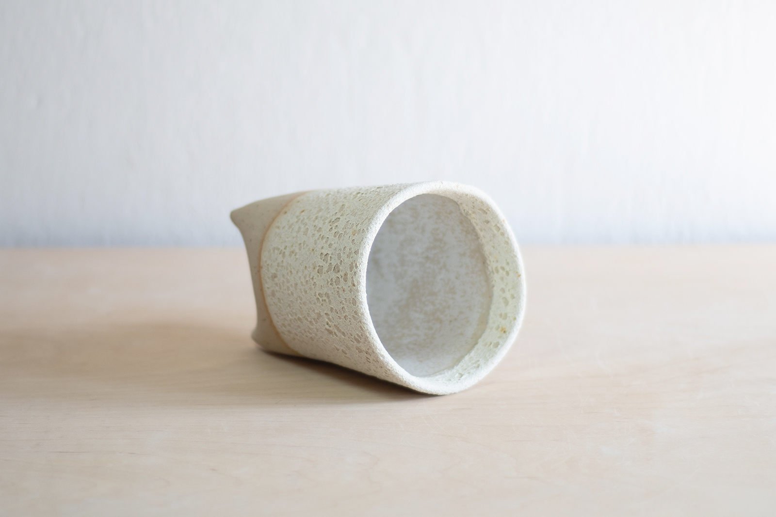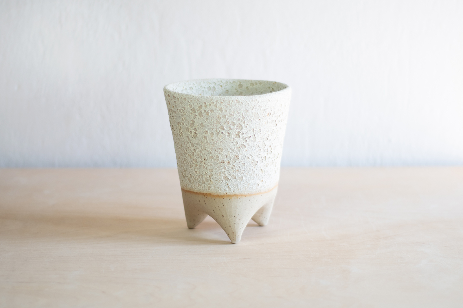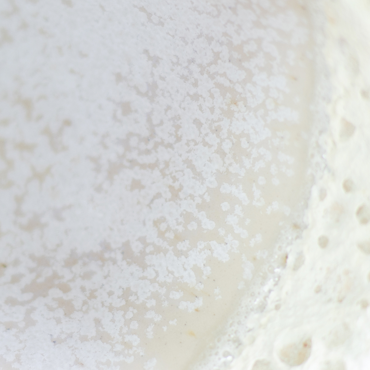 Wykonana w całości ręcznie. Stopki wykonane tradycyjną techniką ceramiczną. Pokryta wewnątrz białym, efektowym szkliwem. Na zewnątrz szkliwem o strukturze lawy. Stemplowana na spodzie logo autorki.
