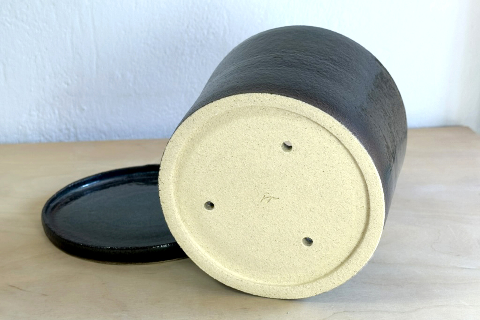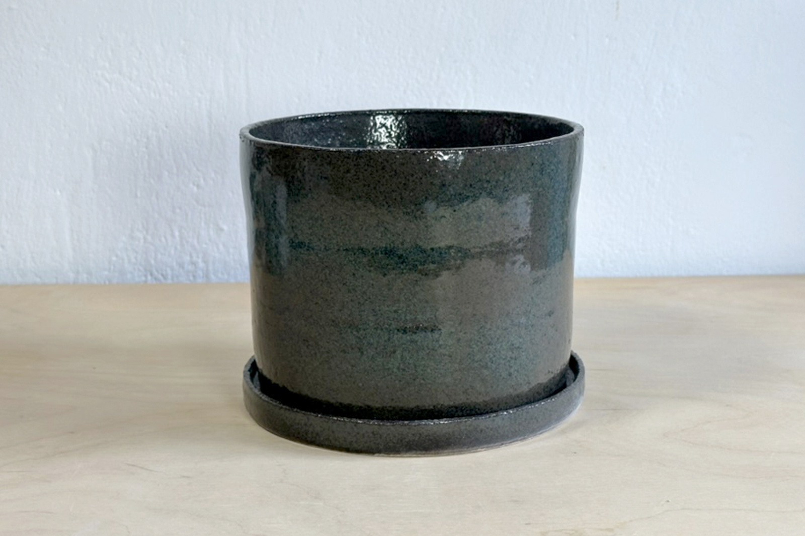 - Osłonka na kwiat doniczkowy. Wykonana na kole garncarskim z kremowej gliny. Pokryta w całości szkliwem w kolorze turkusowo-brązowym. Można włożyć do środka doniczkę.