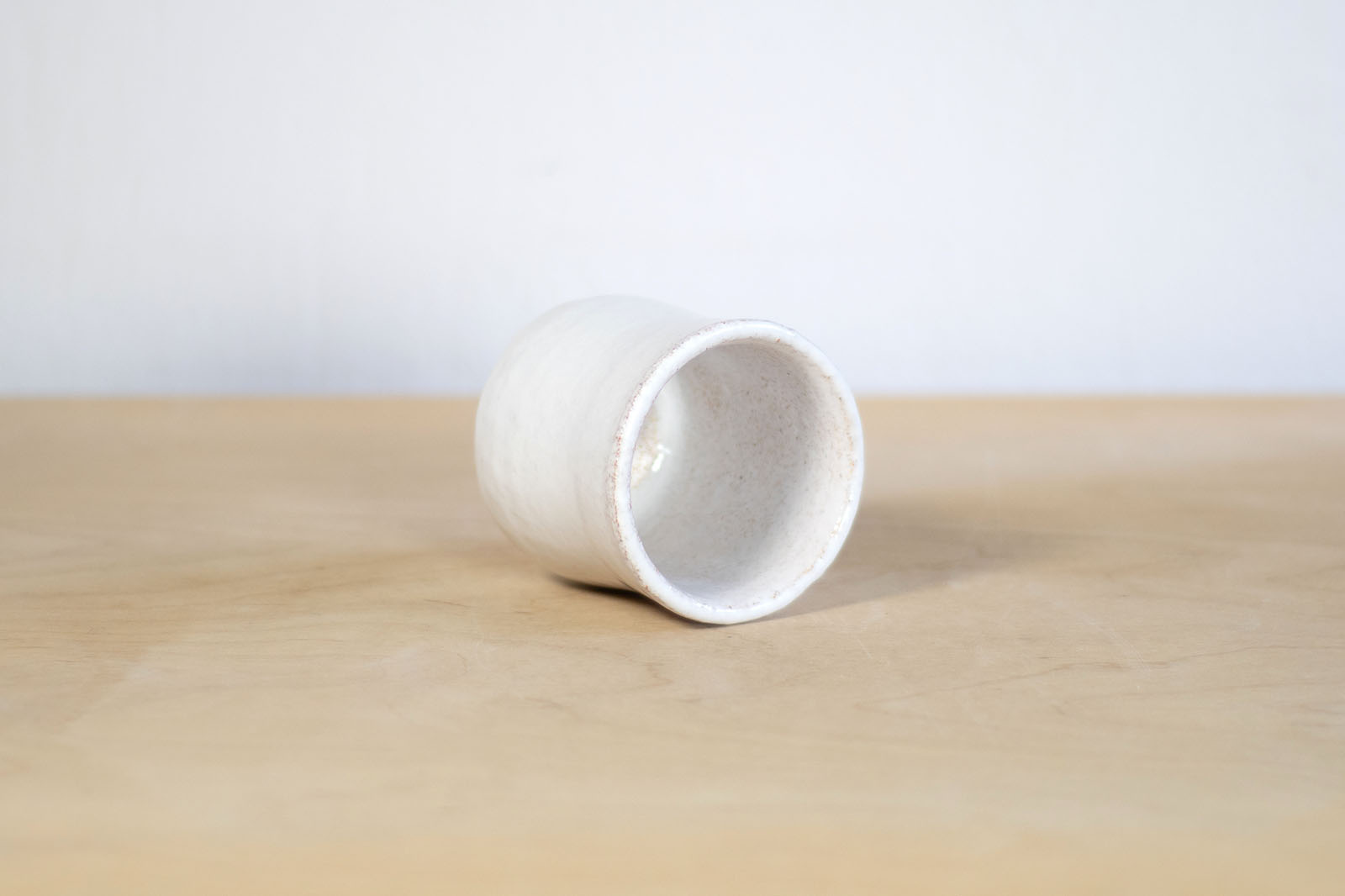 Wykonana na kole garncarskim z gliny o szorstkiej, piaszczystej powierzchni w kolorze kremowym. Szkliwiona w całości błyszczącym szkliwem w kolorze białym. Stopka wycięta ręcznie.