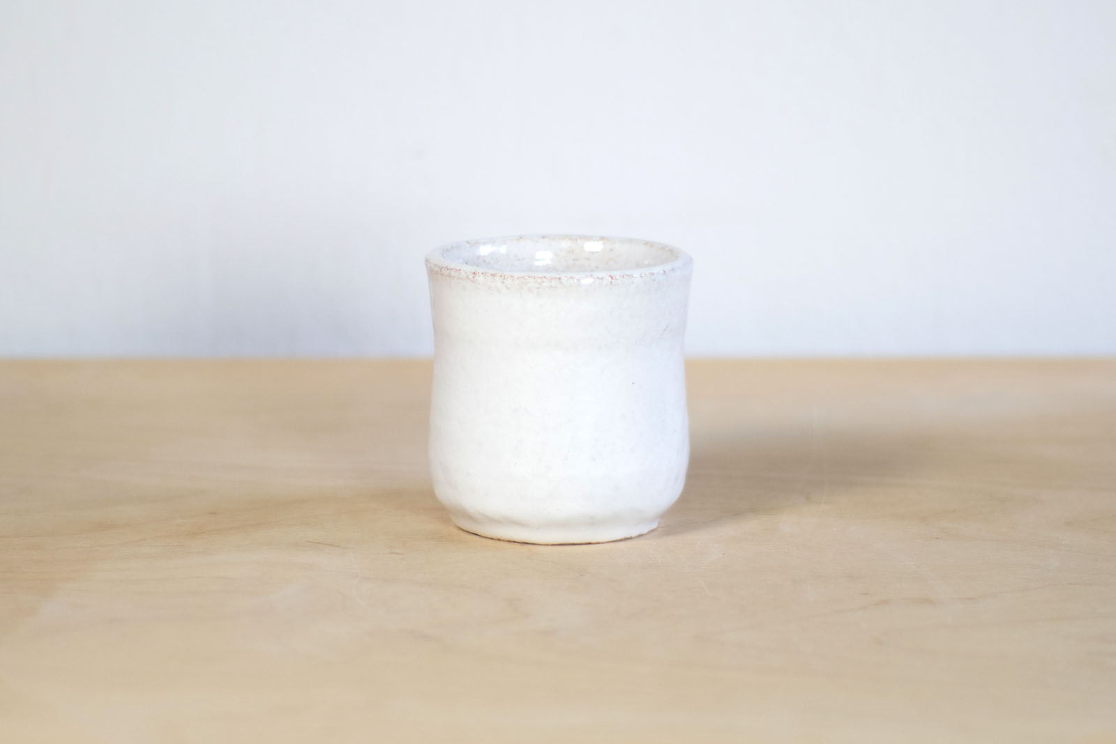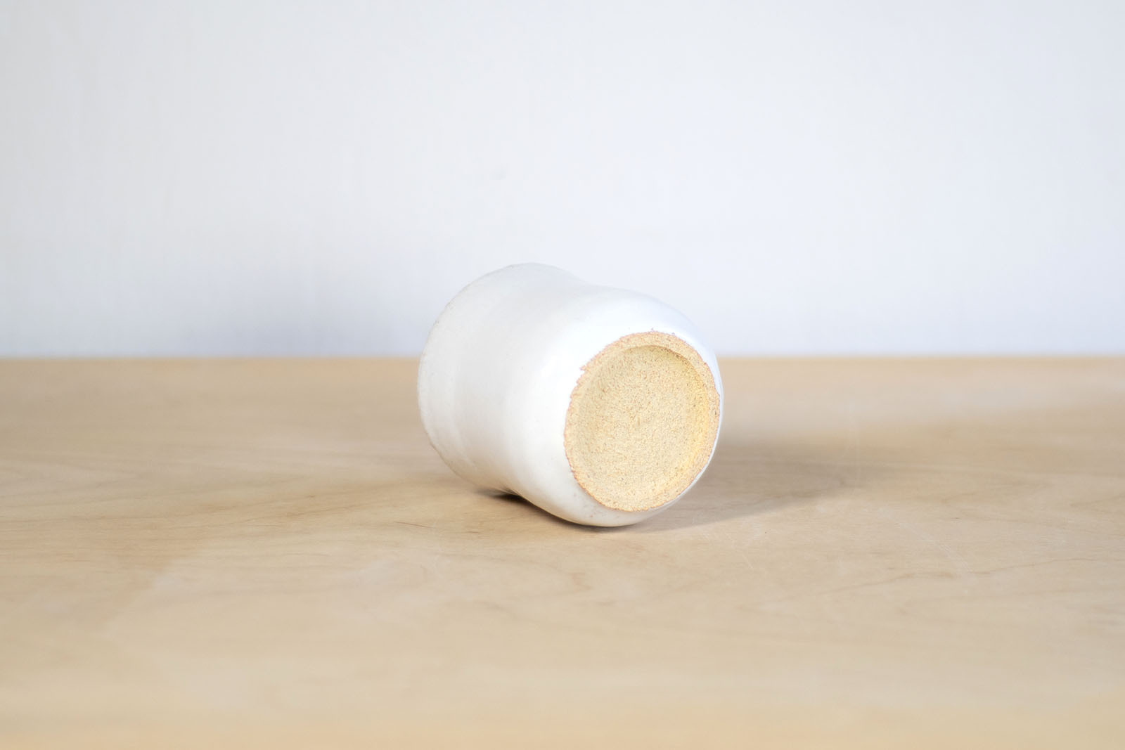 - Mała osłonka na kwiat doniczkowy. Wykonana na kole garncarskim z gliny o szorstkiej powierzchni w kolorze kremowym. Pokryta w całości białym, błyszczącym szkliwem.