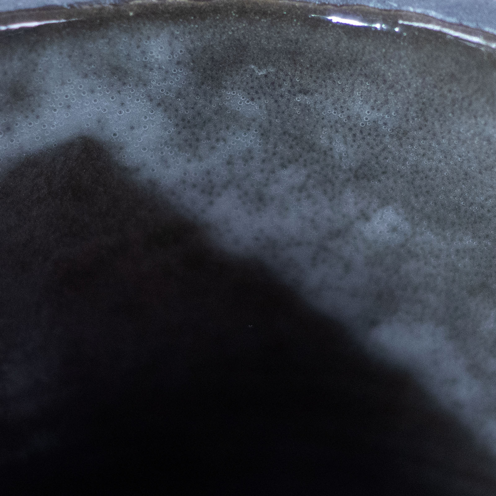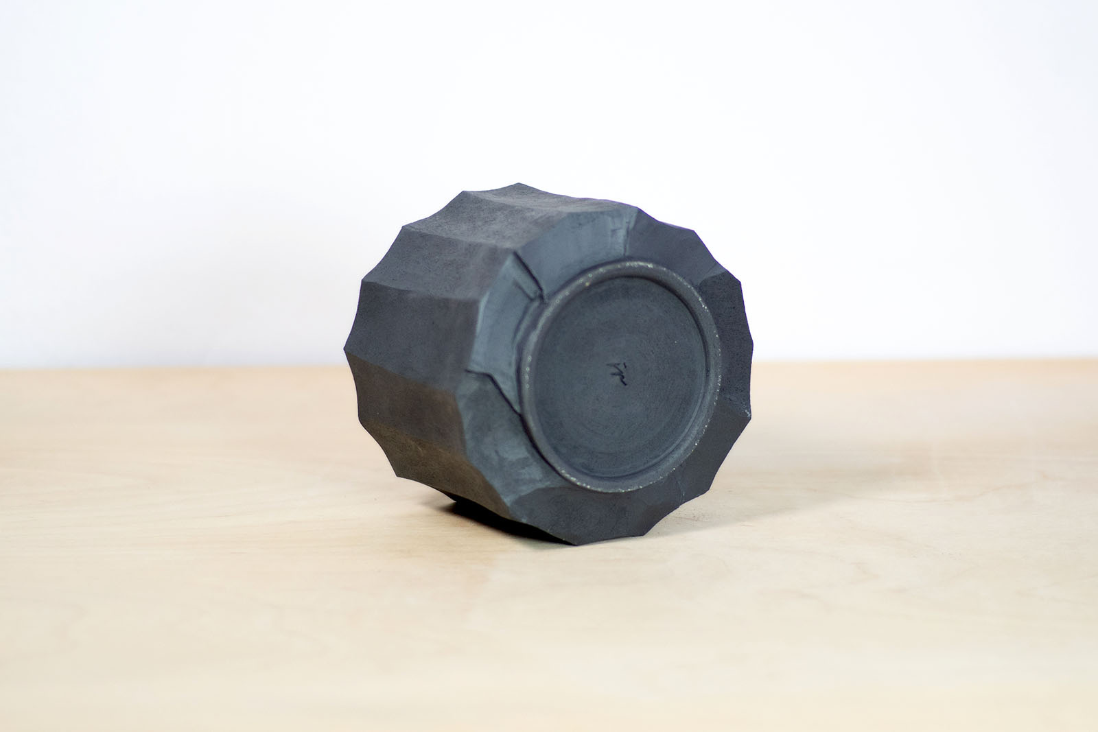 Wykonana na kole garncarskim z gliny o czarnej barwie. Faktura zewnętrzna wycięta ręcznie. Szkliwiona tylko wewnątrz białawym, błyszczącym szkliwem. Sygnowana stemplem z logo autorki.