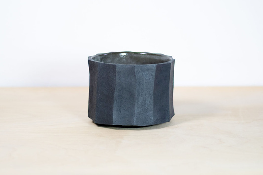 - Osłonka na kwiat doniczkowy. Wykonana na kole garncarskim z czarnej gliny. Faktura wycięta ręcznie. Pokryta wewnątrz białawym, błyszczącym szkliwem. Można włożyć doniczkę o średnicy 12 cm.