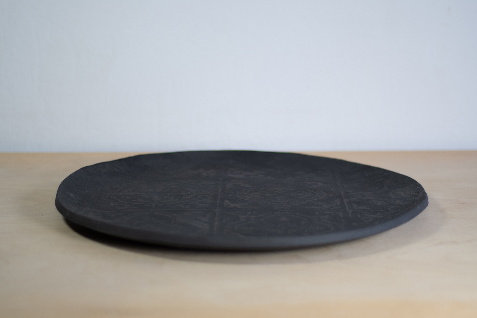 - Duża patera o średnicy powyżej 40 cm. W całości wykonana ręcznie z płata czarnej gliny o szorstkiej strukturze. Dekorowana reliefem z motywem antycznych kafli. Idealna na owoce do salonu.