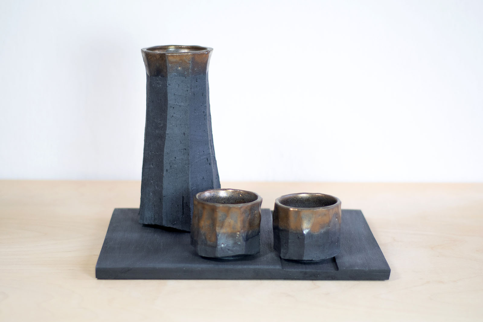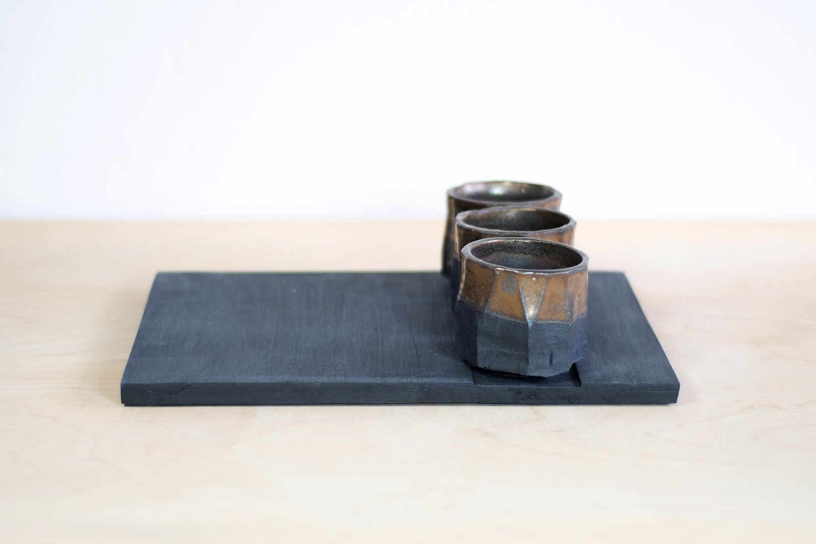 • Podstawka czarna na karafkę i trzy lub 4 czarki. Wykonana ręcznie z płata gliny. Faktura na powierzchni wykonana również ręcznie, poprzez szlifowanie podsuszonej formy. Idealna do serwowania herbaty lub napojów alkoholowych.