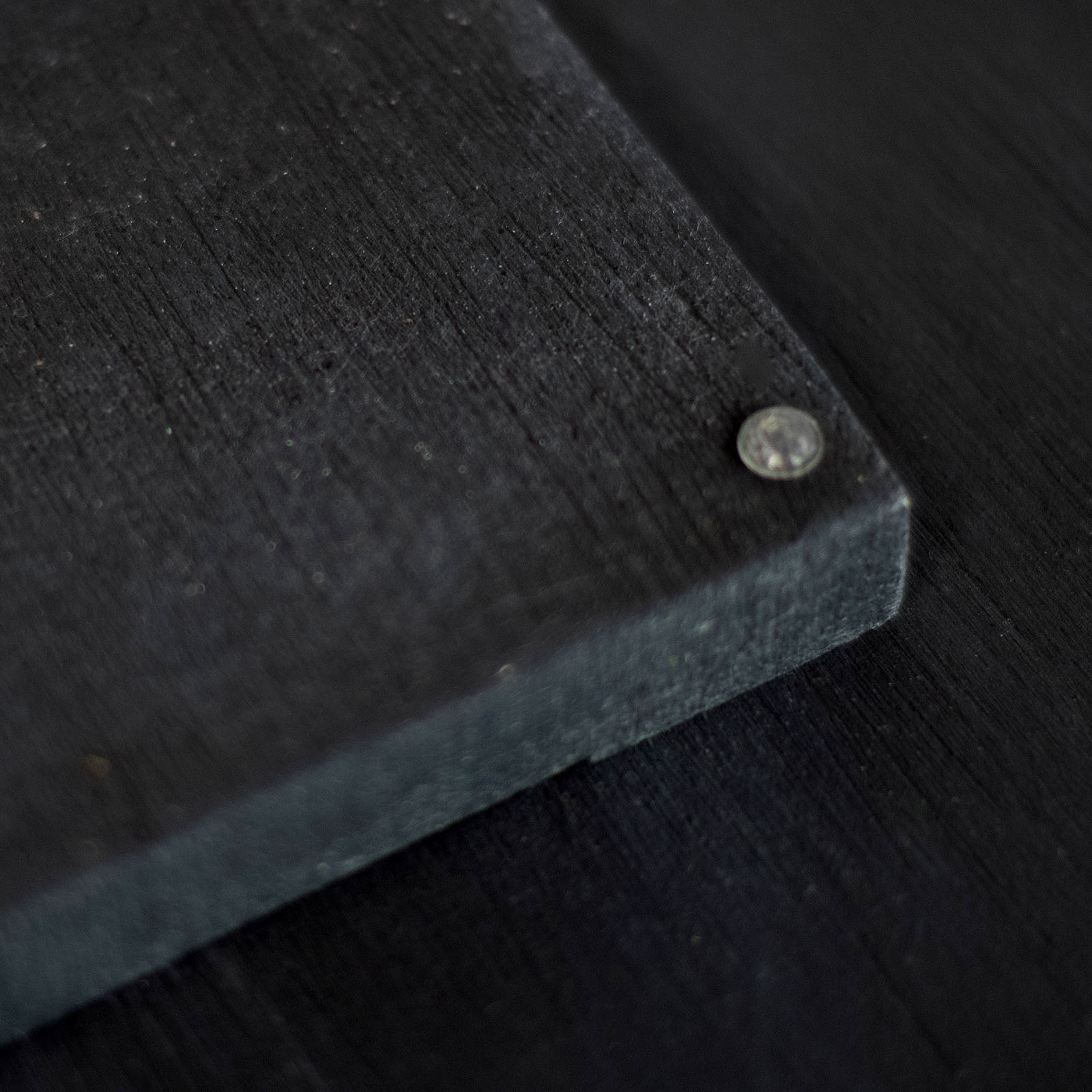 Wykonana ręcznie z gliny w kolorze czarnym. Faktura na powierzchni wykonana również ręcznie, poprzez szlifowanie podsuszonej formy. Nadaje się jako podstawka do kubeczków i filiżanek w różnych barwach. Podklejona gumowymi nóżkami.