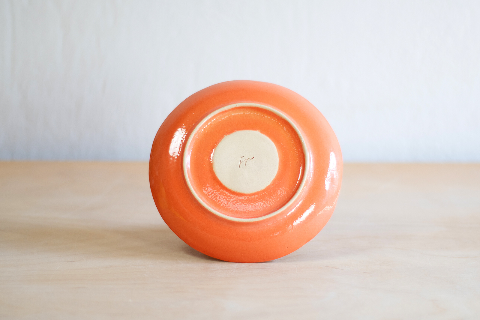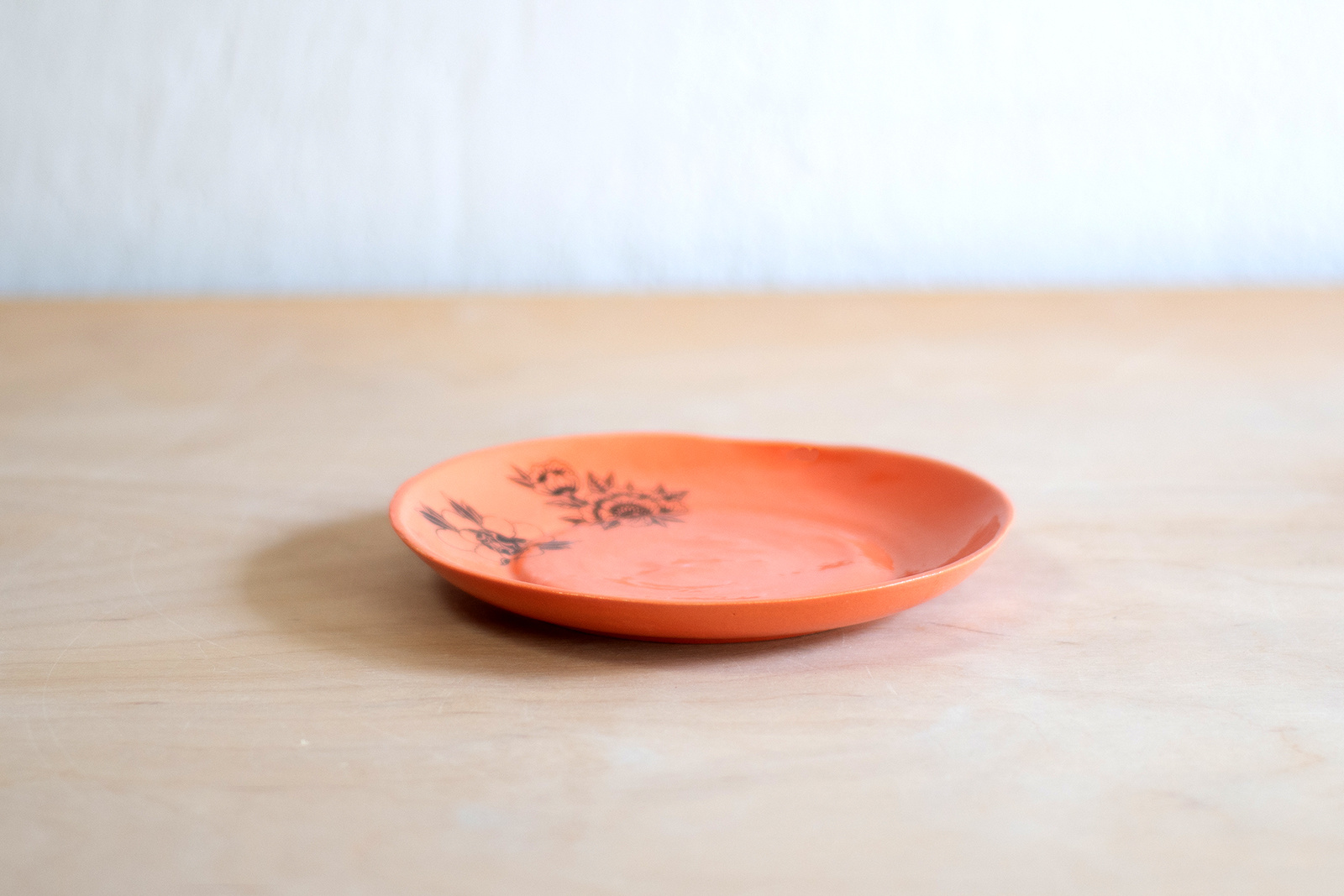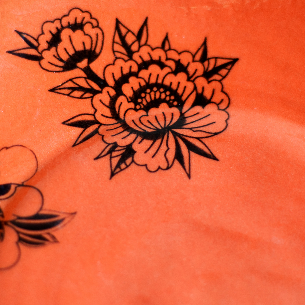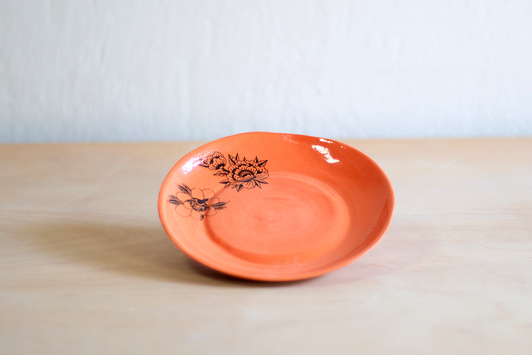 - Spodek do małej filiżanki. Wykonany ręcznie z masy lejnej na bazie autorskiej formy gipsowej. Masa w kolorze złamanej bieli, pokryta pomarańczową angobą oraz błyszczącym szkliwem. Dodatkowo dekorowana tatuażami w kwiaty.