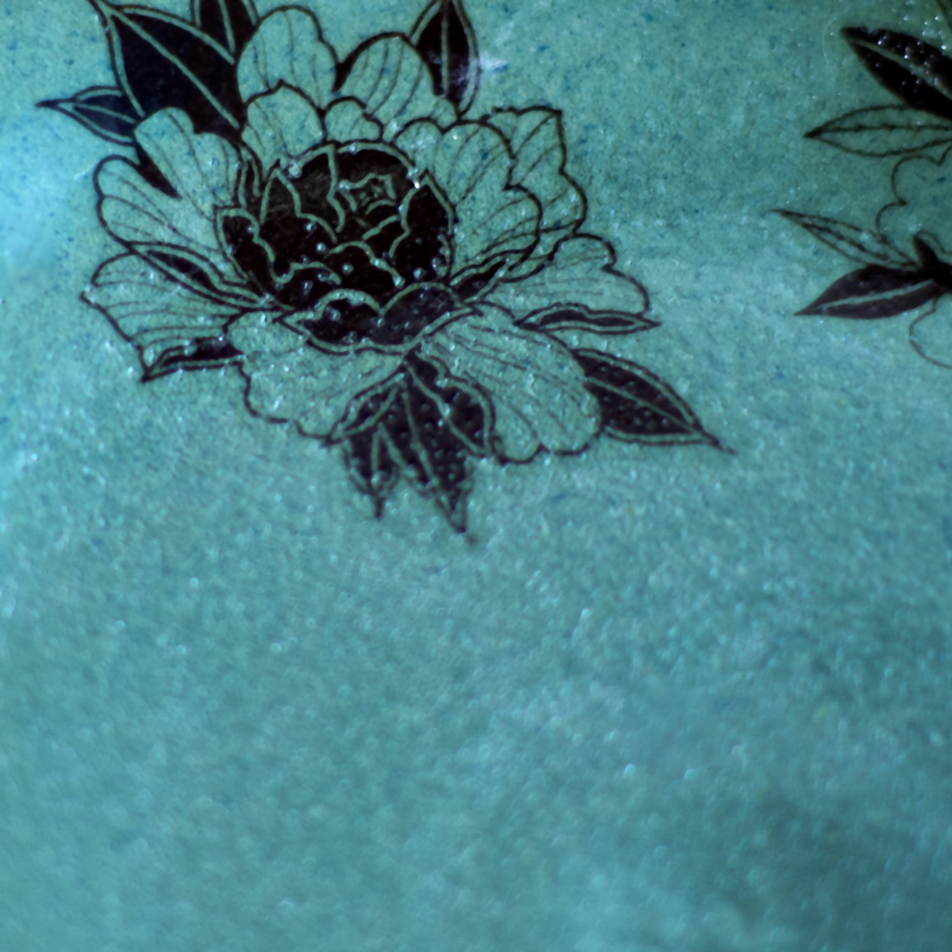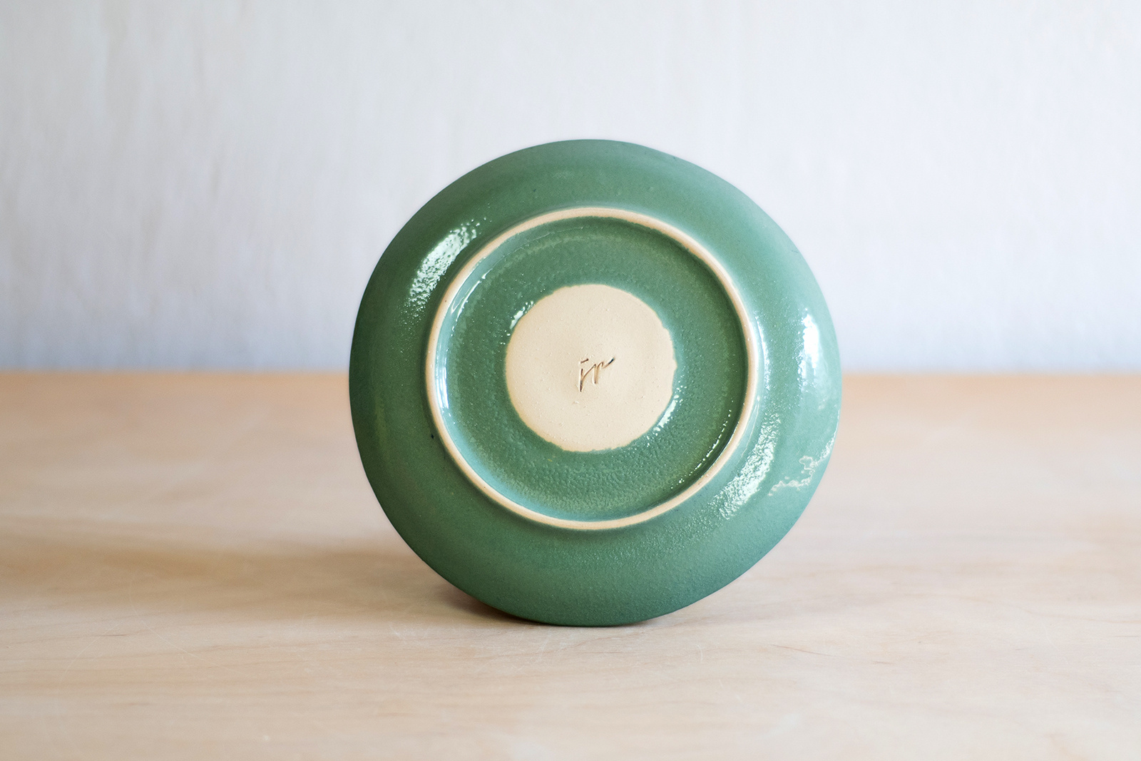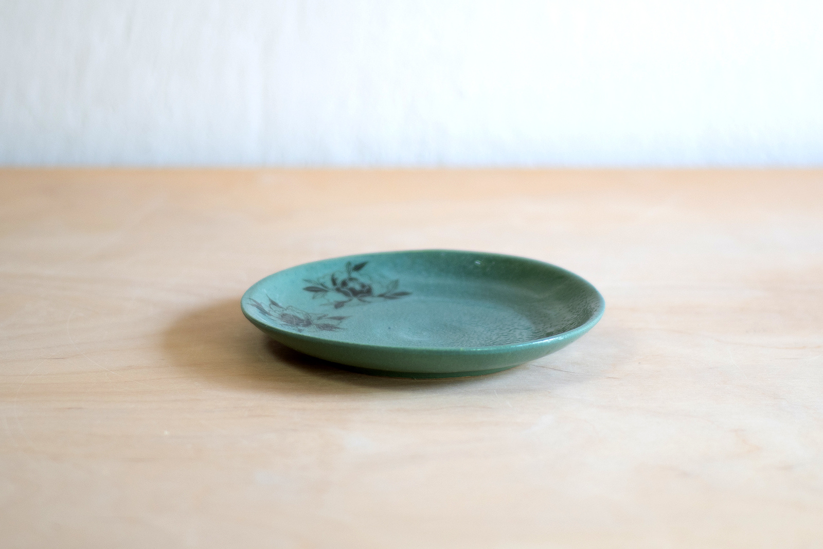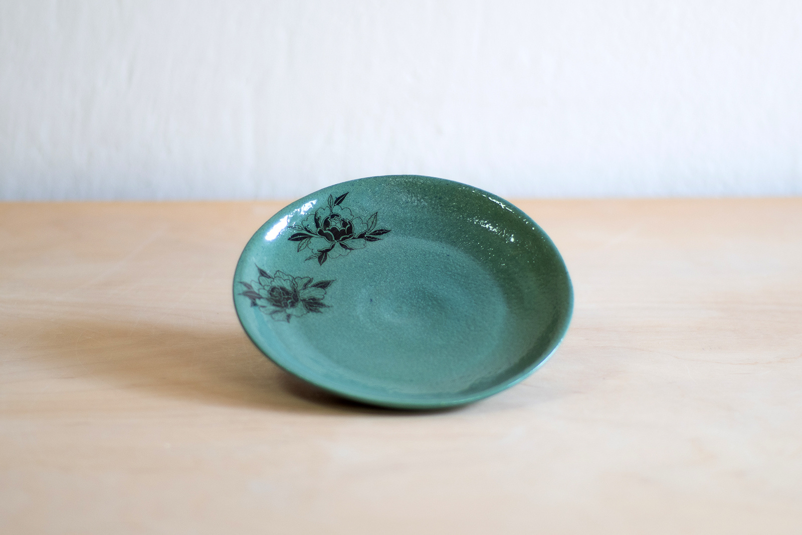 • Spodek do małej filiżanki. Wykonany ręcznie z masy lejnej na bazie autorskiej formy gipsowej. Masa w kolorze złamanej bieli, pokryta szmaragdową angobą oraz błyszczącym szkliwem. Dodatkowo dekorowana tatuażami w kwiaty.