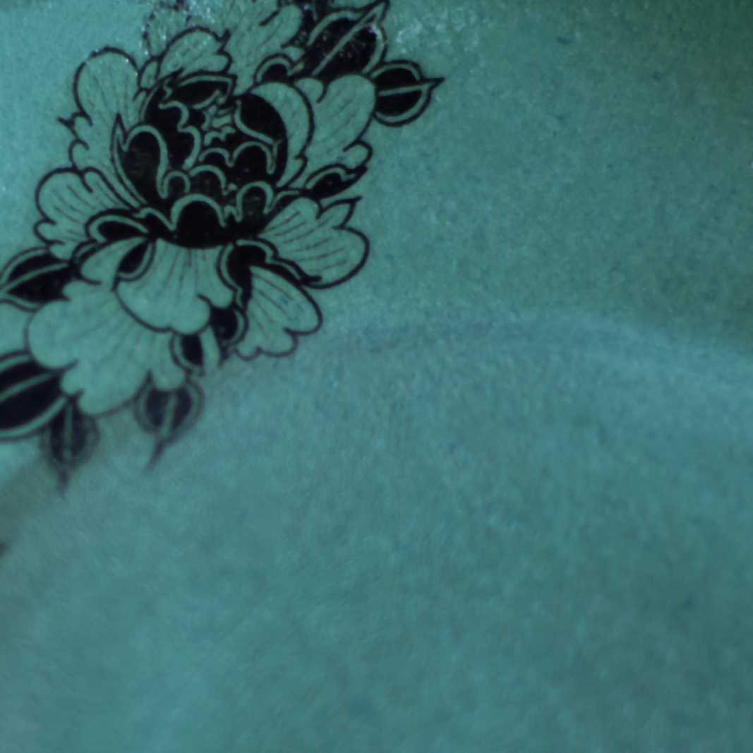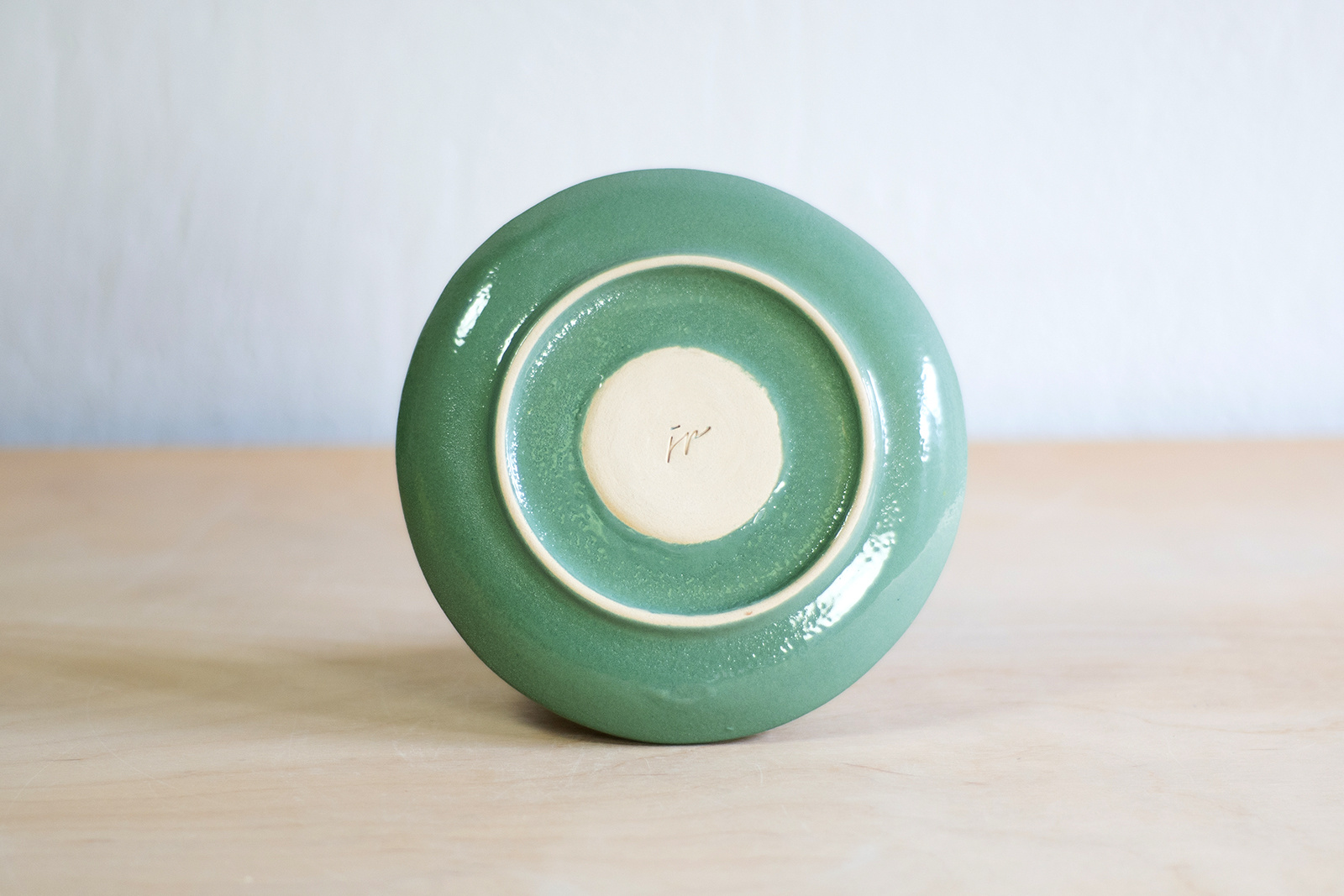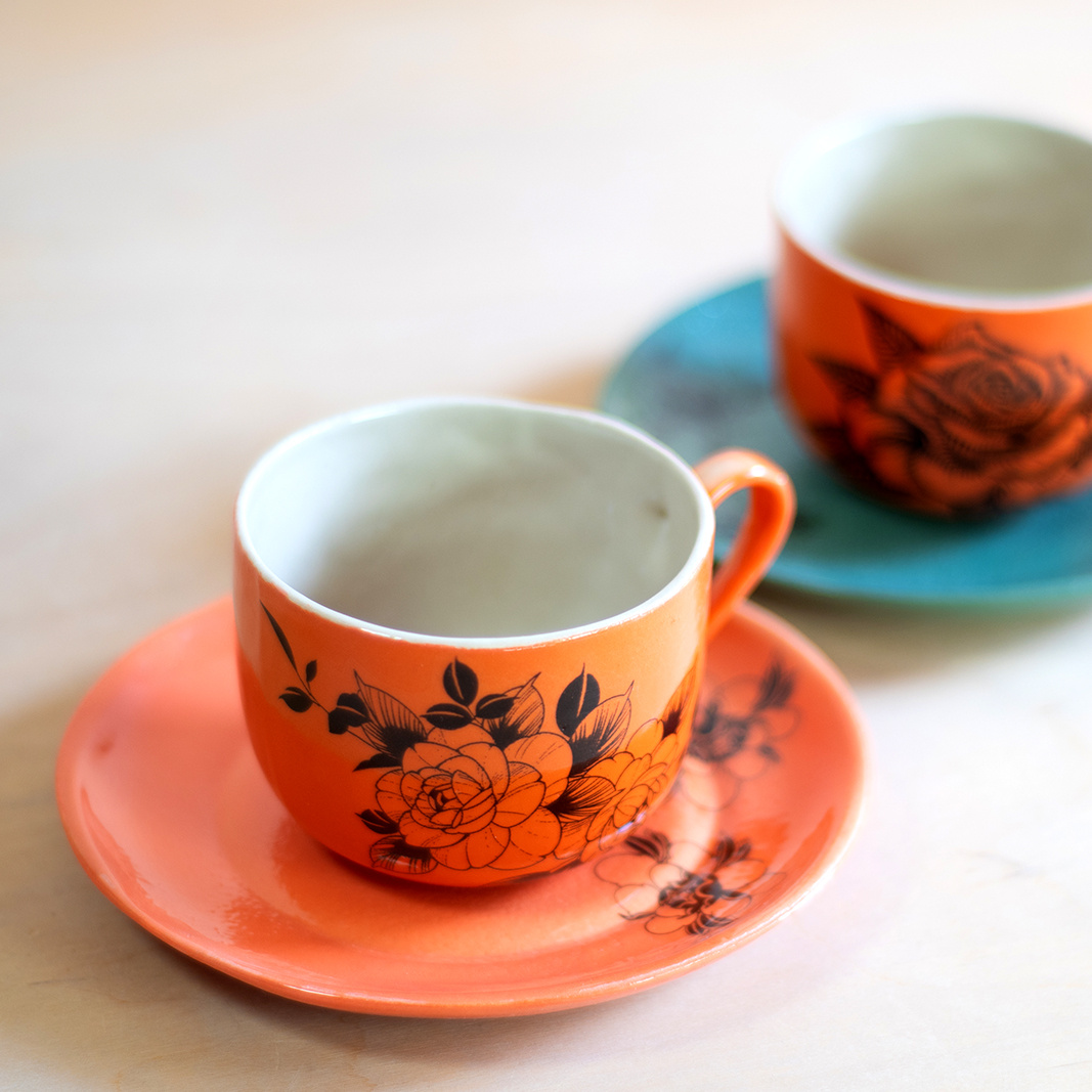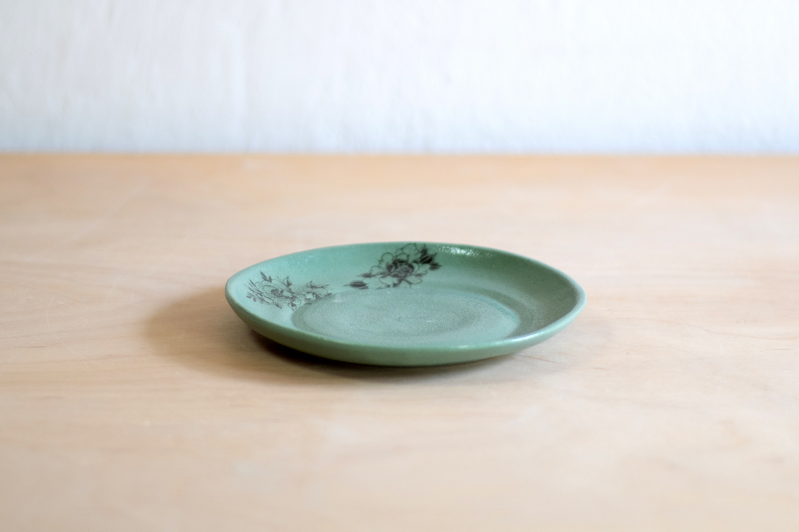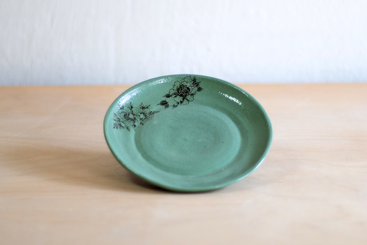 - Spodek do małej filiżanki. Wykonany ręcznie z masy lejnej na bazie autorskiej formy gipsowej. Masa w kolorze złamanej bieli, pokryta szmaragdową angobą oraz błyszczącym szkliwem. Dodatkowo dekorowana tatuażami w kwiaty.