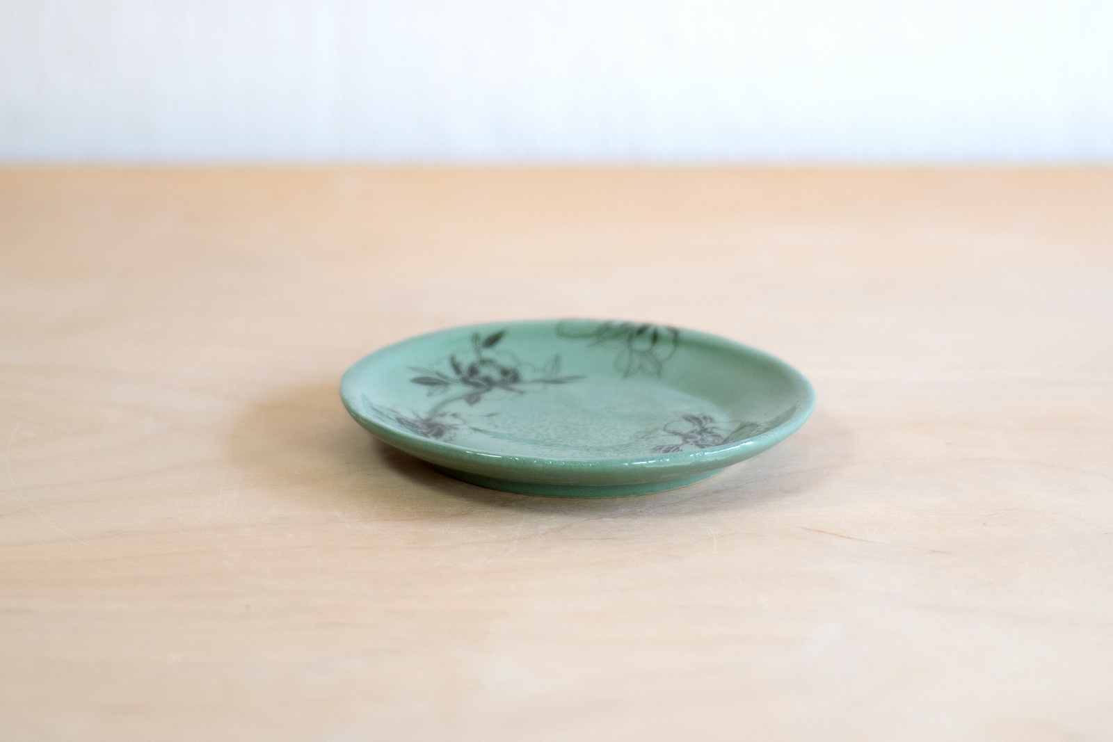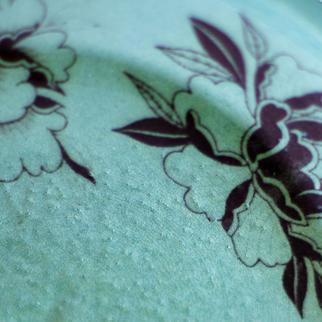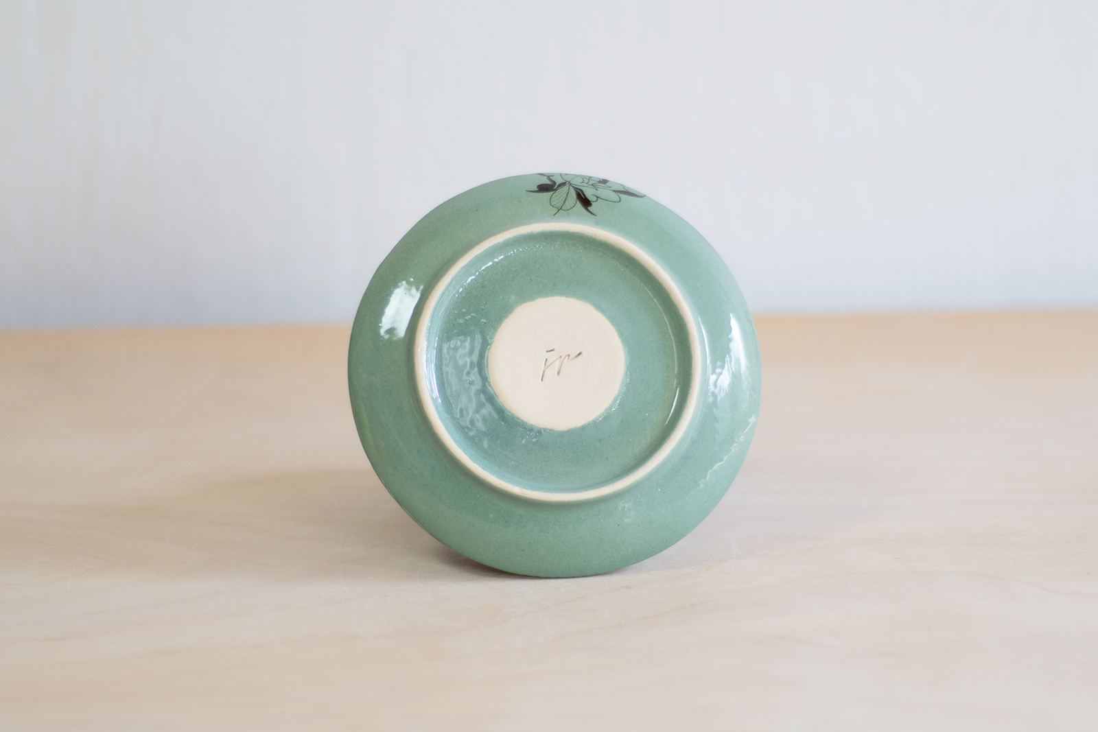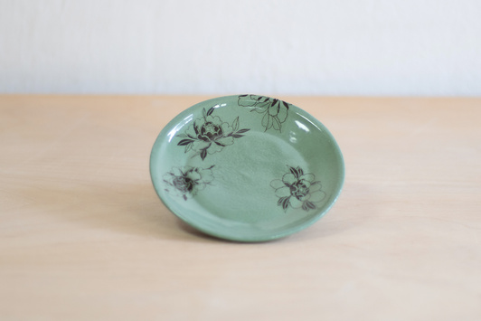 • Spodek do małej filiżanki. Wykonany ręcznie z masy lejnej na bazie autorskiej formy gipsowej. Masa w kolorze złamanej bieli, pokryta szmaragdową angobą oraz błyszczącym szkliwem. Dodatkowo dekorowana tatuażami w kwiaty.