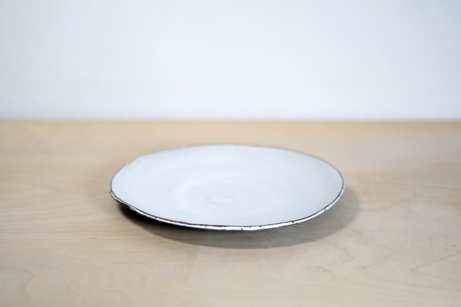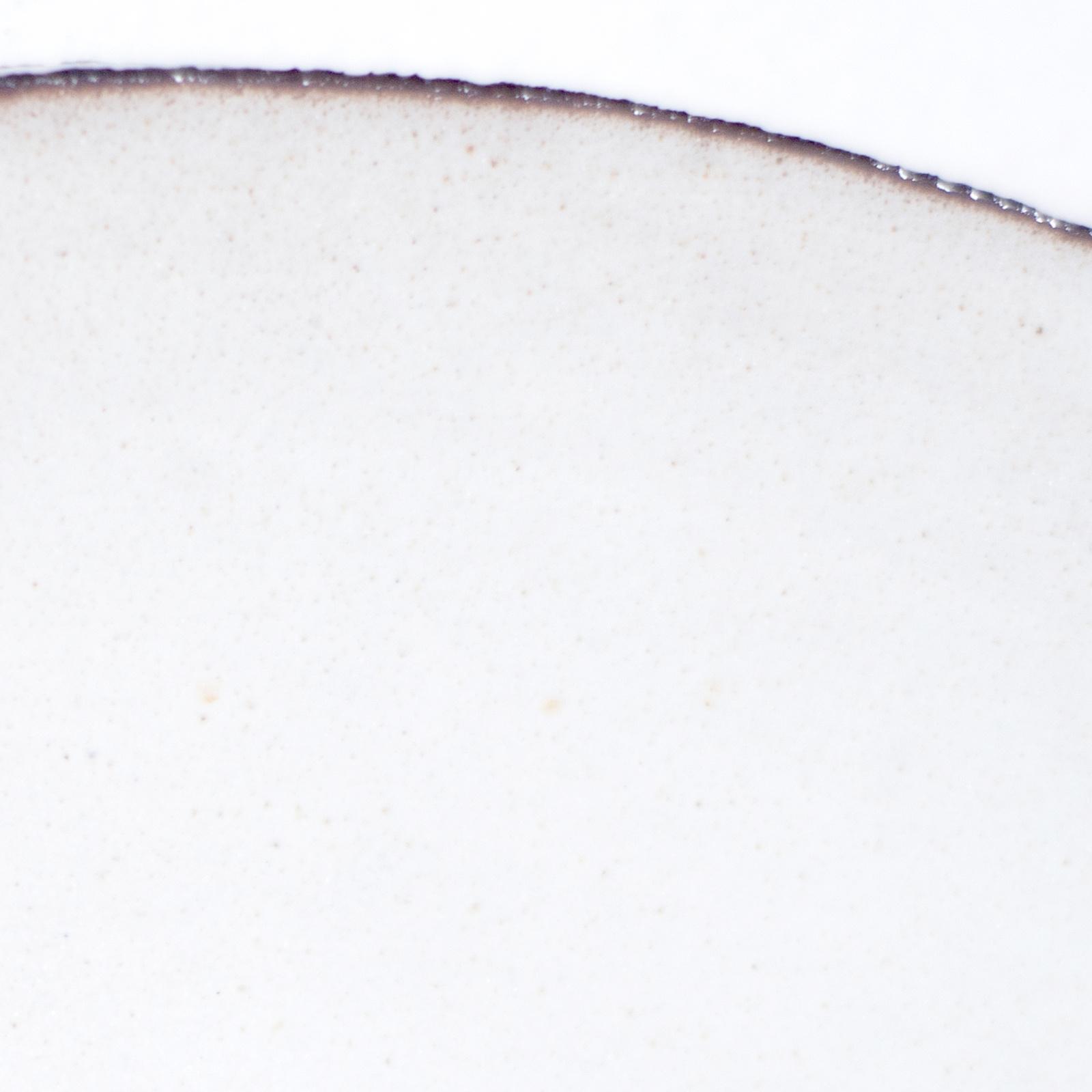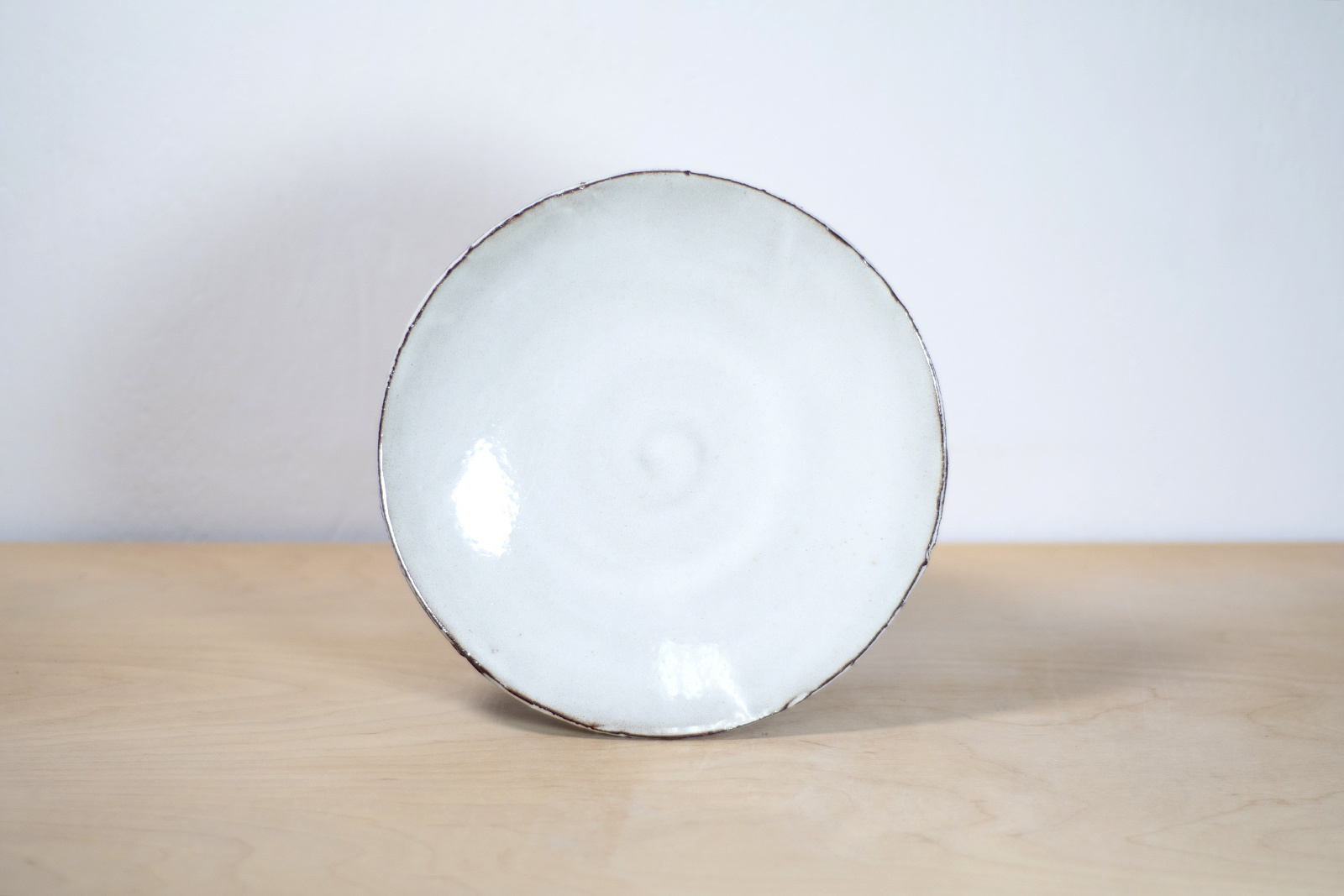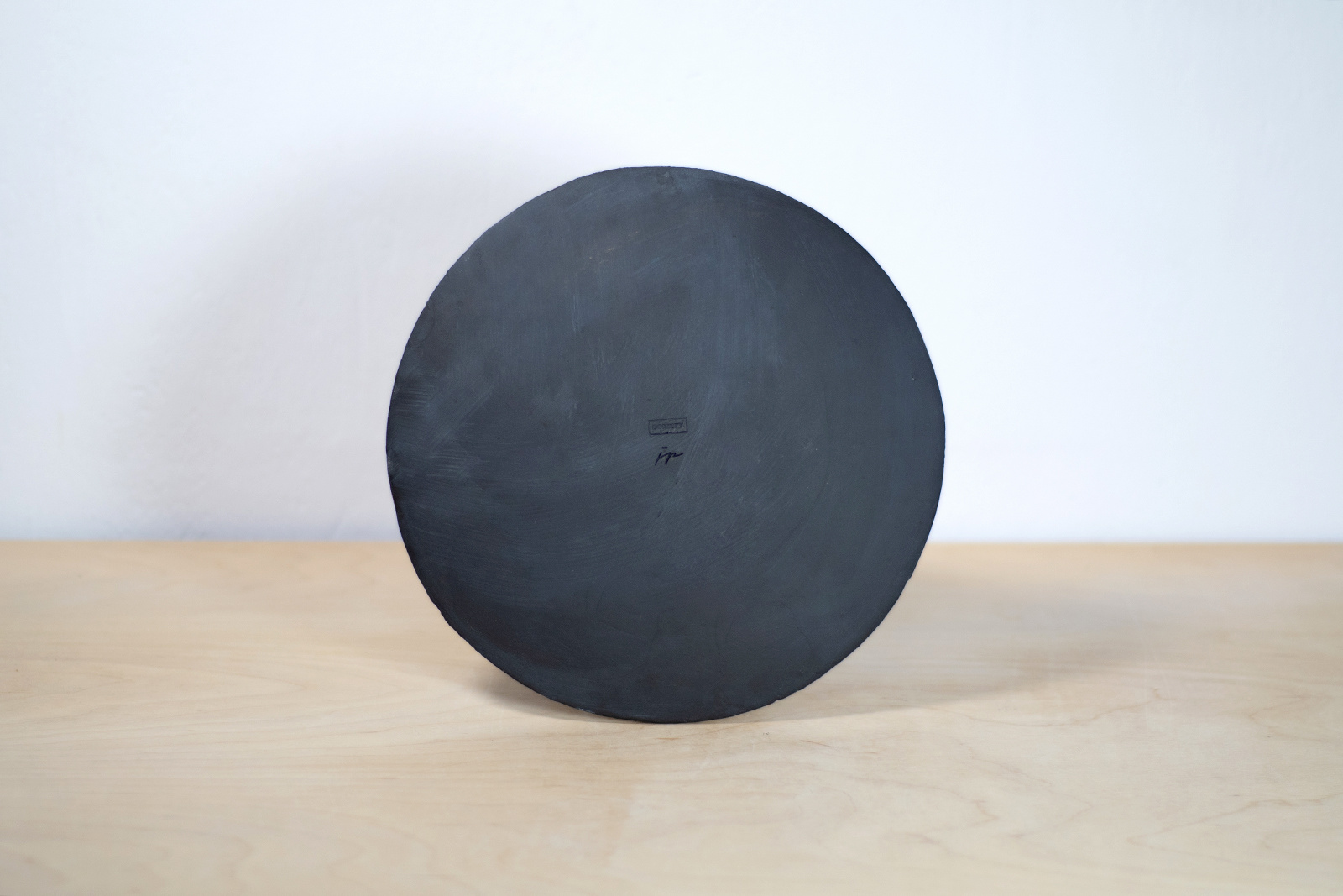 • Średniej wielkości talerz o prostej, nieco wypukłej formie. W całości wykonany ręcznie z czarnej, chropowatej gliny. Szkliwiony tylko po zewnętrznej stronie błyszczącym, białym szkliwem.